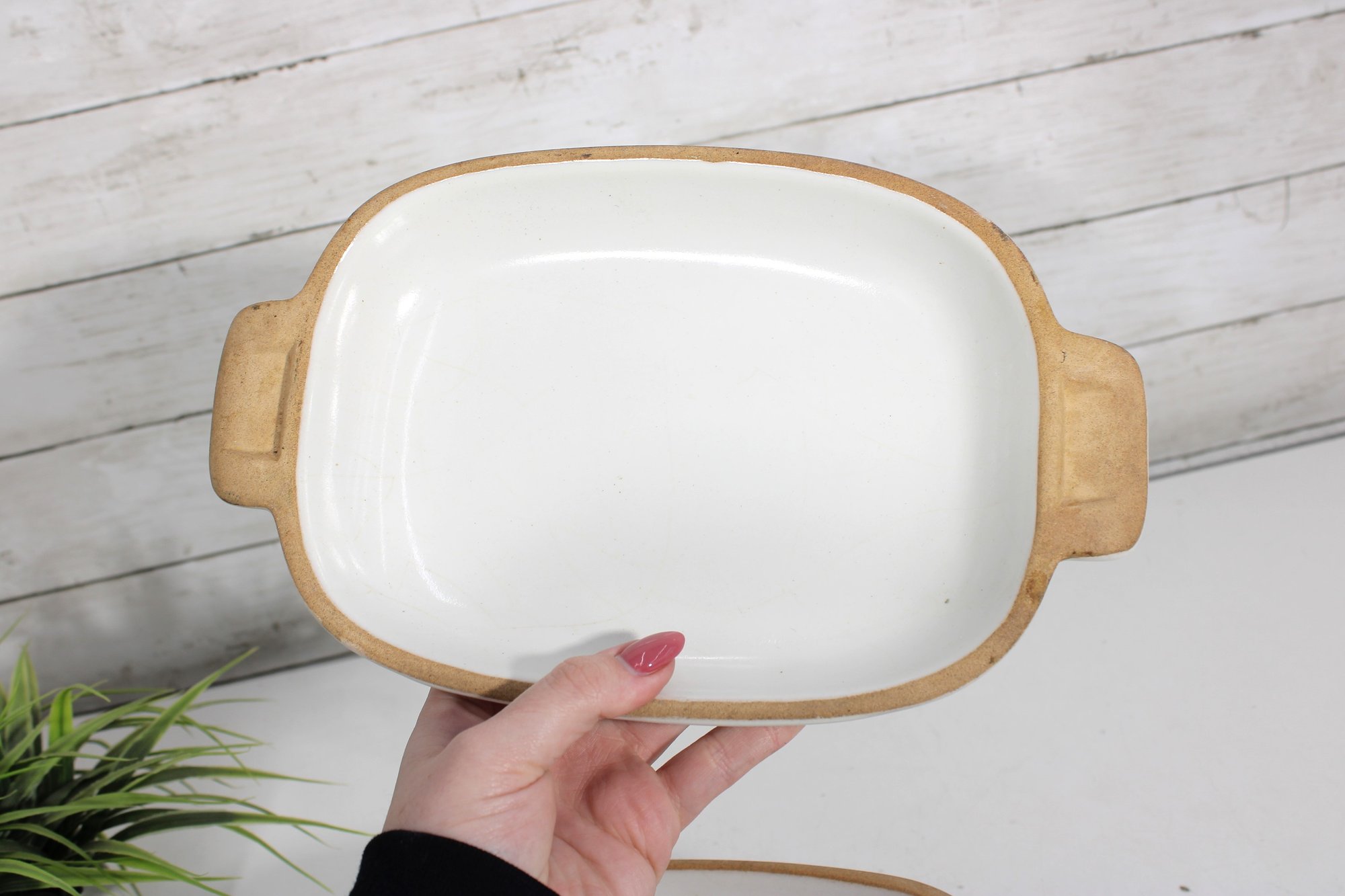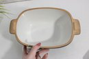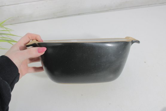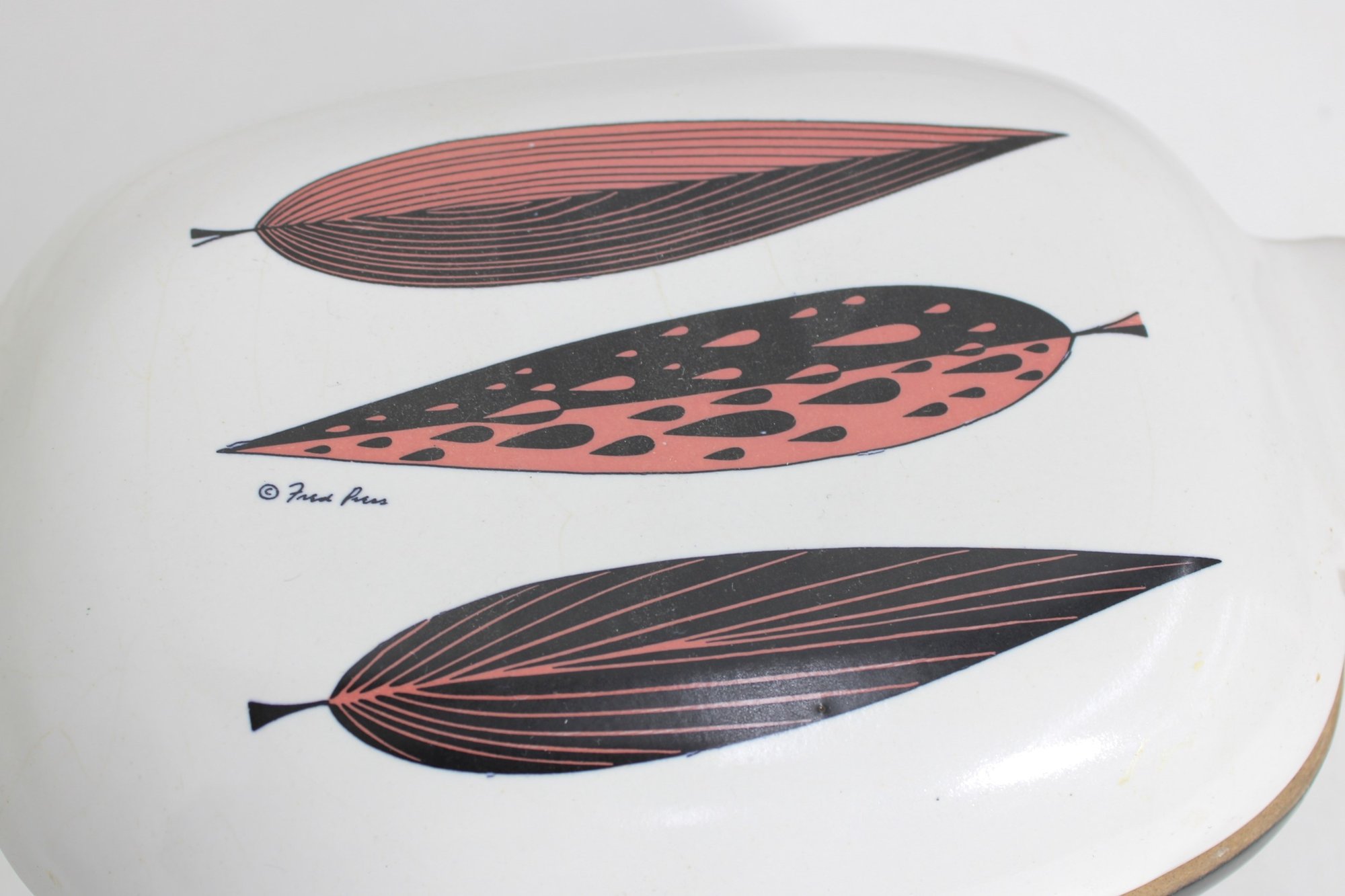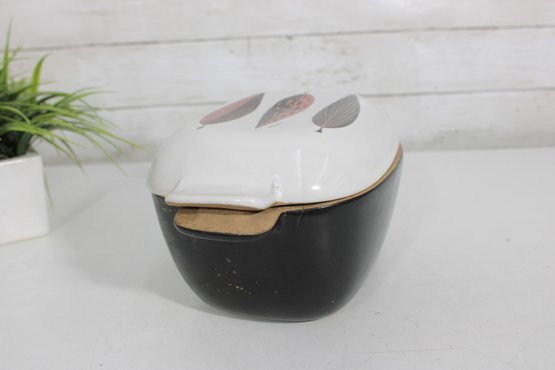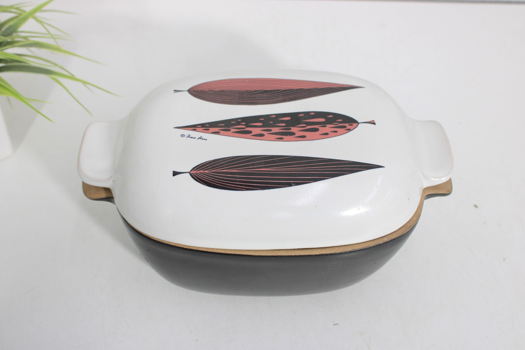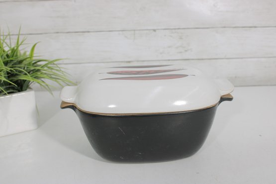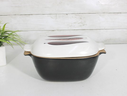 a classic Mid-Century Modern Glidden Pottery lidded casserole dish, featuring a beautifully stylized leaf motif in earthy tones of brown, rust, and black on a creamy white lid. The clean lines and organic design reflect the timeless MCM aesthetic often associated with Eva Zeisel–influenced forms.