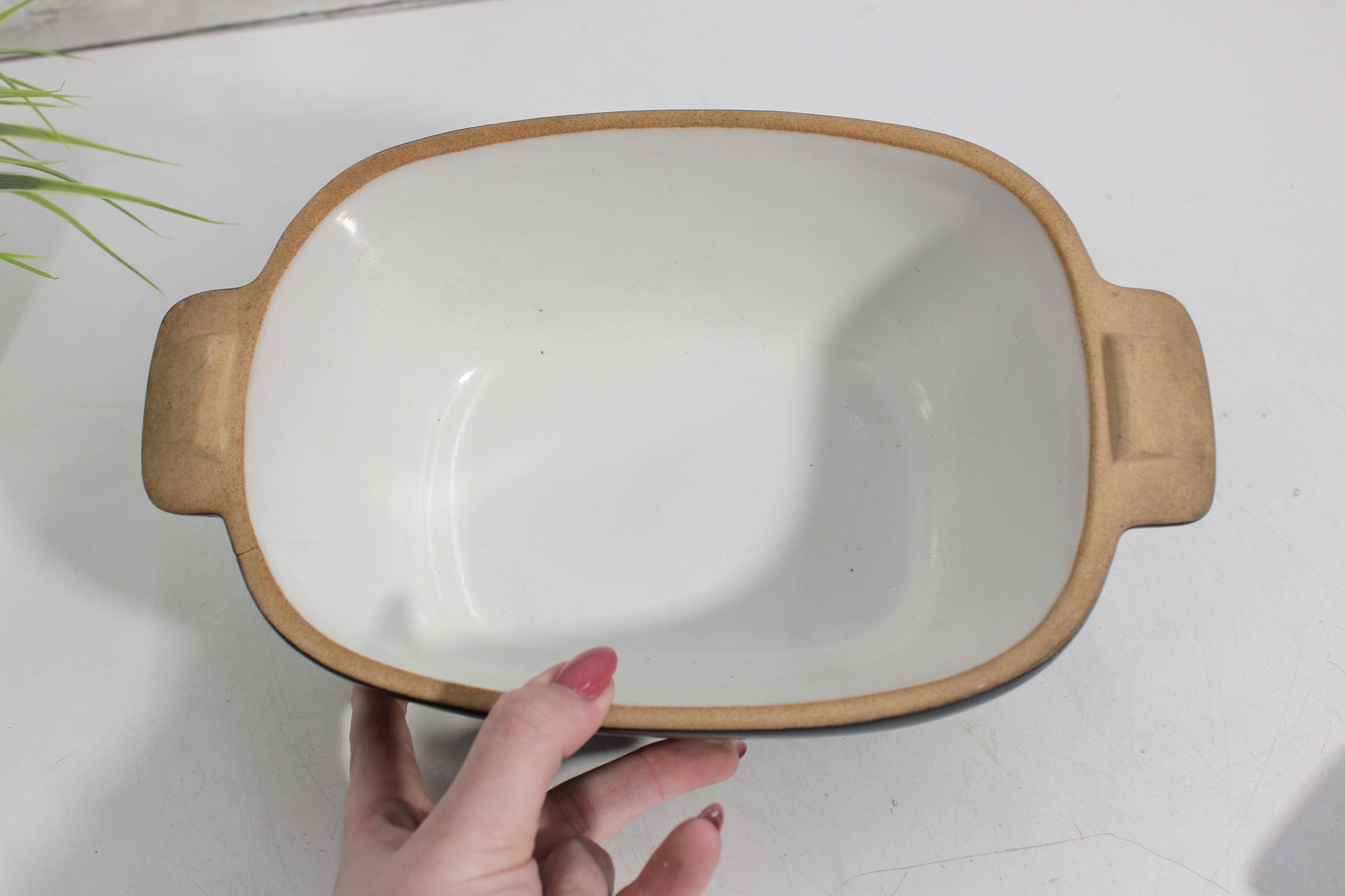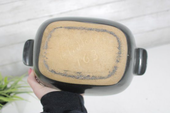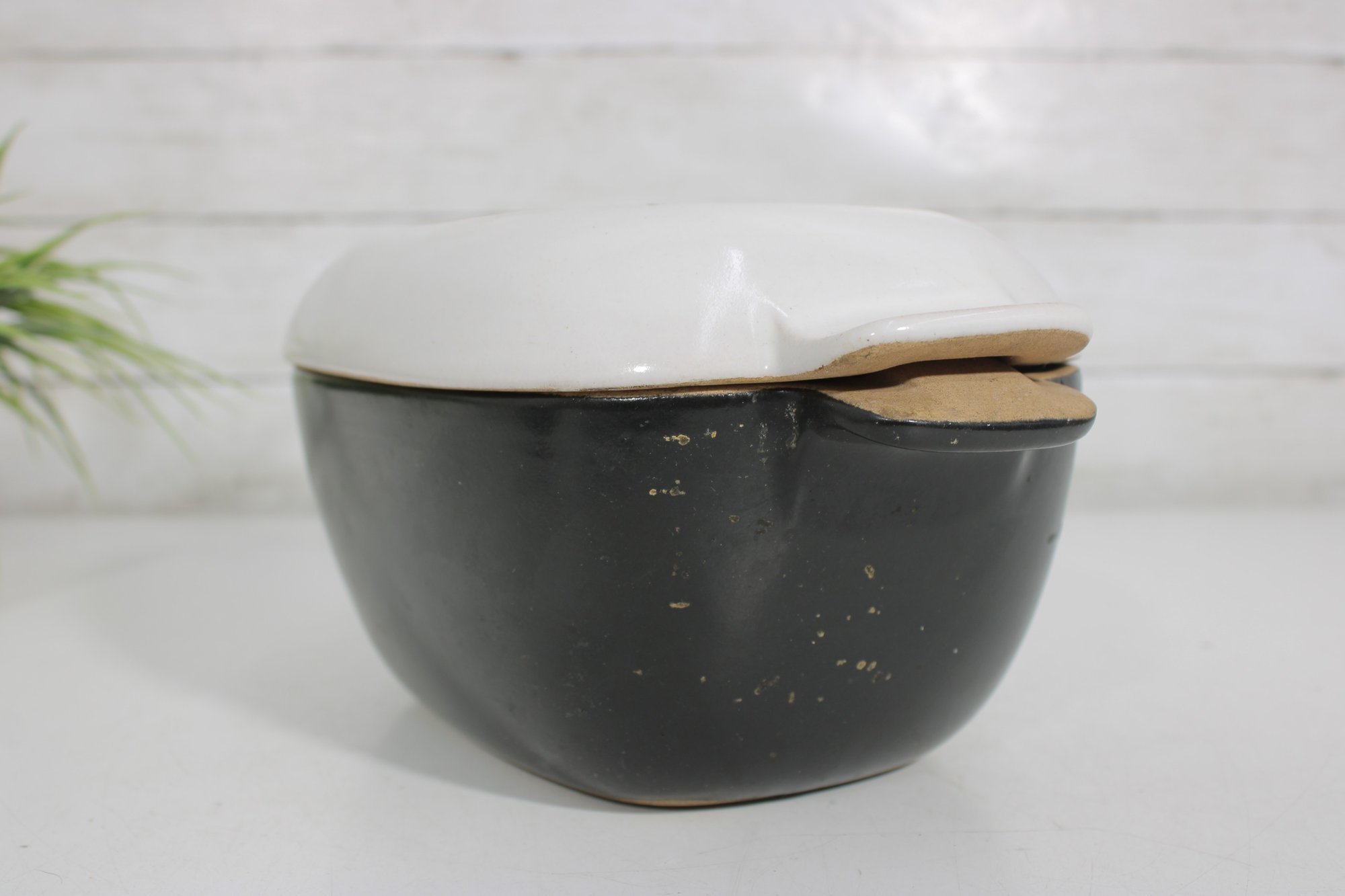 The base is finished in a contrasting matte dark charcoal glaze, giving the piece a bold, modern look. The integrated side handles and fitted lid make it both functional and decorative—ideal for serving or display.