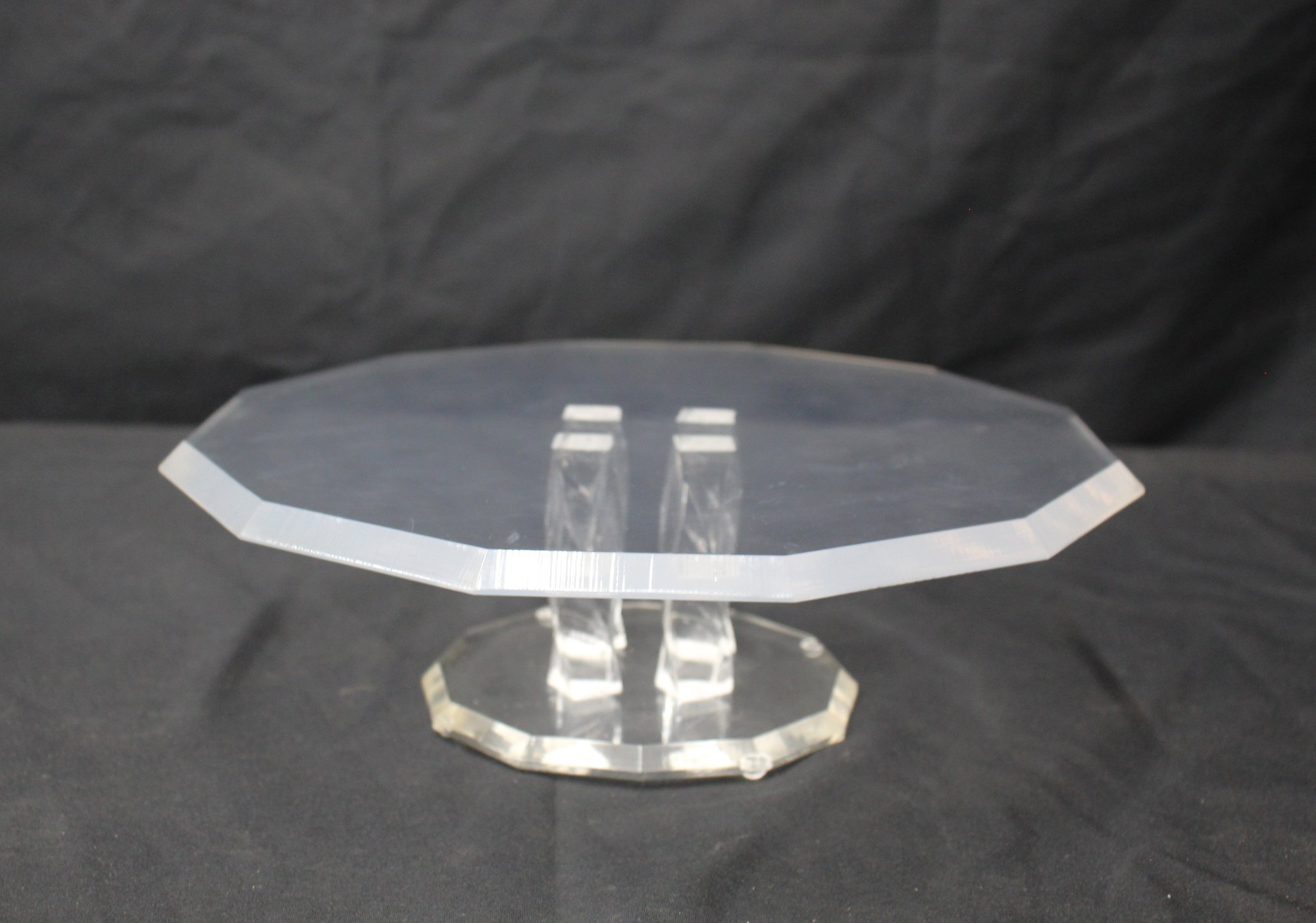 This mid-century modern Lucite cake stand offers a sleek and stylish presentation for your baked creations. Measuring 4 inches in height and 12 inches in diameter, this stand features a clear, durable Lucite construction with a visually striking geometric base that enhances stability and adds an artistic touch. Its minimalist design is perfect for showcasing anything from classic cakes to festive desserts