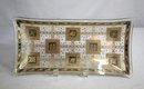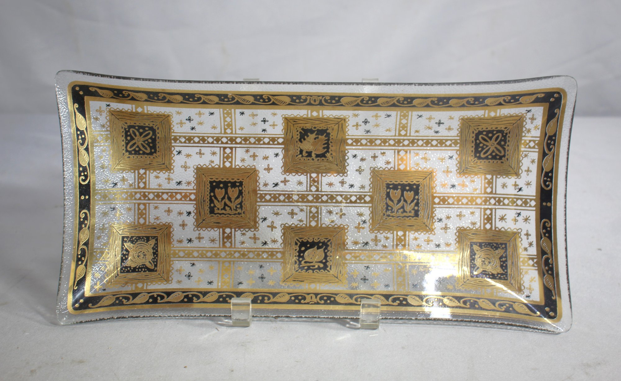 Mid-Century Modern elegance to your home decor with this stunning vintage serving tray by Rojack. This clear glass tray features a beautiful metallic gold print, showcasing intricate designs and patterns that exemplify the sophisticated style of the era.