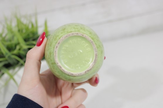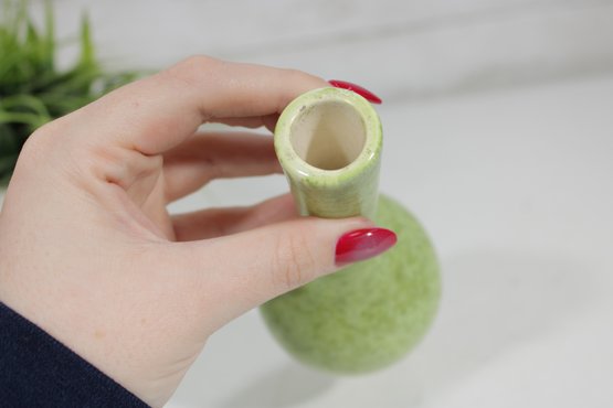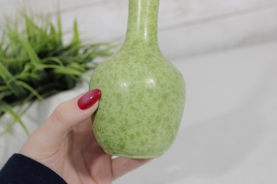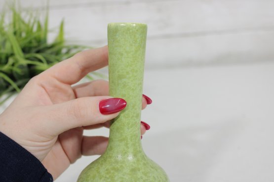 Mid-Century Modern vase by Royal Haeger, featuring a tall, slender neck and rounded base in a beautiful speckled green glaze. Standing approximately 7 inches high, this piece embodies the clean lines and organic form characteristic of classic MCM design.
