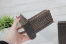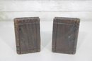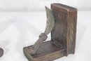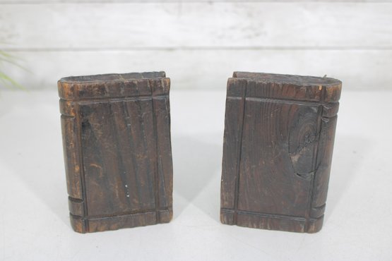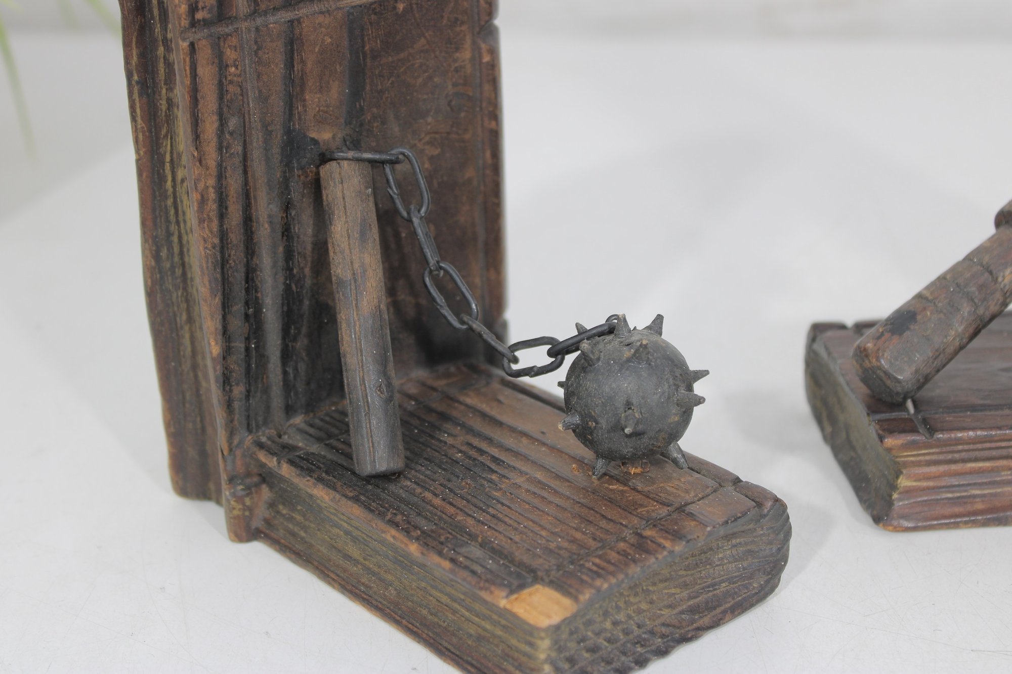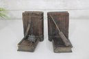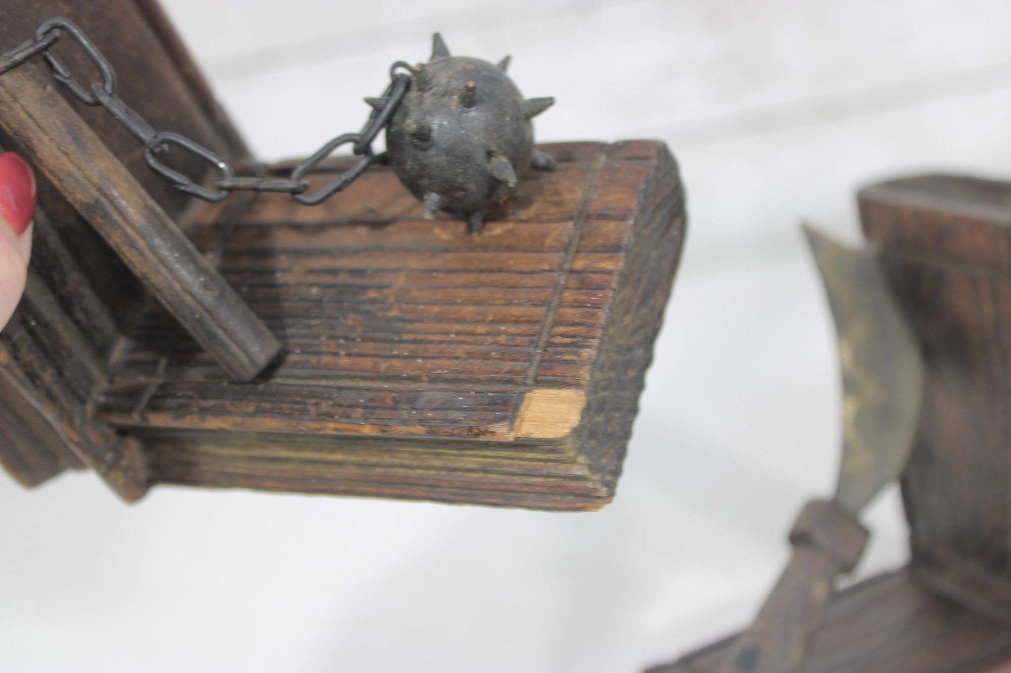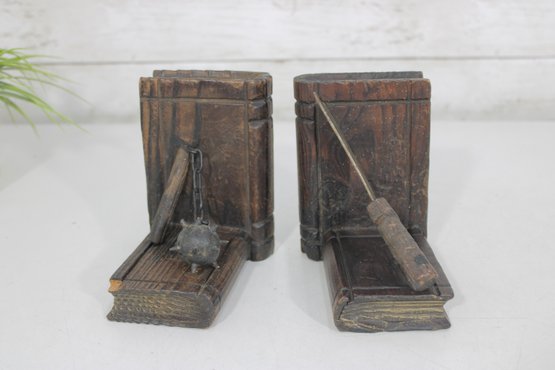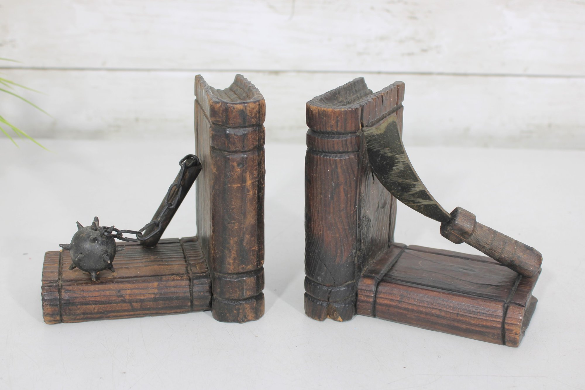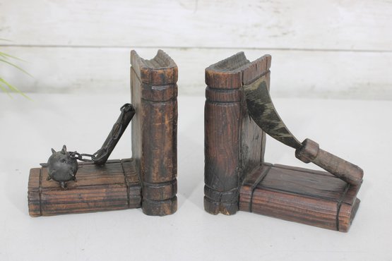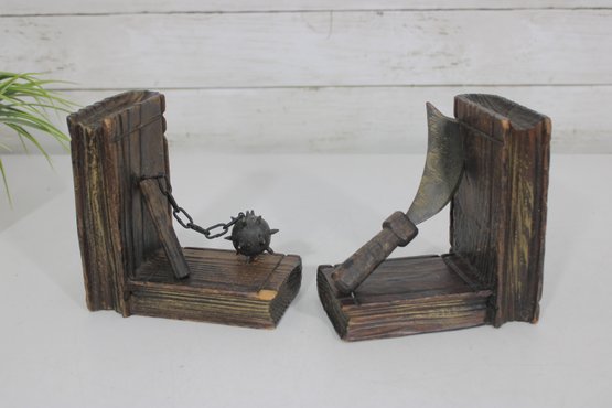 Unique pair of decorative bookends designed in a medieval weapon theme, featuring detailed axe and flail accents set against faux book-style supports. Crafted with a rustic, carved wood appearance, these bookends bring a bold fantasy or historical aesthetic to bookshelves, desks, or display spaces.