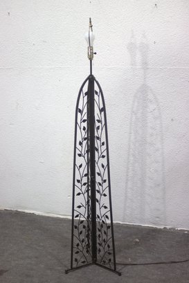Add a unique touch to your space with this wrought iron floor lamp, featuring an intricate leaf and vine motif. Its triangular frame and gothic-inspired silhouette make it a perfect statement piece for both modern and traditional interiors.
