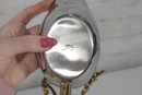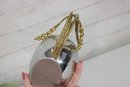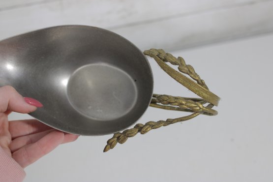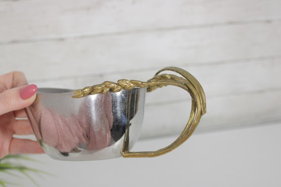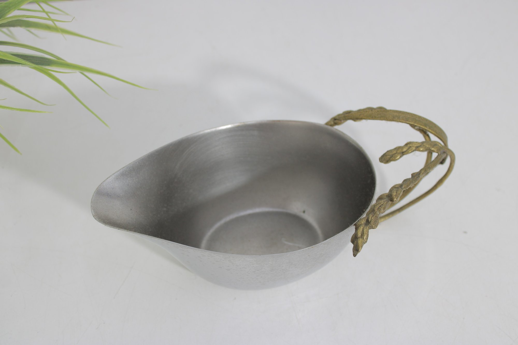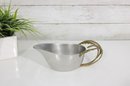 Elegant Michael Aram Wheat gravy boat, showcasing the designer’s signature blend of natural inspiration and refined craftsmanship. The piece features a sleek, polished nickelplate body paired with sculptural brass handles formed as bundled wheat stalks.