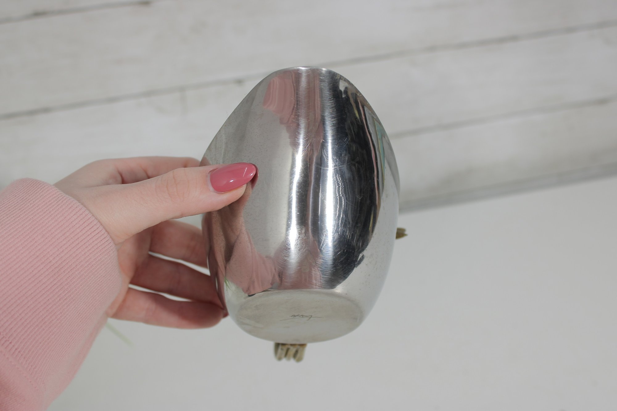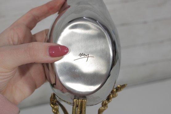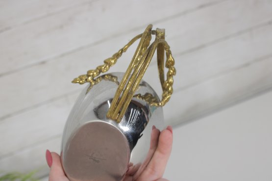 The organic, flowing handle design contrasts beautifully with the smooth, reflective surface of the vessel, creating a sophisticated serving piece ideal for both everyday use and special occasions.