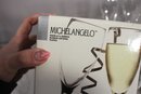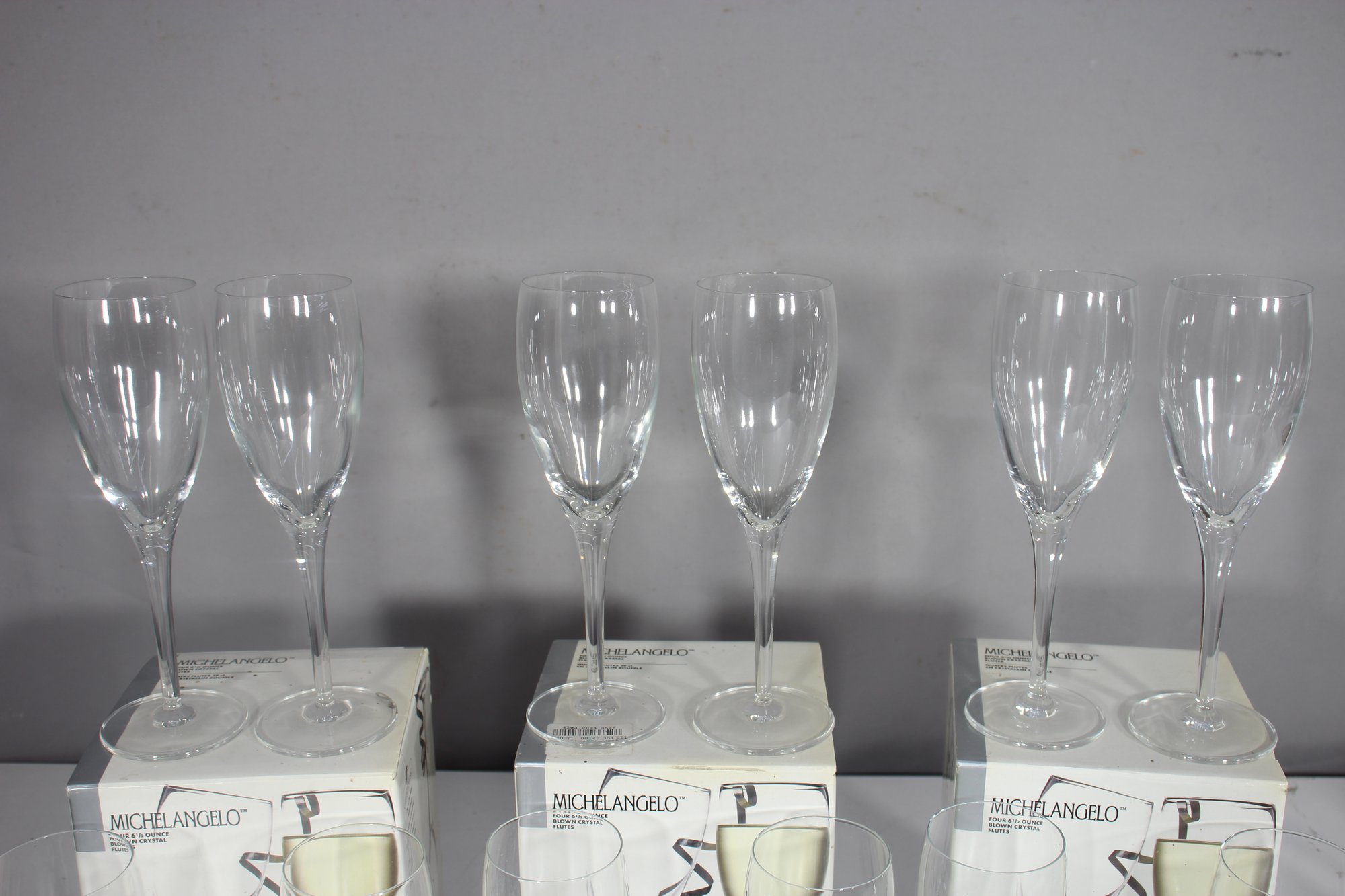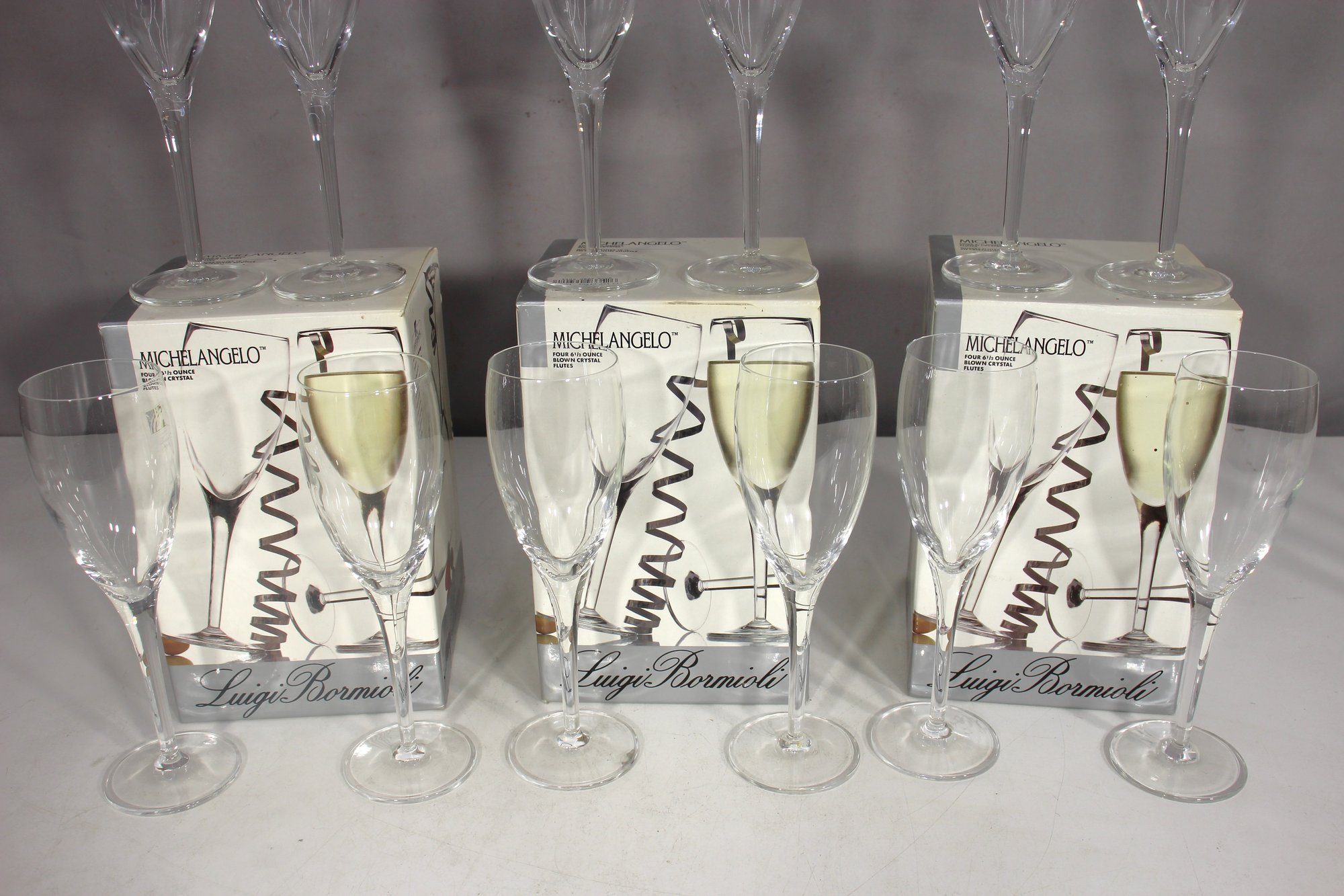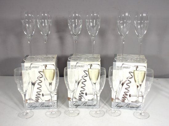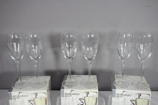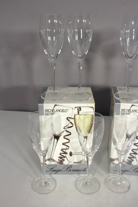 a stunning set of 12 Michelangelo champagne flutes, made in Italy from blown crystal glass. These elegant flutes stand 8 inches tall and feature a timeless, sleek design perfect for any occasion, from formal celebrations to casual gatherings.