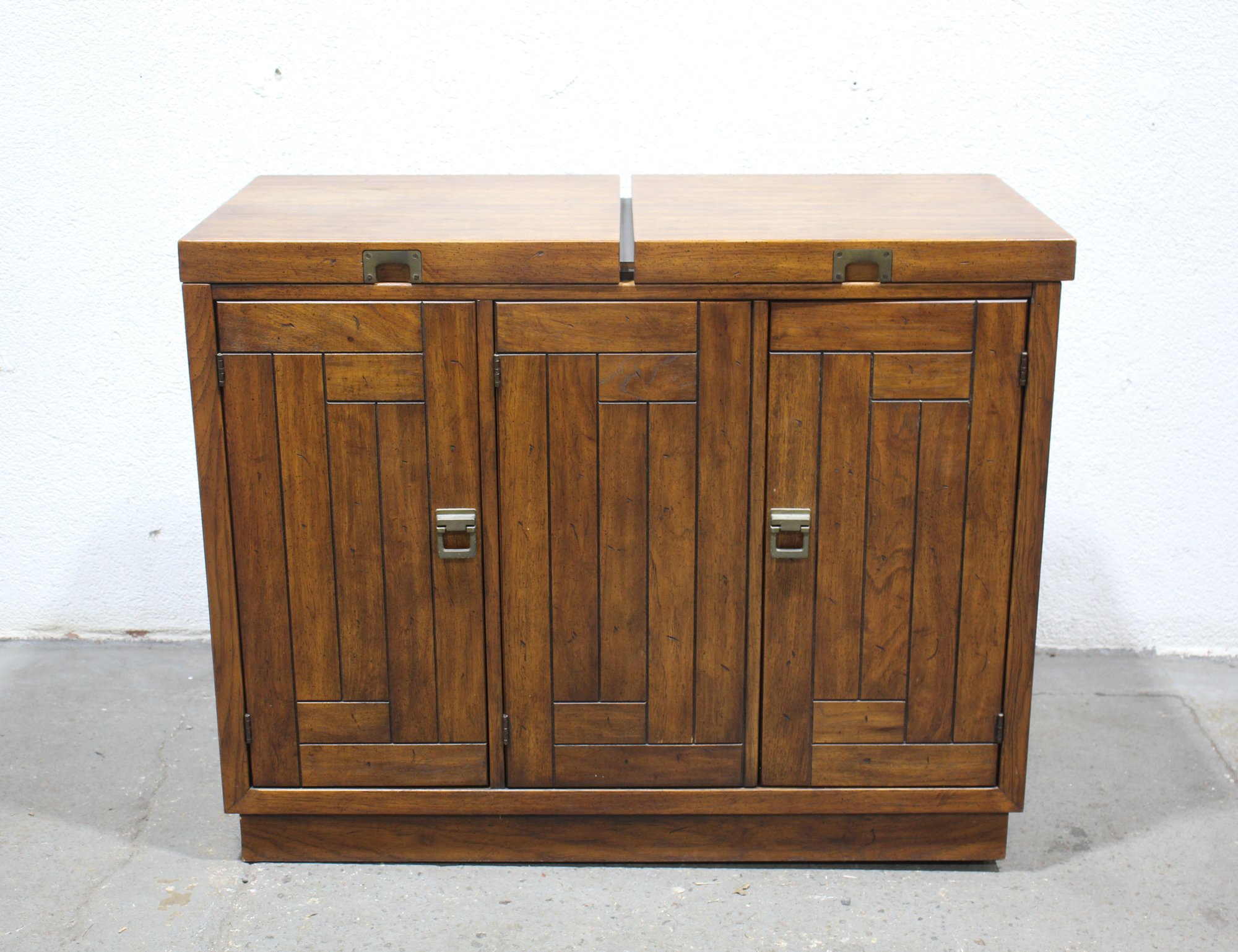 Rolling credenza could be used as a bar cart or service cart. Top slides out to expose black melamine too. Made by Drexel from fruitwood. Would complement any mid century modern, Hollywood regency