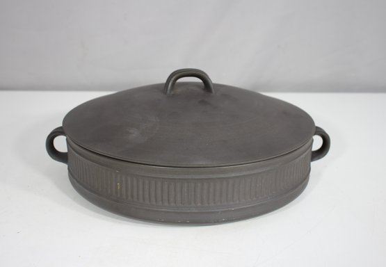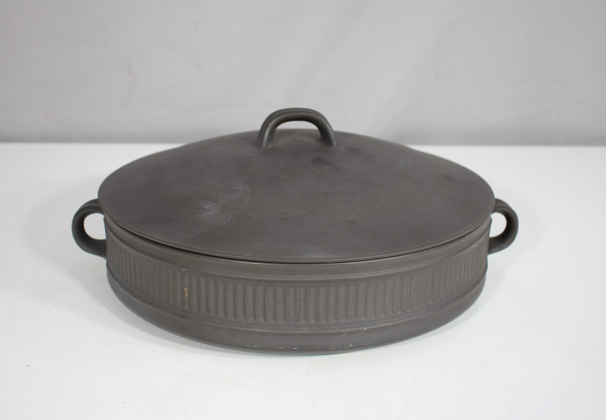 This mid-century Dansk Danmark Flamestone covered casserole dish, designed by Jens Quistgaard (JHQ), is a true Scandinavian modern classic. Crafted in the 1950s, this 3-quart round casserole features a matte black stoneware exterior with a contrasting white enameled interior for superior heat retention and durability.