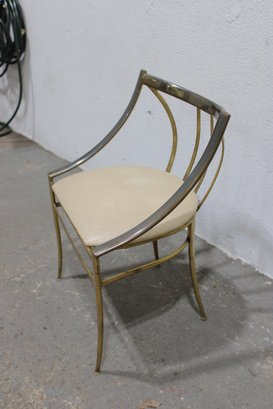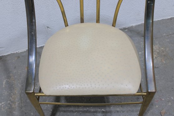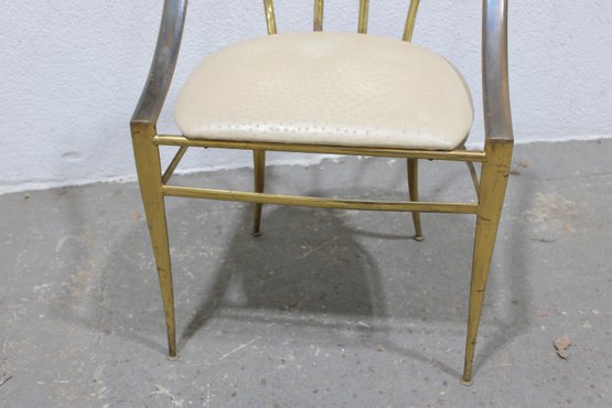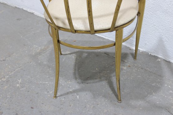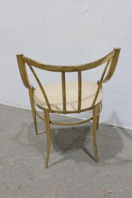 The neutral upholstered seat complements the warm brass finish, making it a versatile piece for a variety of interiors—from vintage and Hollywood Regency to modern spaces. Perfect as an accent chair, vanity chair, or occasional seating.