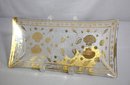 Mid Century Georges Briard large rectangular glass dish is a stunning example of timeless design and elegance. Featuring an intricate gold seashell pattern, this dish adds a touch of vintage charm to any setting. Measuring generously, it is perfect for serving or as a decorative centerpiece. Please note that some areas are losing the gold tone, adding to its authentic vintage character. Despite this, it remains a beautiful collectible piece for any lover of mid-century design. Don't miss the chance to own this remarkable Georges Briard glass dish.