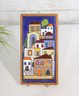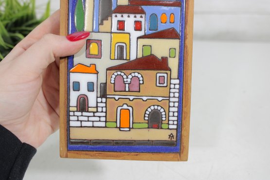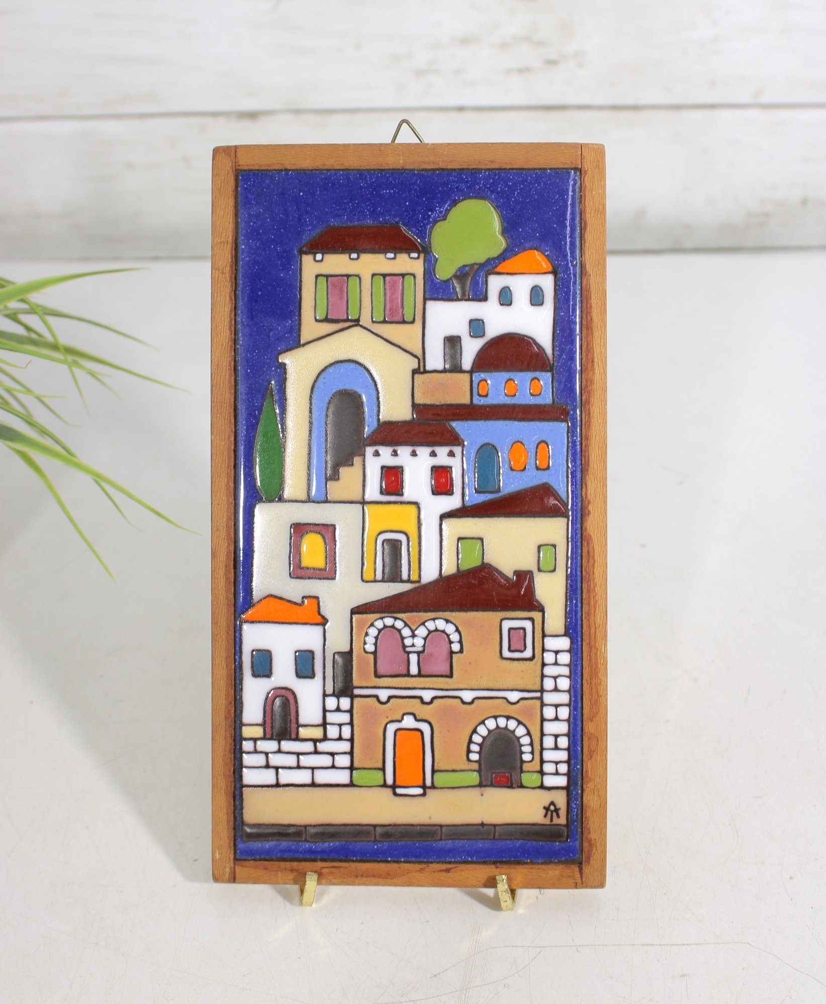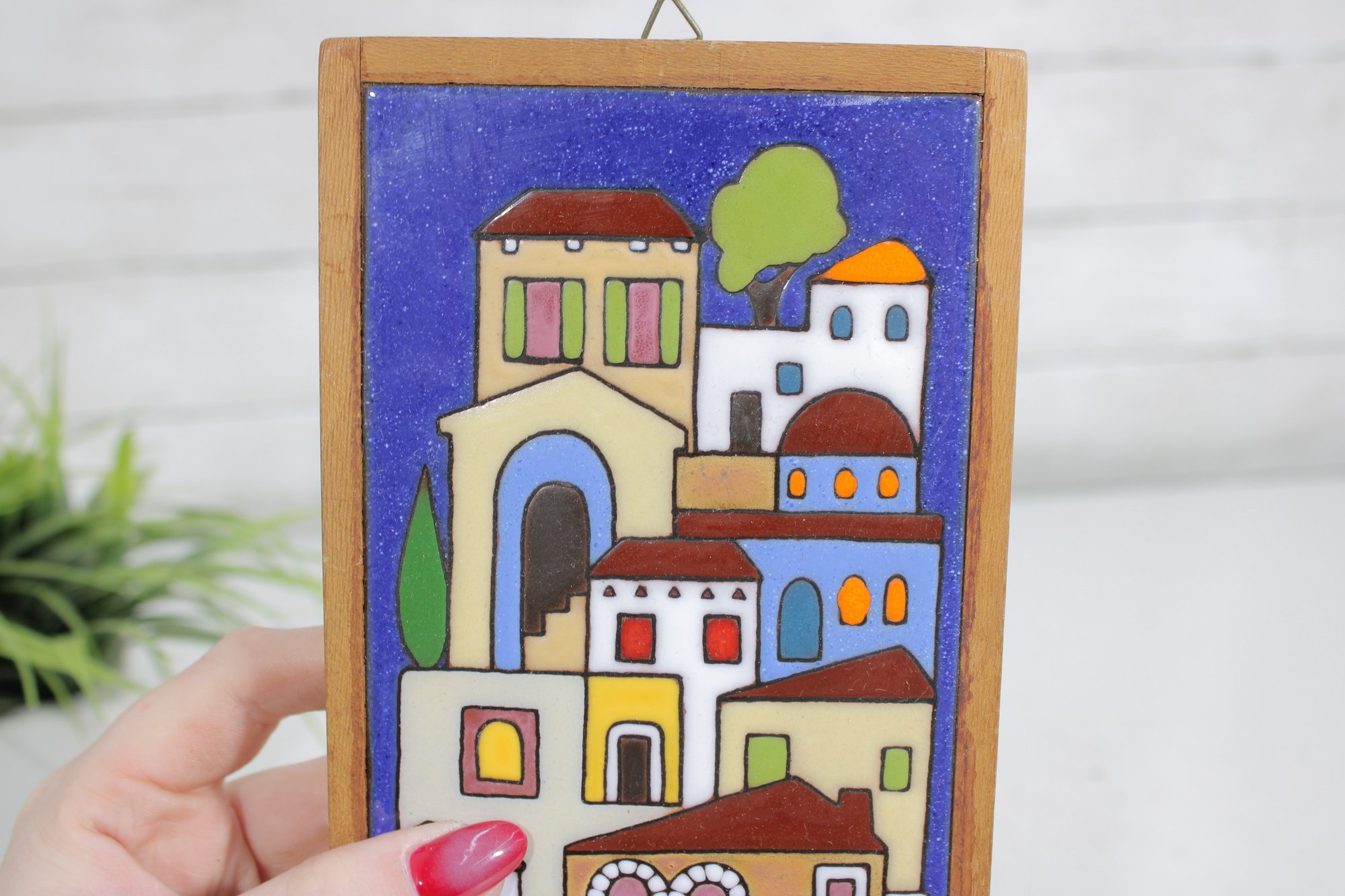 Vibrant mid-century Greek ceramic wall tile by Angelo Tsakirakis, featuring a charming stylized village scene. The design showcases stacked white buildings with colorful doors, windows, and rooftops set against a deep blue sky, capturing the essence of traditional Mediterranean architecture.