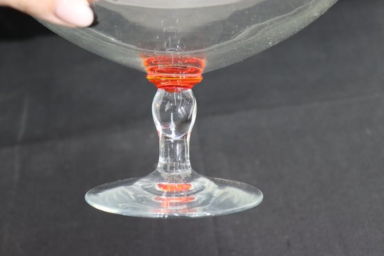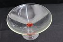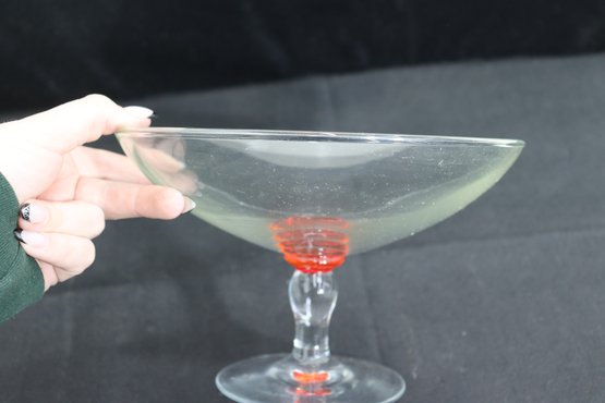 A beautiful mid-century modern hand-blown glass compote featuring a clear wide bowl accented with a striking red glass ring detail at the stem. This refined pedestal form showcases the clean lines and color contrasts typical of 1950sā1960s art glass design.