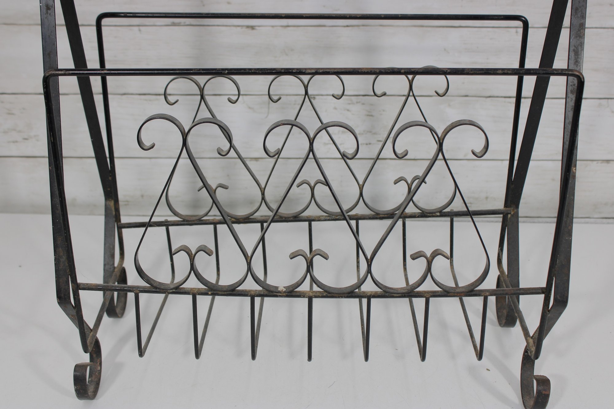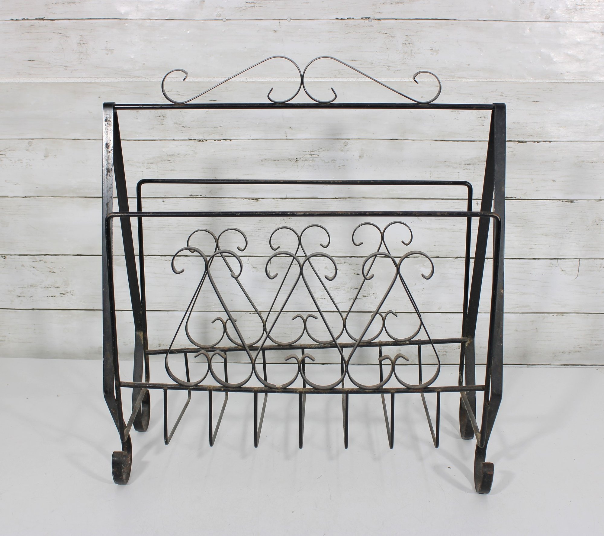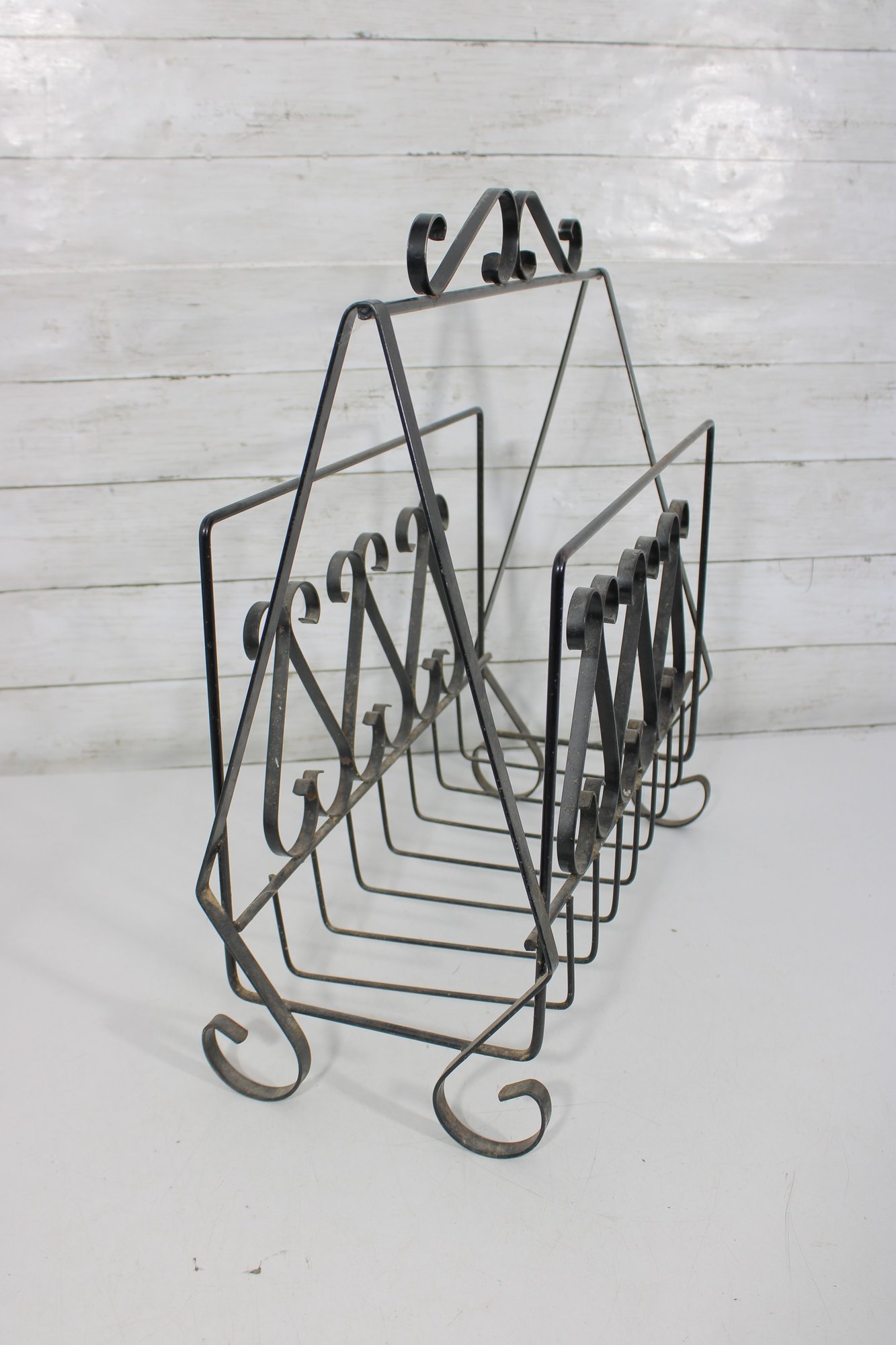 this Mid Century metal magazine rack. Featuring elegant scrollwork detailing throughout, this piece showcases a classic wrought iron design with graceful curves and decorative accents that embody timeless mid-century aesthetics.