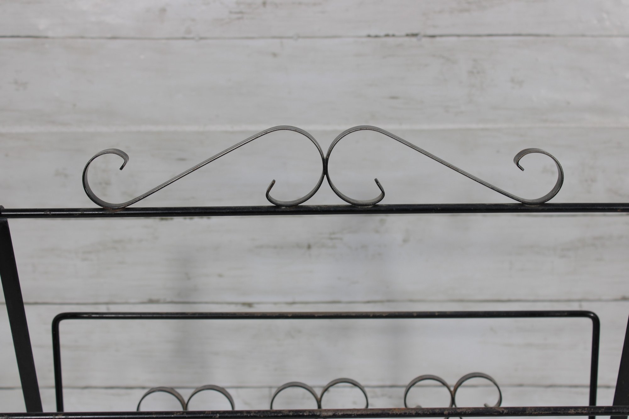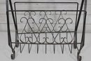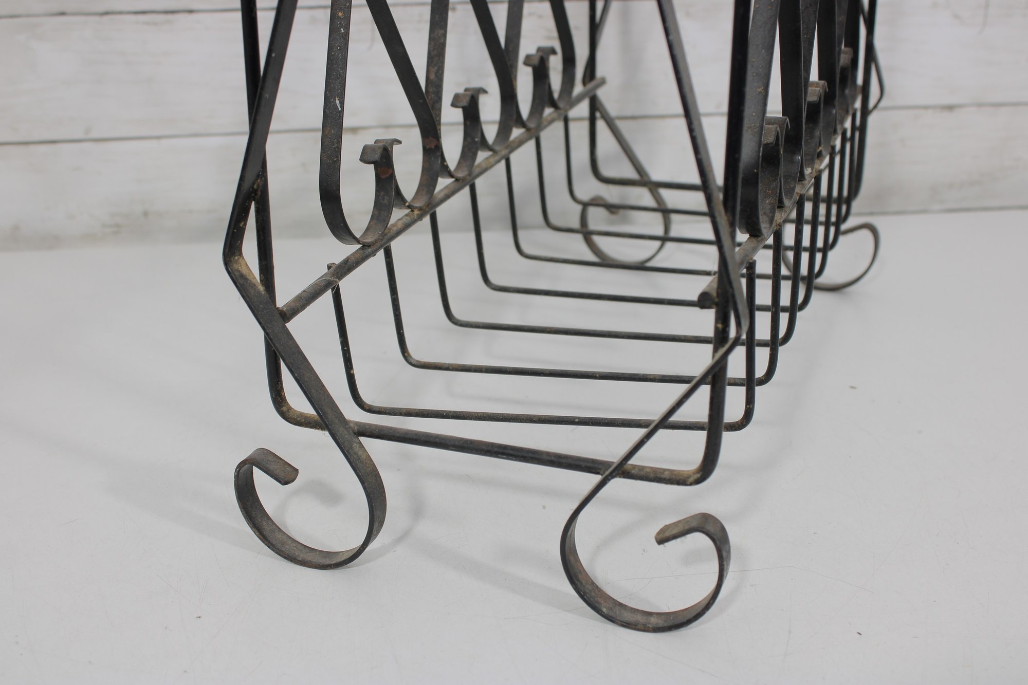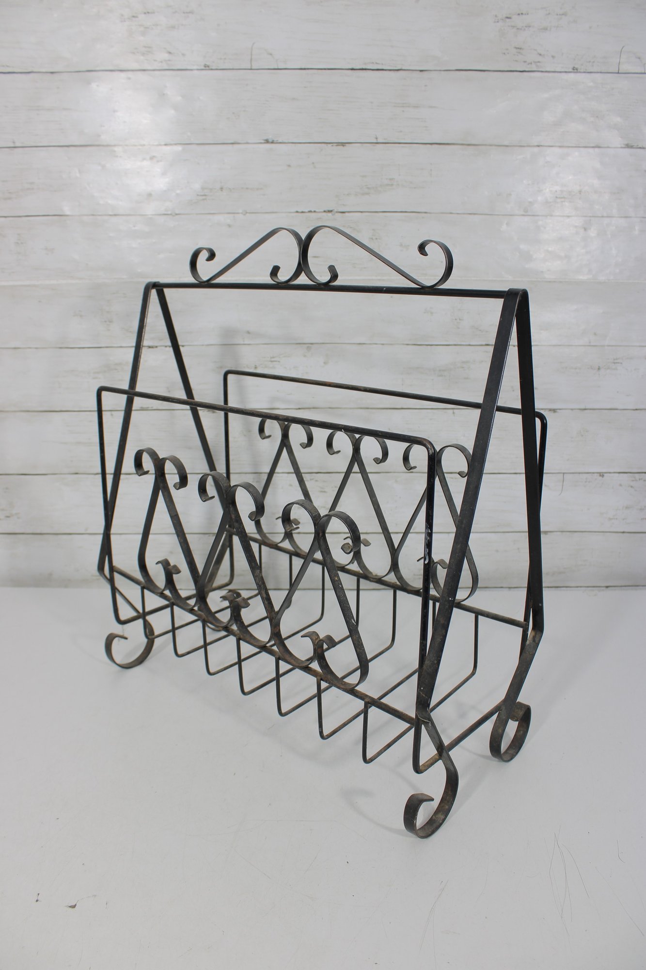 this Mid Century metal magazine rack. Featuring elegant scrollwork detailing throughout, this piece showcases a classic wrought iron design with graceful curves and decorative accents that embody timeless mid-century aesthetics.