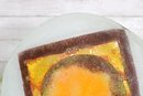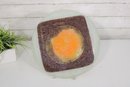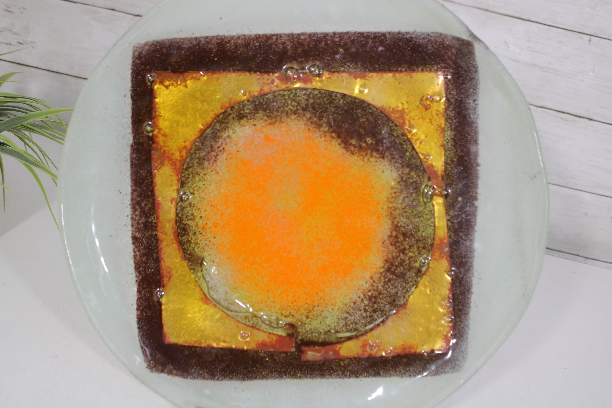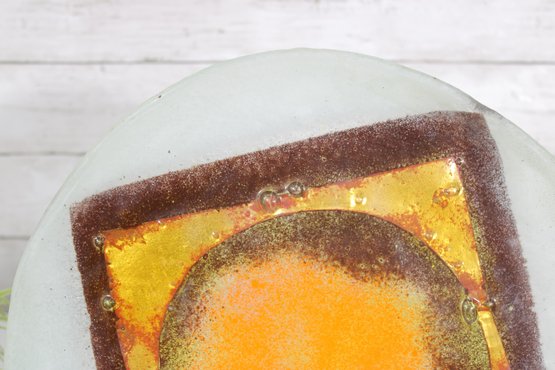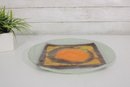 Striking mid-century modern art glass plate featuring a bold abstract design in warm tones of orange, amber, and deep brown. The composition centers on a glowing circular motif layered over a square form, creating a dynamic geometric contrast that is characteristic of MCM design.
