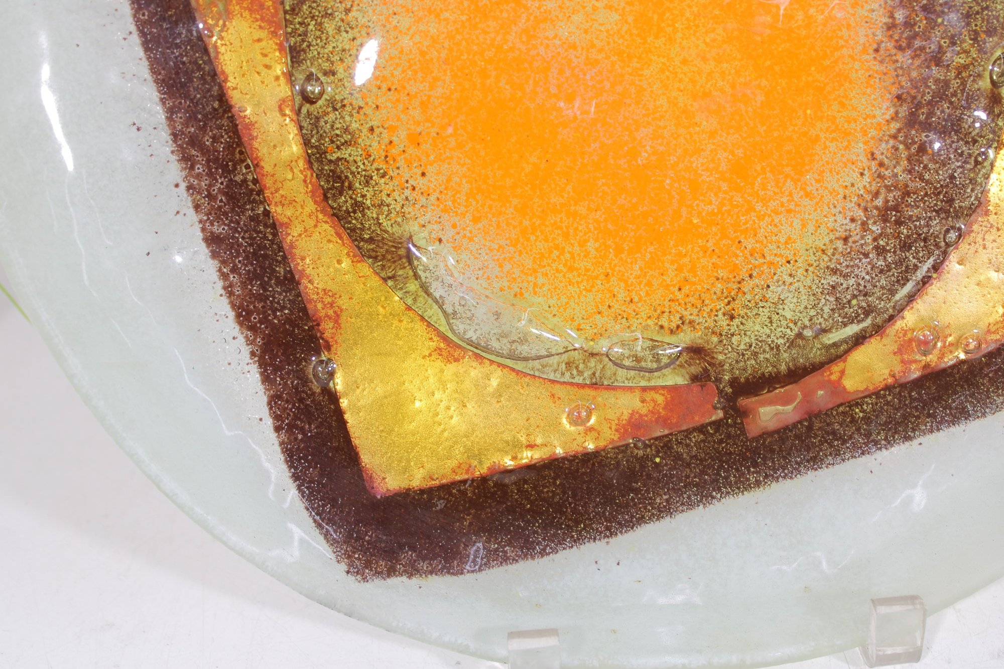 The plate has a sculptural, slightly organic shape with a softly curved rim, and the textured glass surface adds depth and visual interest as it catches the light. Its rich color palette and retro aesthetic make it a standout decorative piece.