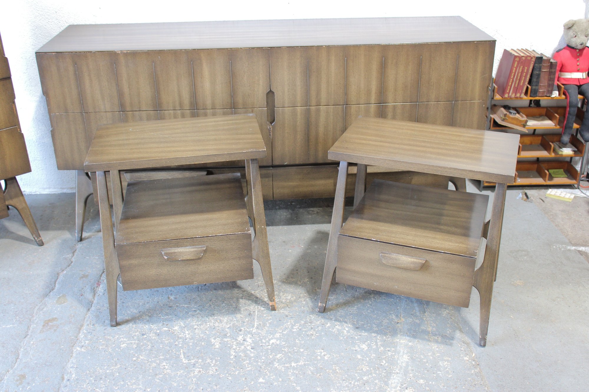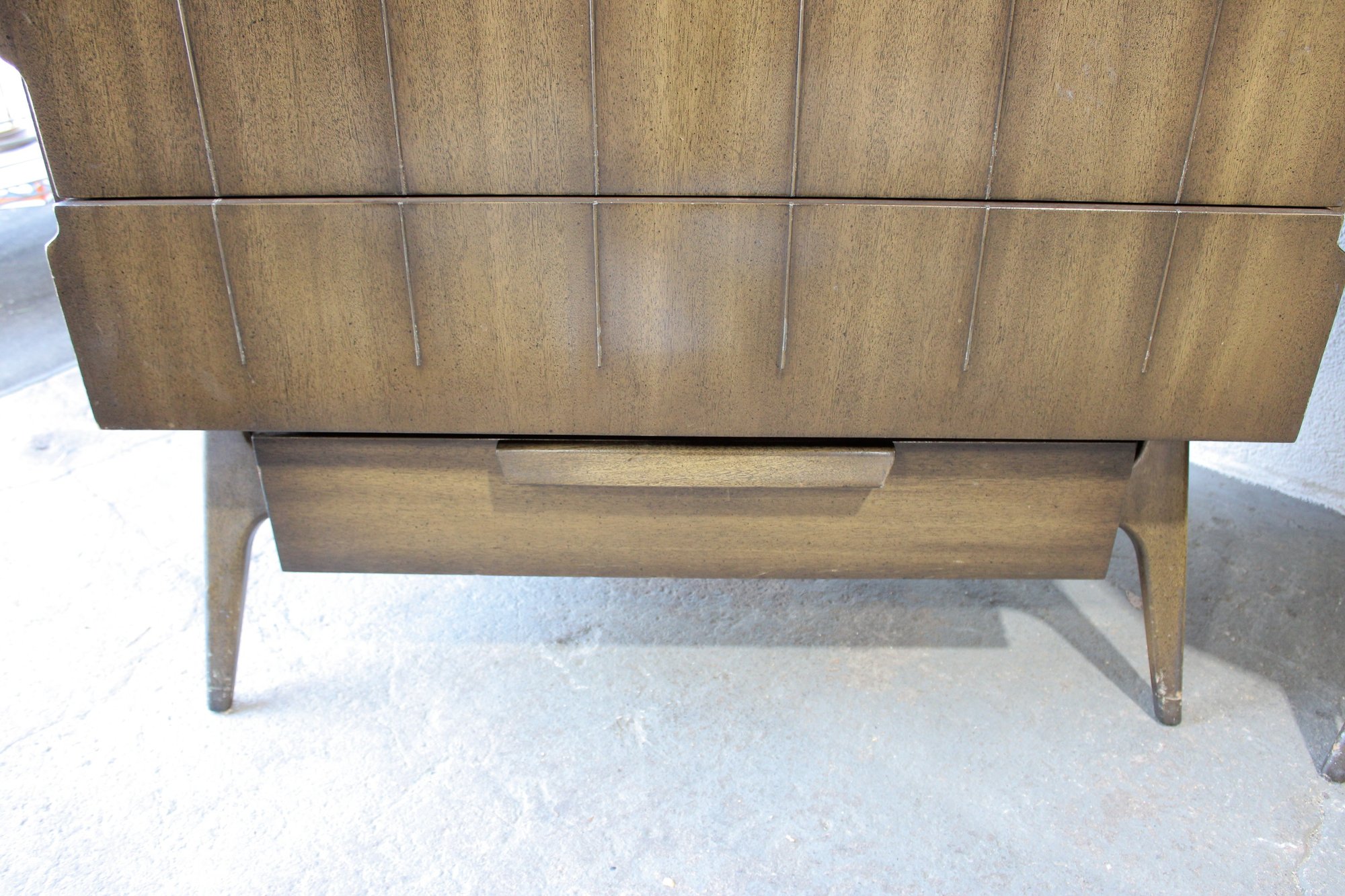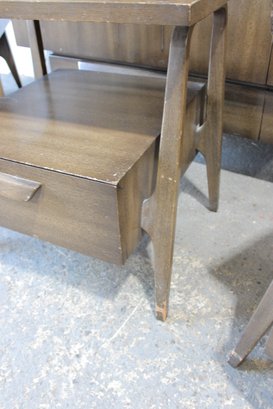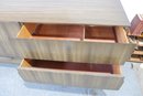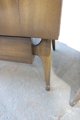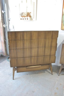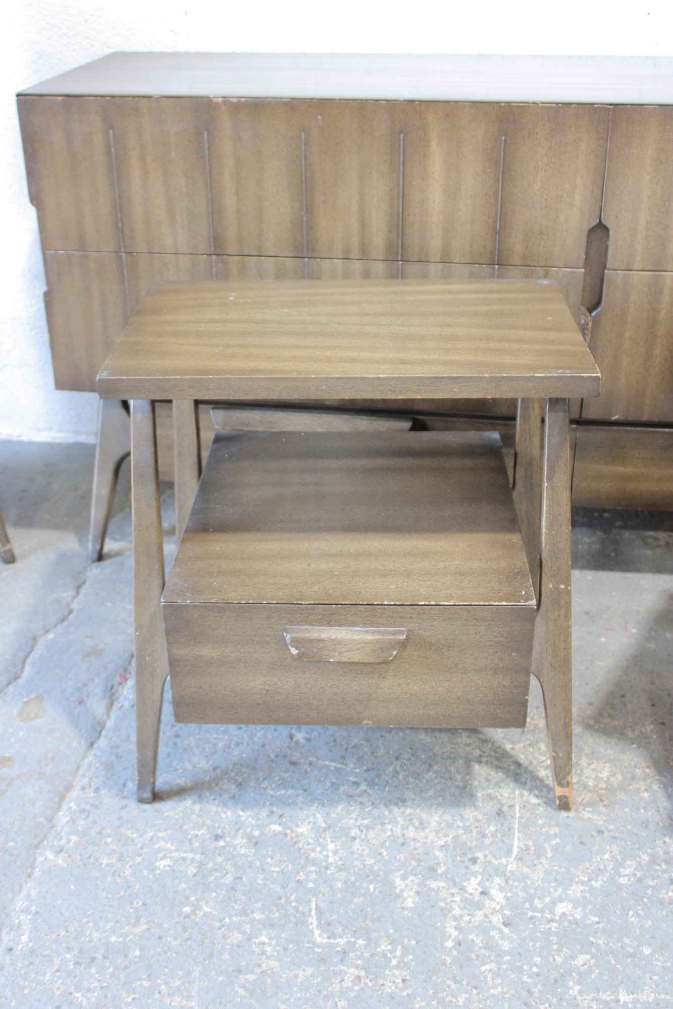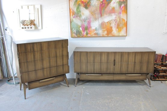 this stunning Mid-Century Modern 4-piece bedroom set, featuring a cohesive design with sculptural lines and beautifully grained wood. This set includes a tall chest, a long dresser, and two matching nightstands—each showcasing clean lines, integrated pulls, and elegant tapered legs.