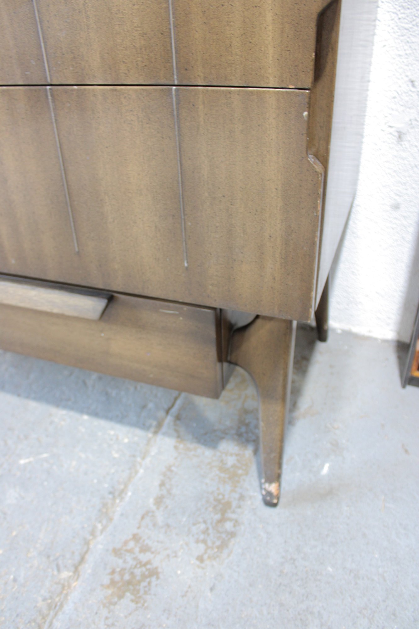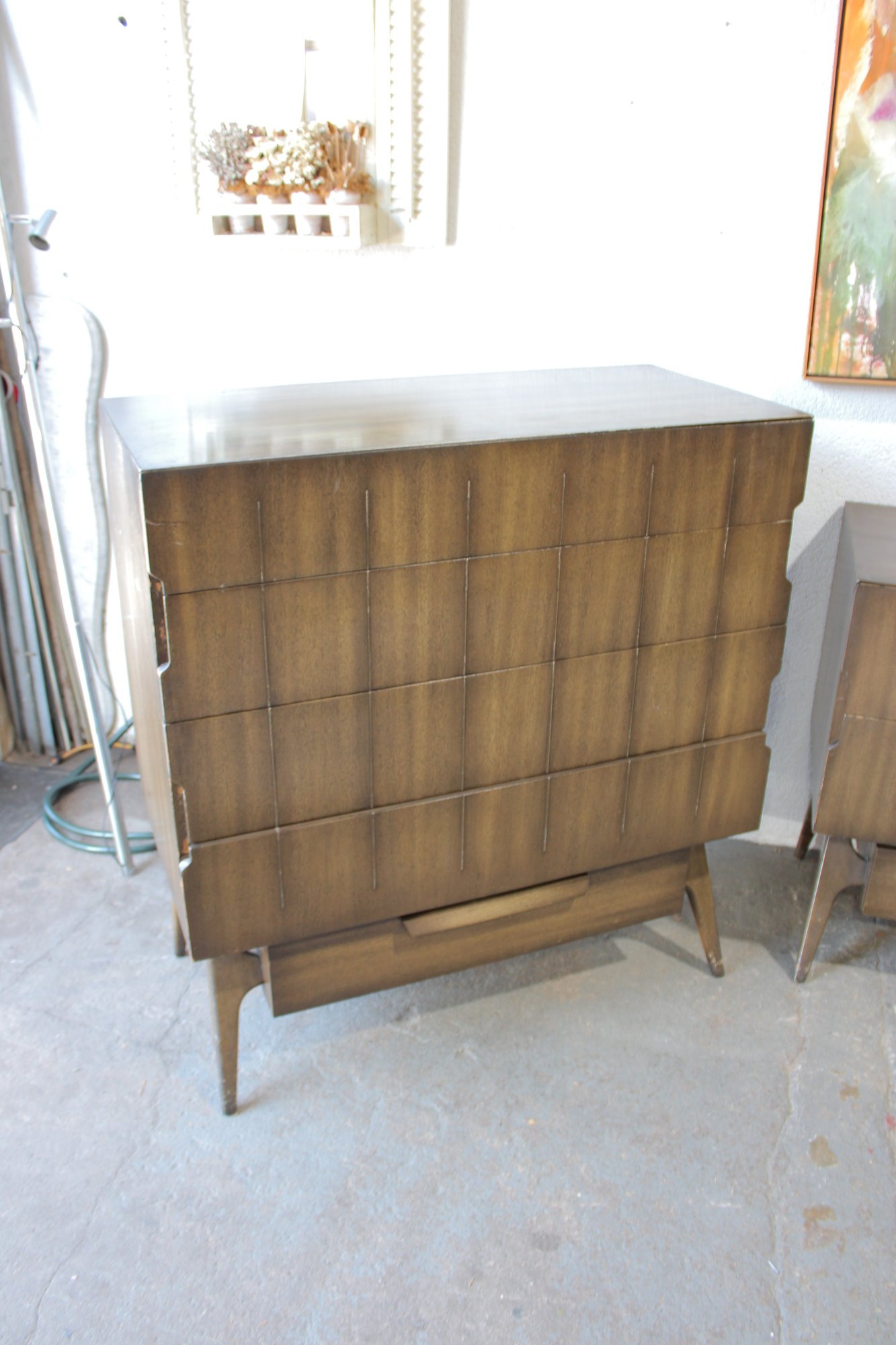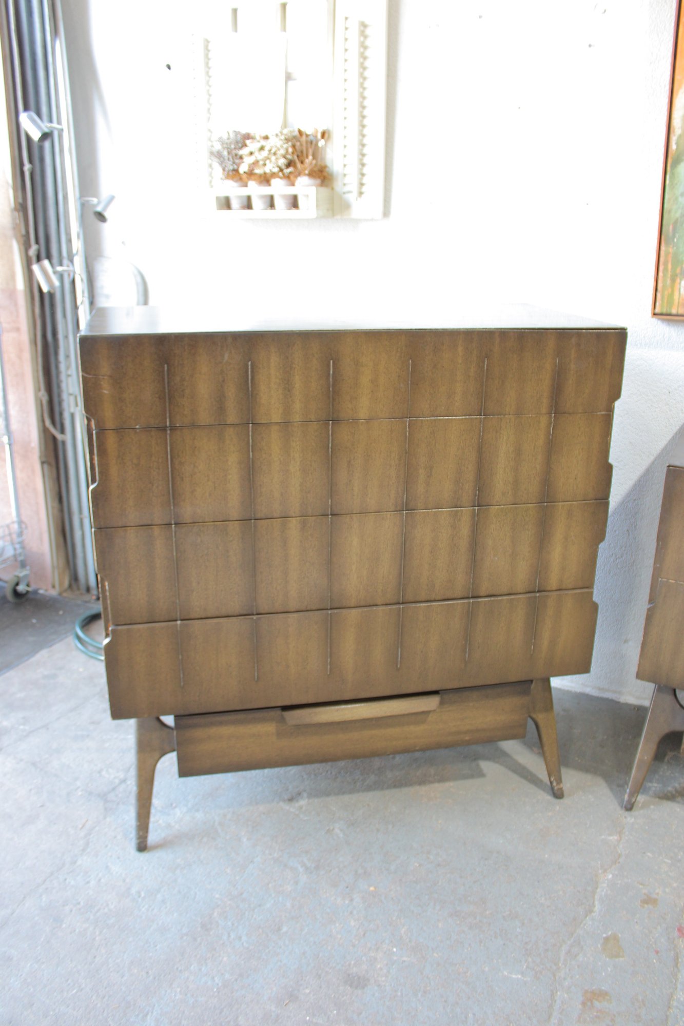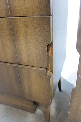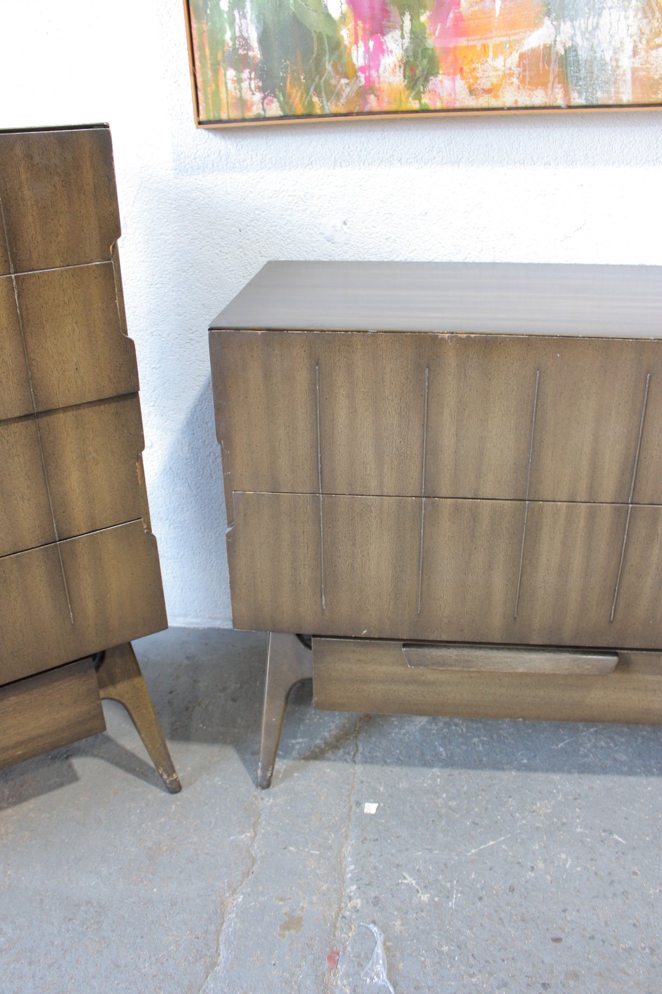 this stunning Mid-Century Modern 4-piece bedroom set, featuring a cohesive design with sculptural lines and beautifully grained wood. This set includes a tall chest, a long dresser, and two matching nightstands—each showcasing clean lines, integrated pulls, and elegant tapered legs.