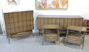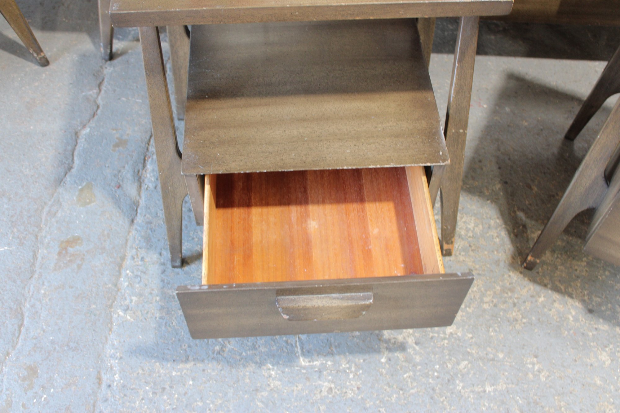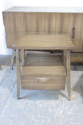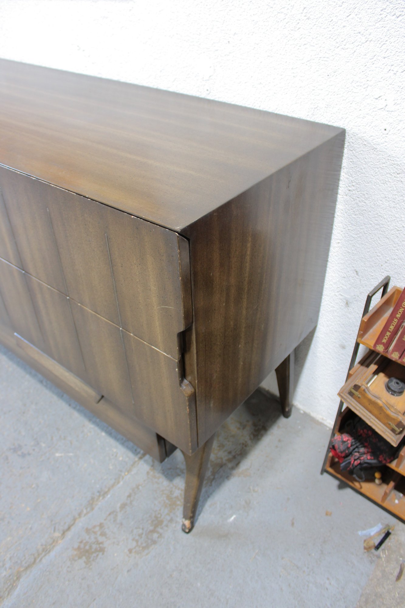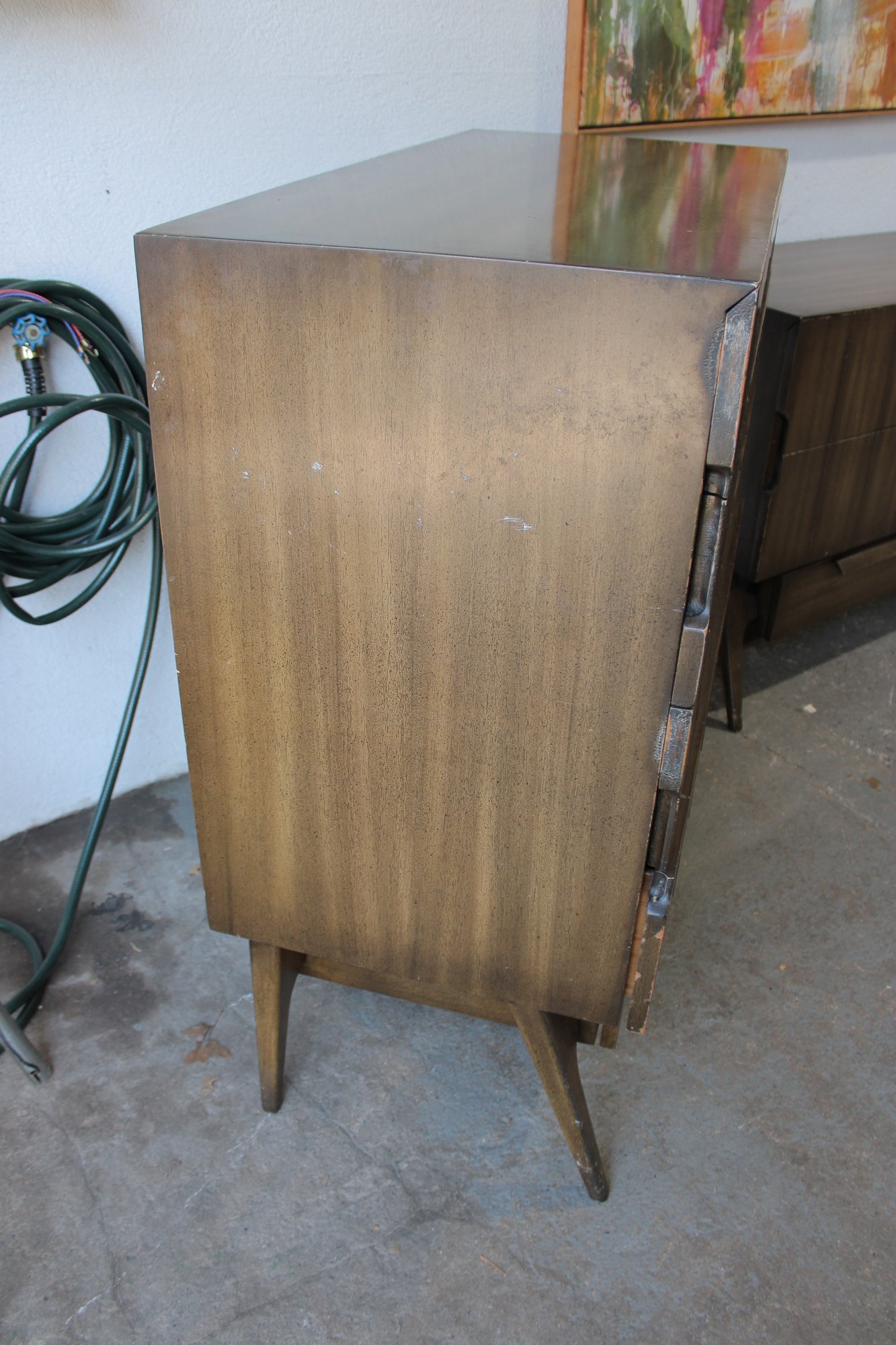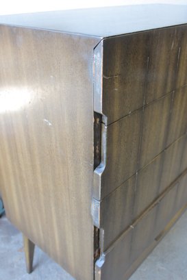 this stunning Mid-Century Modern 4-piece bedroom set, featuring a cohesive design with sculptural lines and beautifully grained wood. This set includes a tall chest, a long dresser, and two matching nightstands—each showcasing clean lines, integrated pulls, and elegant tapered legs.