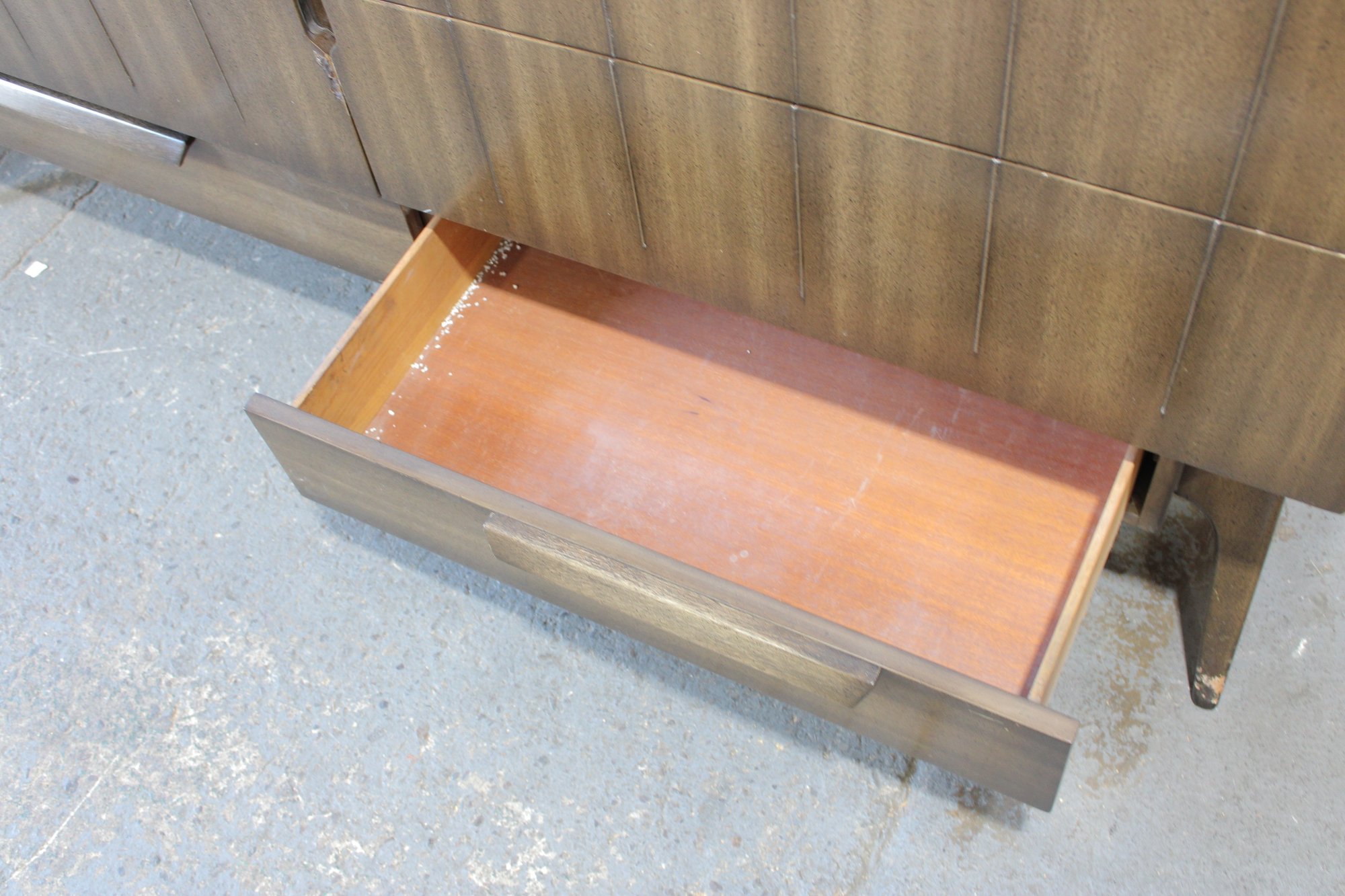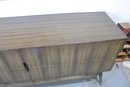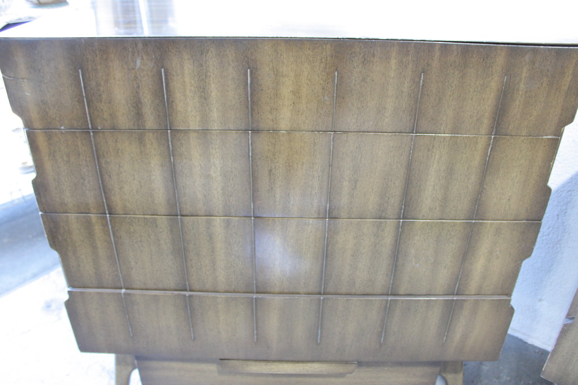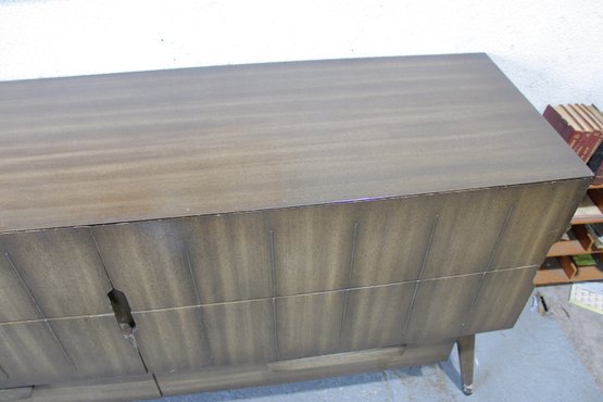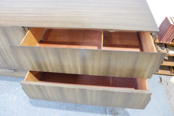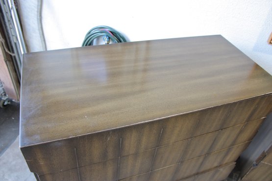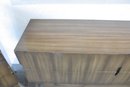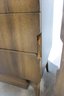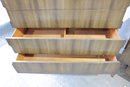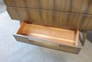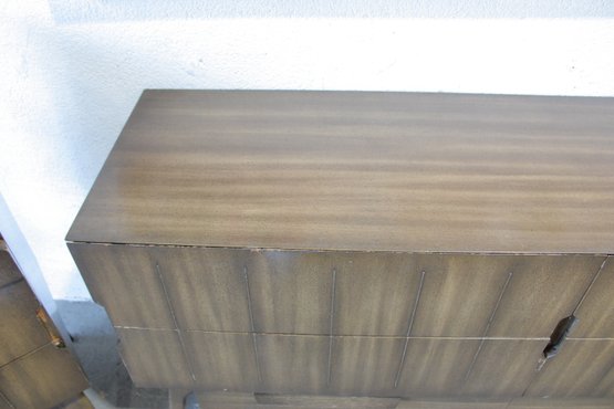 The warm wood tone and subtle vertical patterning across the drawer fronts give the set a sophisticated, high-end look, while the raised base and angular legs add a distinctive mid-century flair.