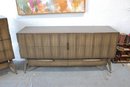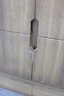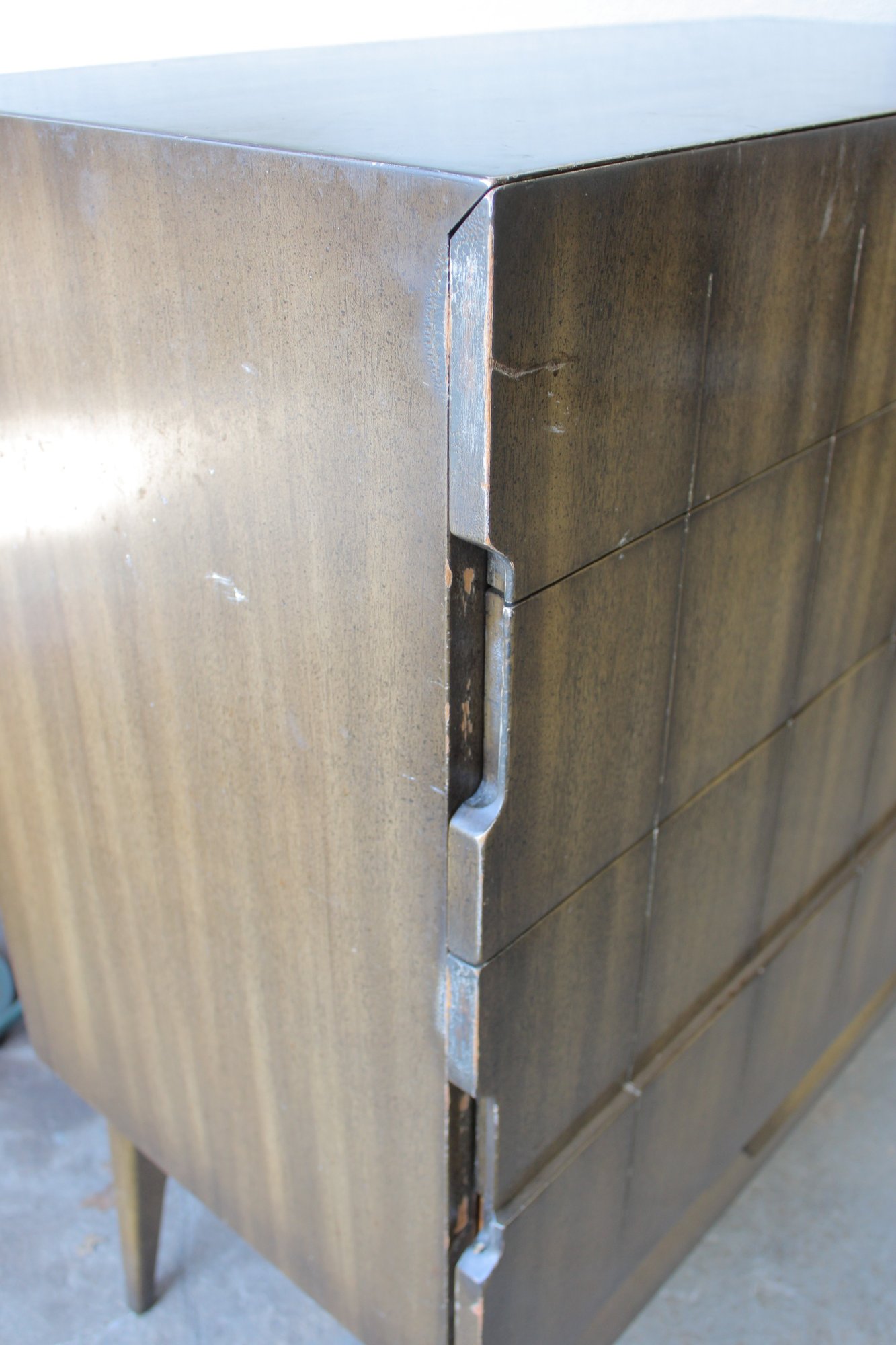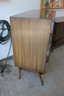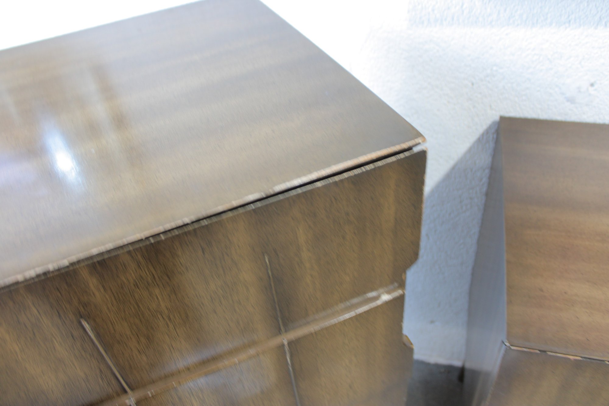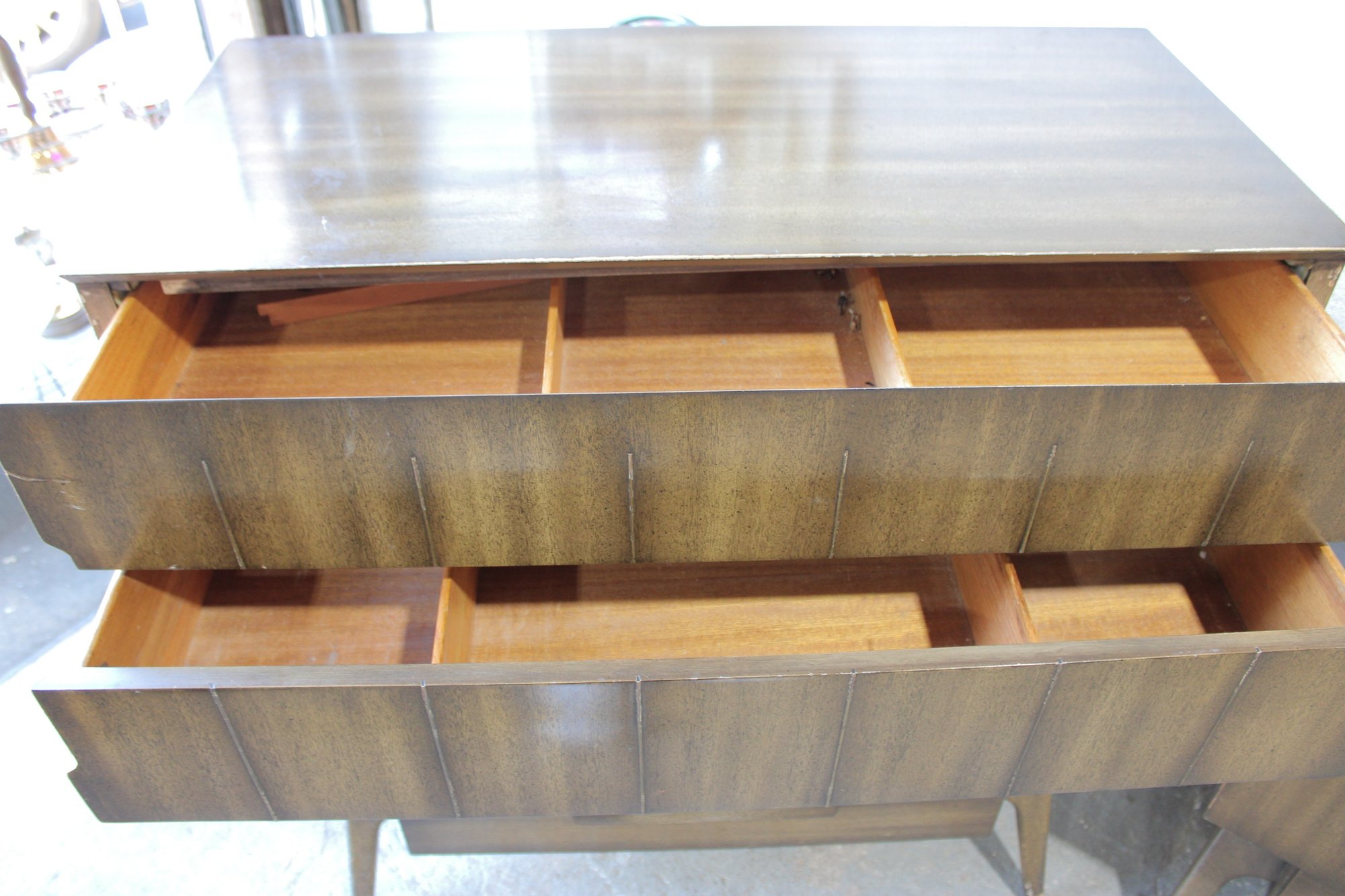 The warm wood tone and subtle vertical patterning across the drawer fronts give the set a sophisticated, high-end look, while the raised base and angular legs add a distinctive mid-century flair.