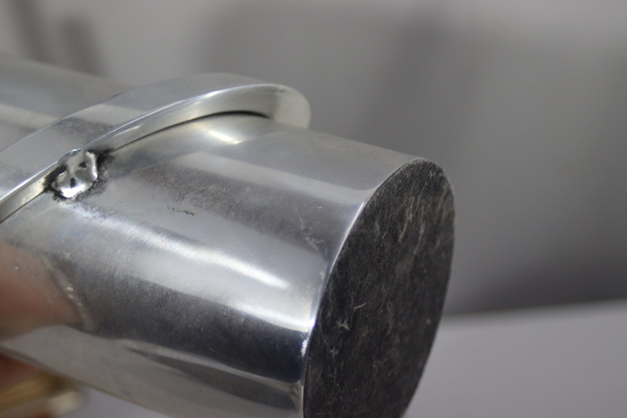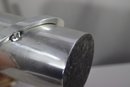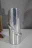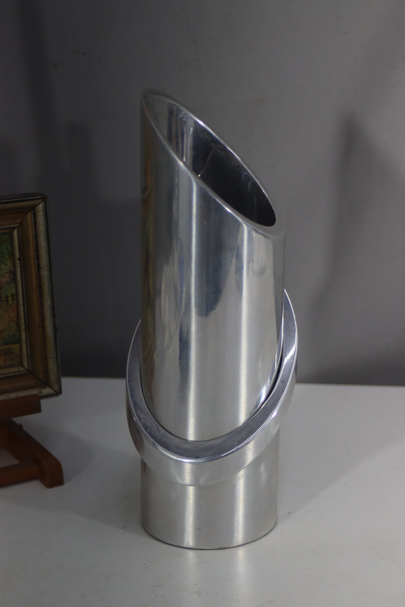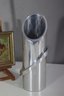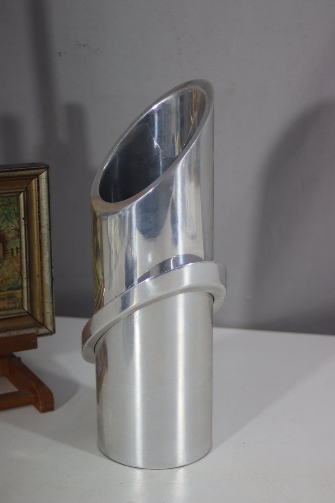 mid-century modern aluminum vase is a true statement piece with its sleek, futuristic design. The vase features a cylindrical body with a sharply angled top opening, creating a dynamic, modernist silhouette. A prominent circular metal band wraps around the structure, adding depth and artistic appeal.
