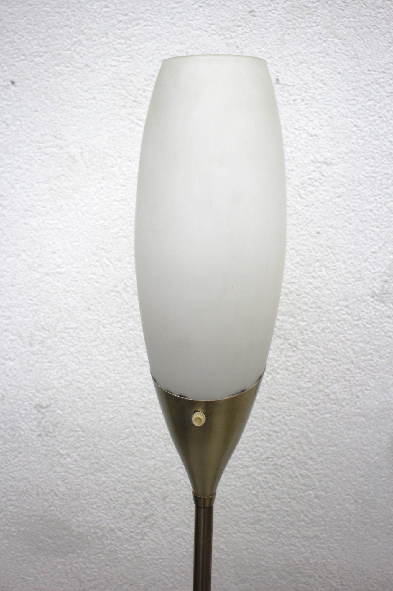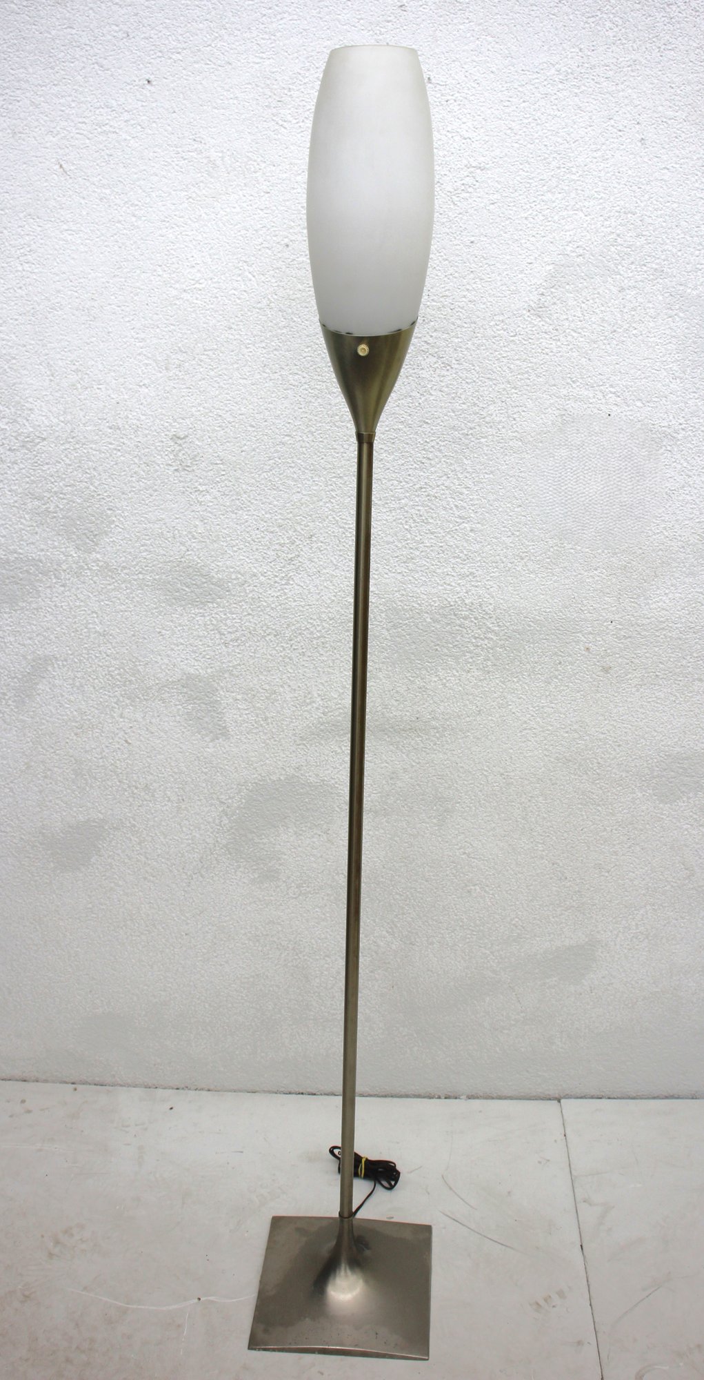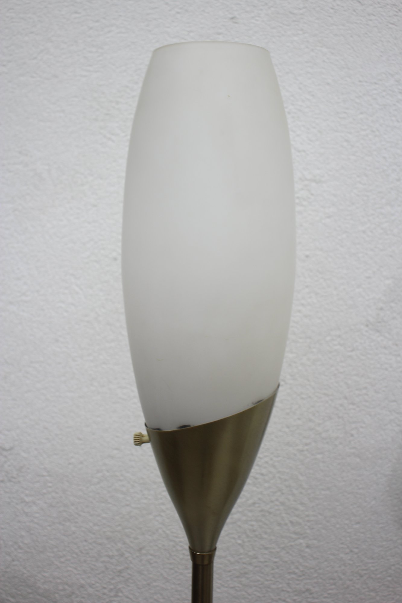 This 67-inch tall mid-century modern floor lamp features a sleek brass-finished metal frame with a frosted glass globe shade, creating a soft, ambient glow. The elongated, oval-shaped glass diffuser sits atop a slender brass stem, supported by a sturdy square metal base. A side-mounted rotary switch provides easy operation. The lamp’s minimalist yet sophisticated design makes it a perfect fit for modern, vintage, or contemporary interiors. Ideal for living rooms, bedrooms, or office spaces, this piece adds both style and functionality to any setting.
