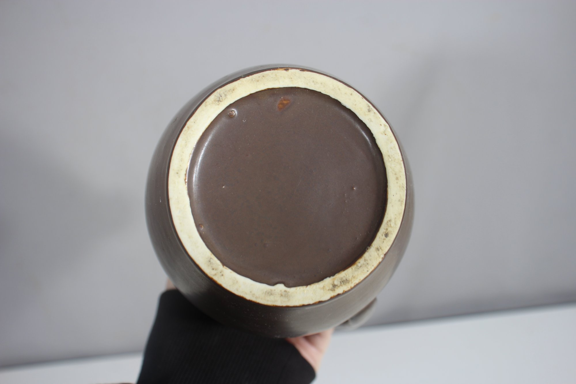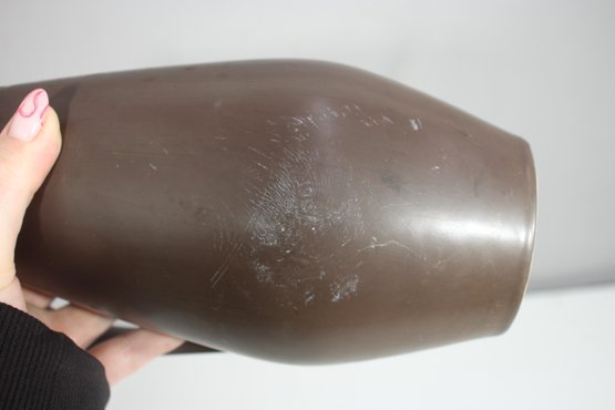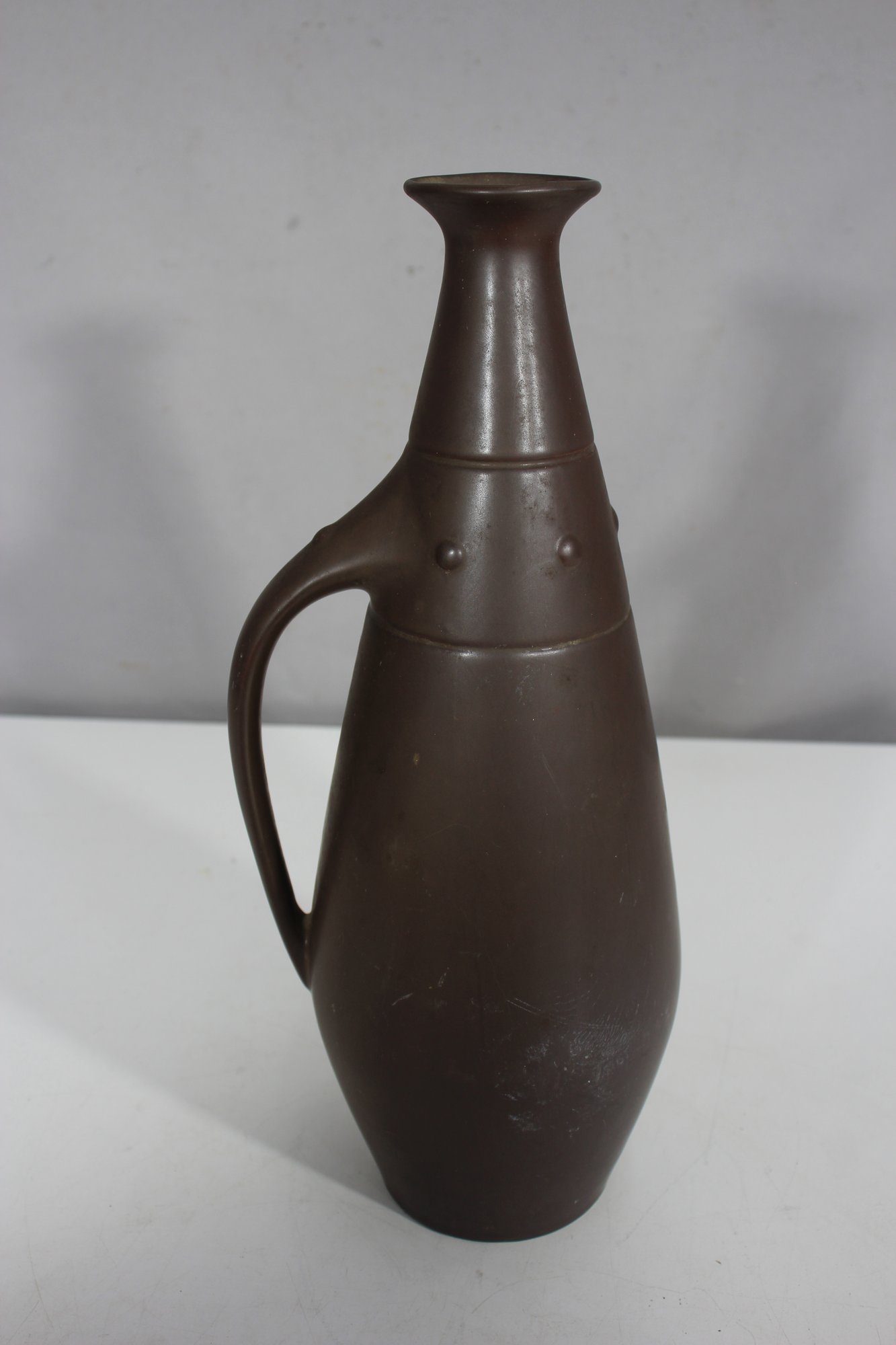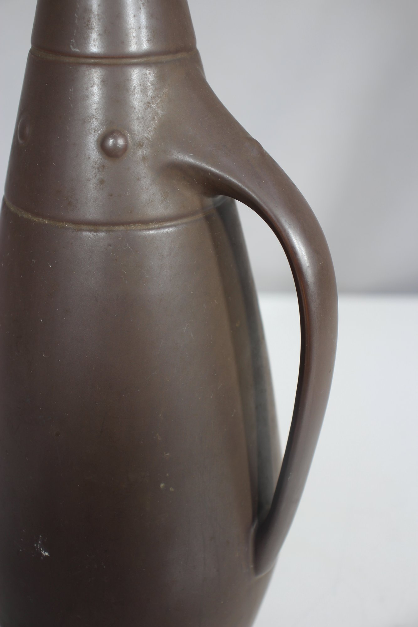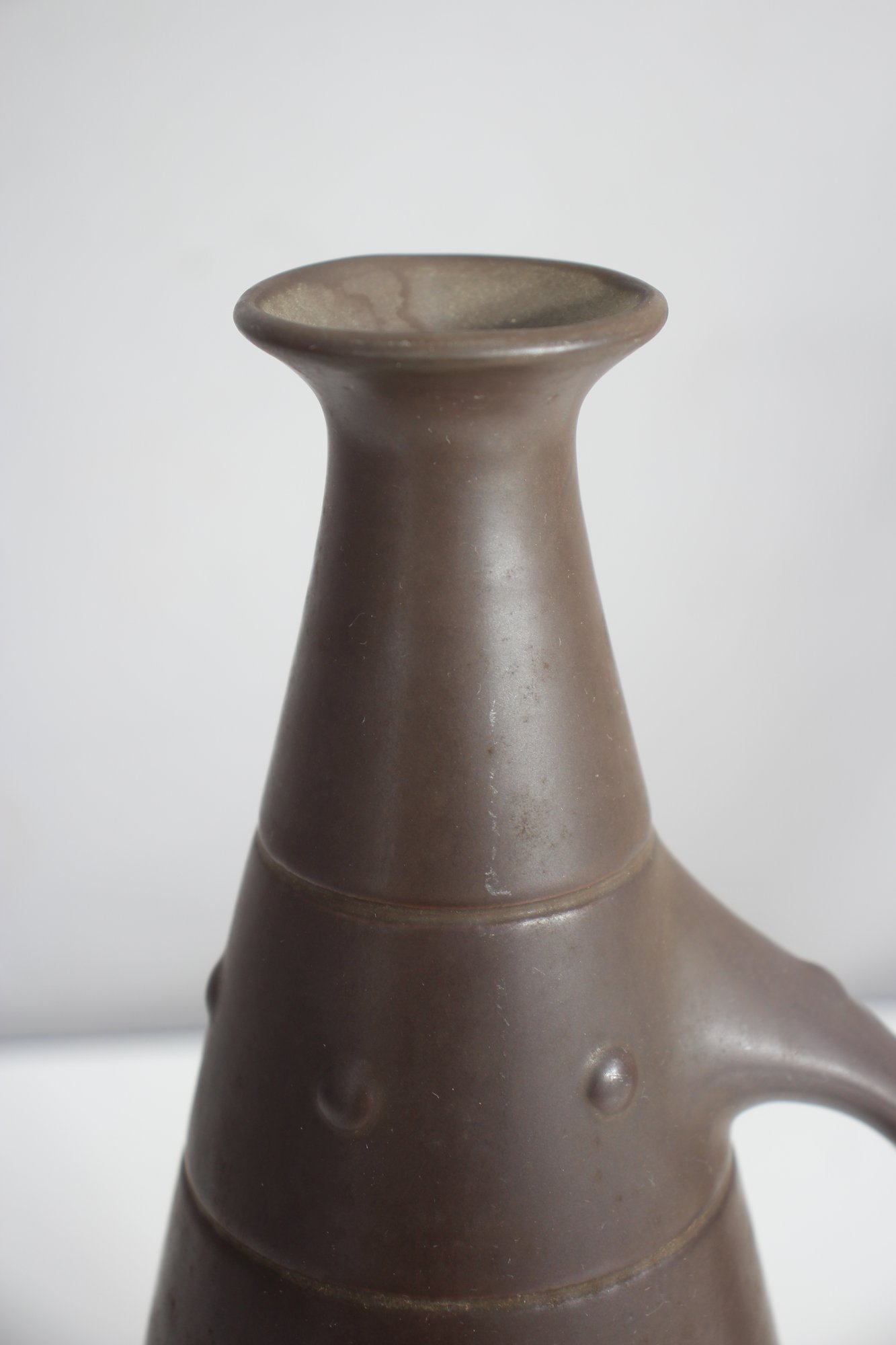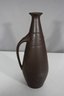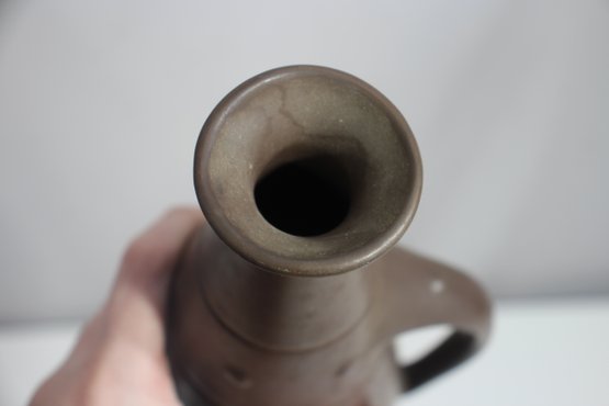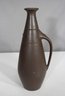 This is a stunning mid-century modern ceramic ewer/pitcher, featuring a sleek, elongated form with a matte brown finish. The unique, sculptural silhouette is complemented by a gracefully curved handle and subtle raised decorative accents.