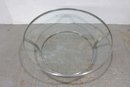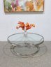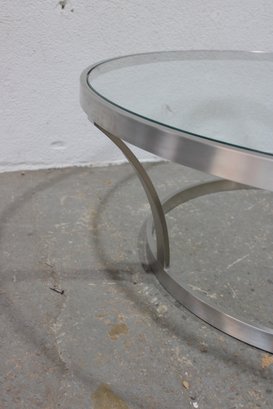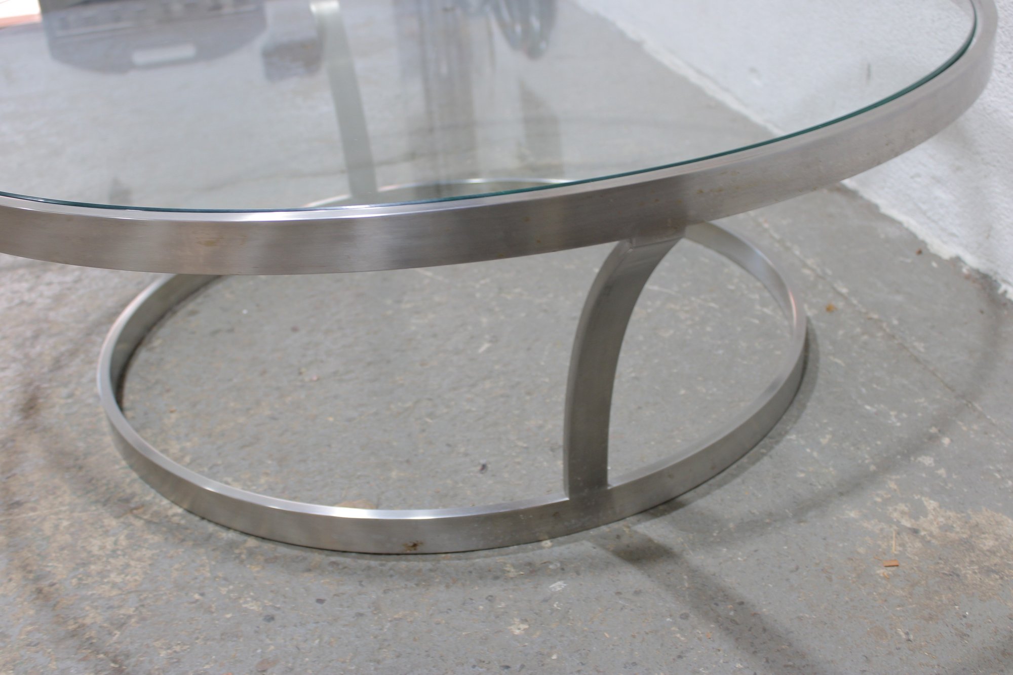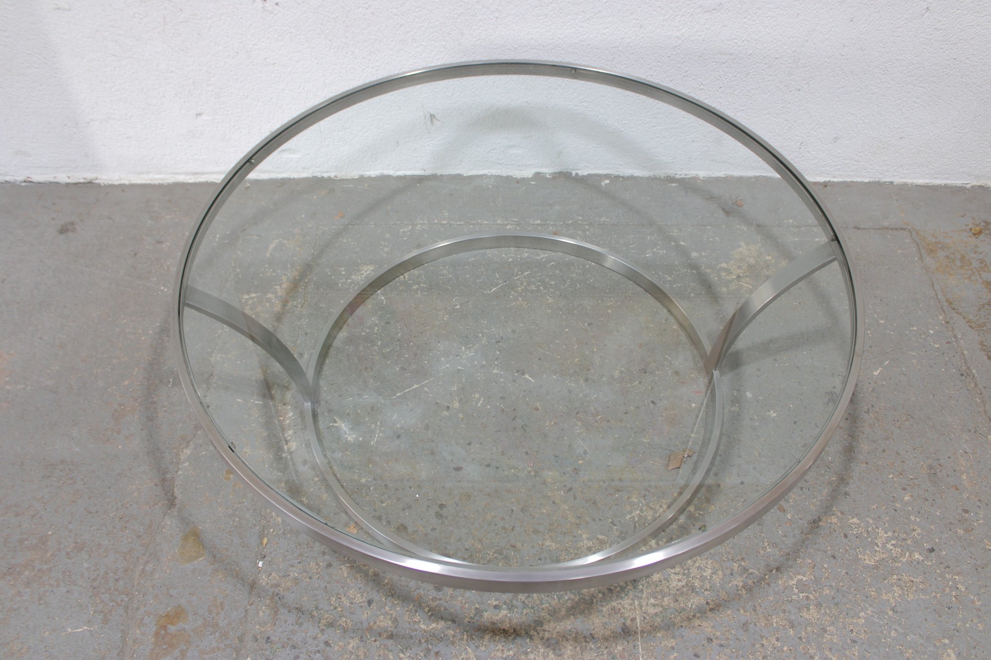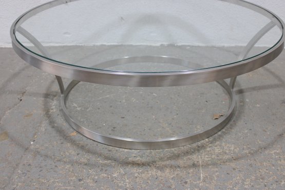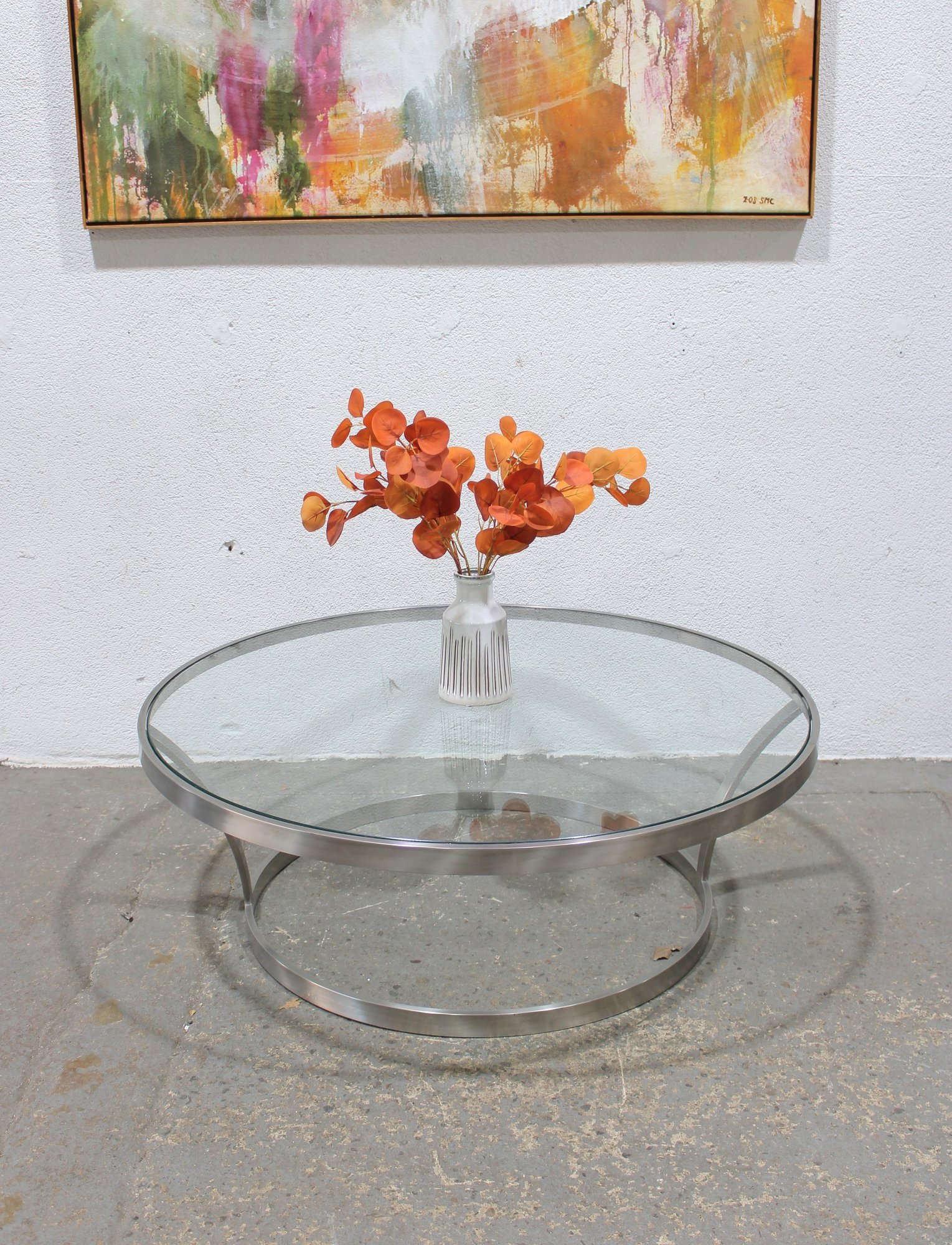 Mid-Century Modern coffee table featuring a clear glass top paired with a polished chrome base. The clean circular design and open frame construction give this piece a light, airy presence—perfect for modern and contemporary interiors.