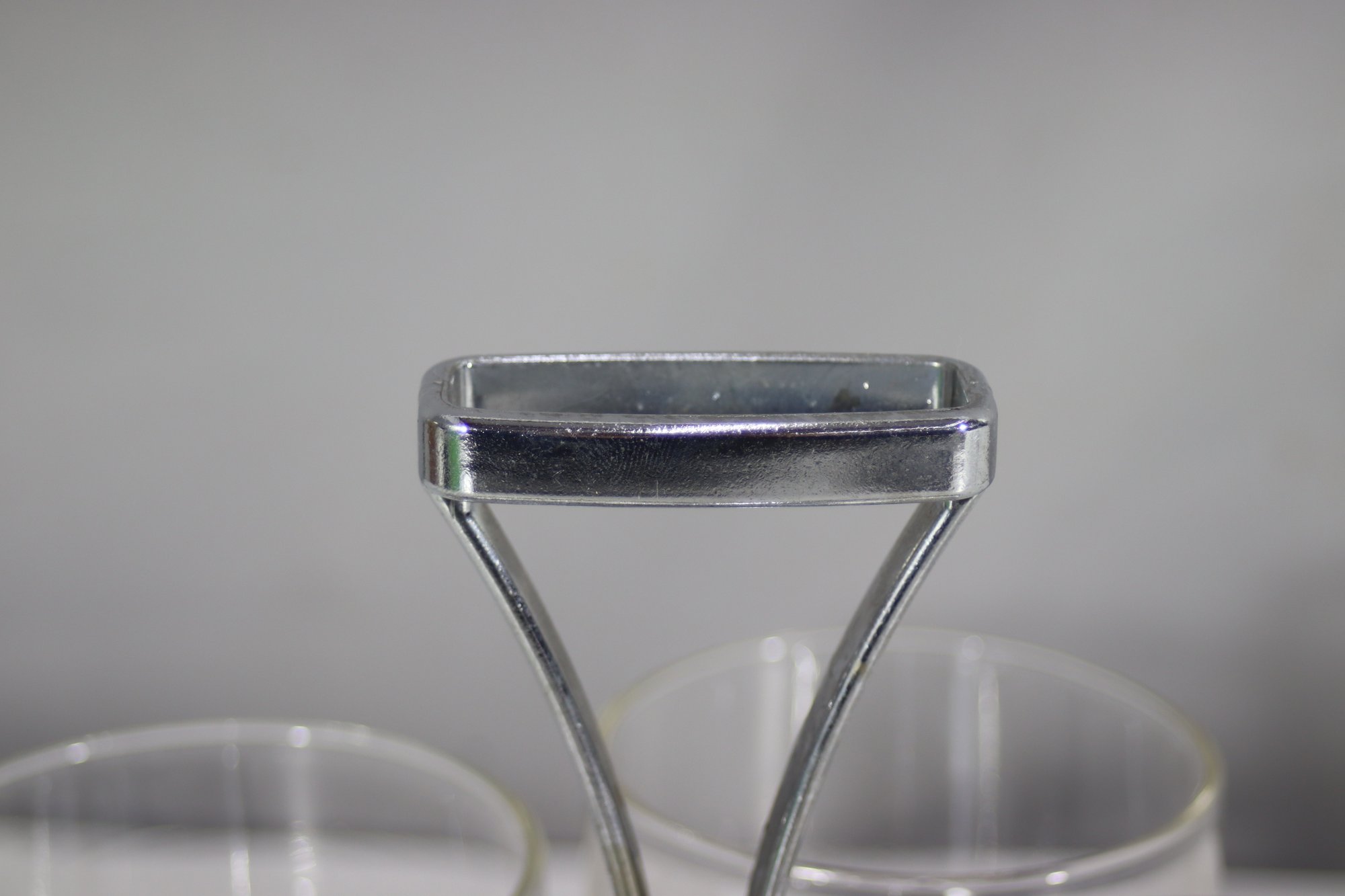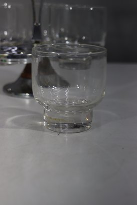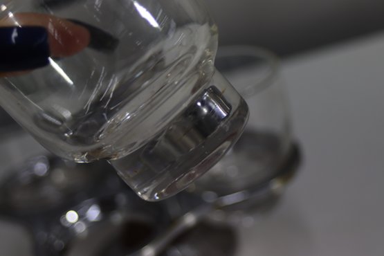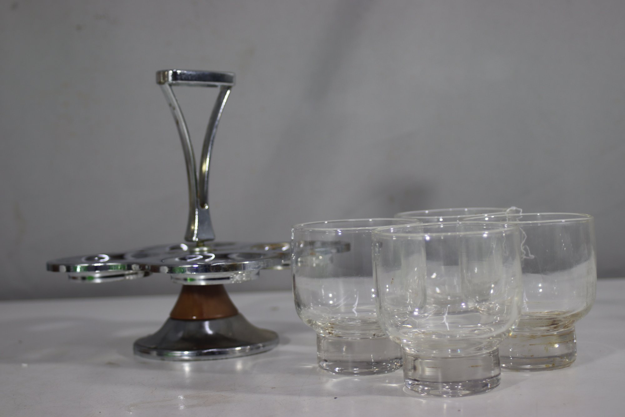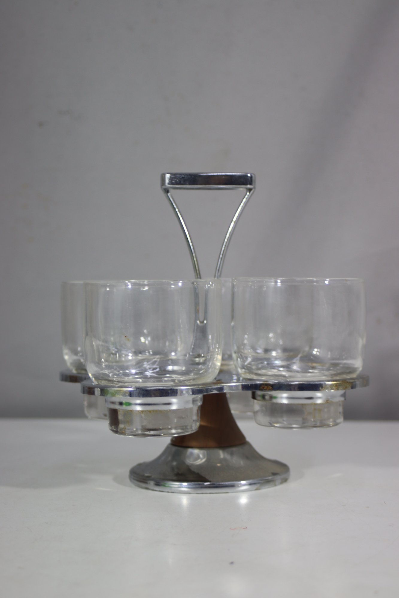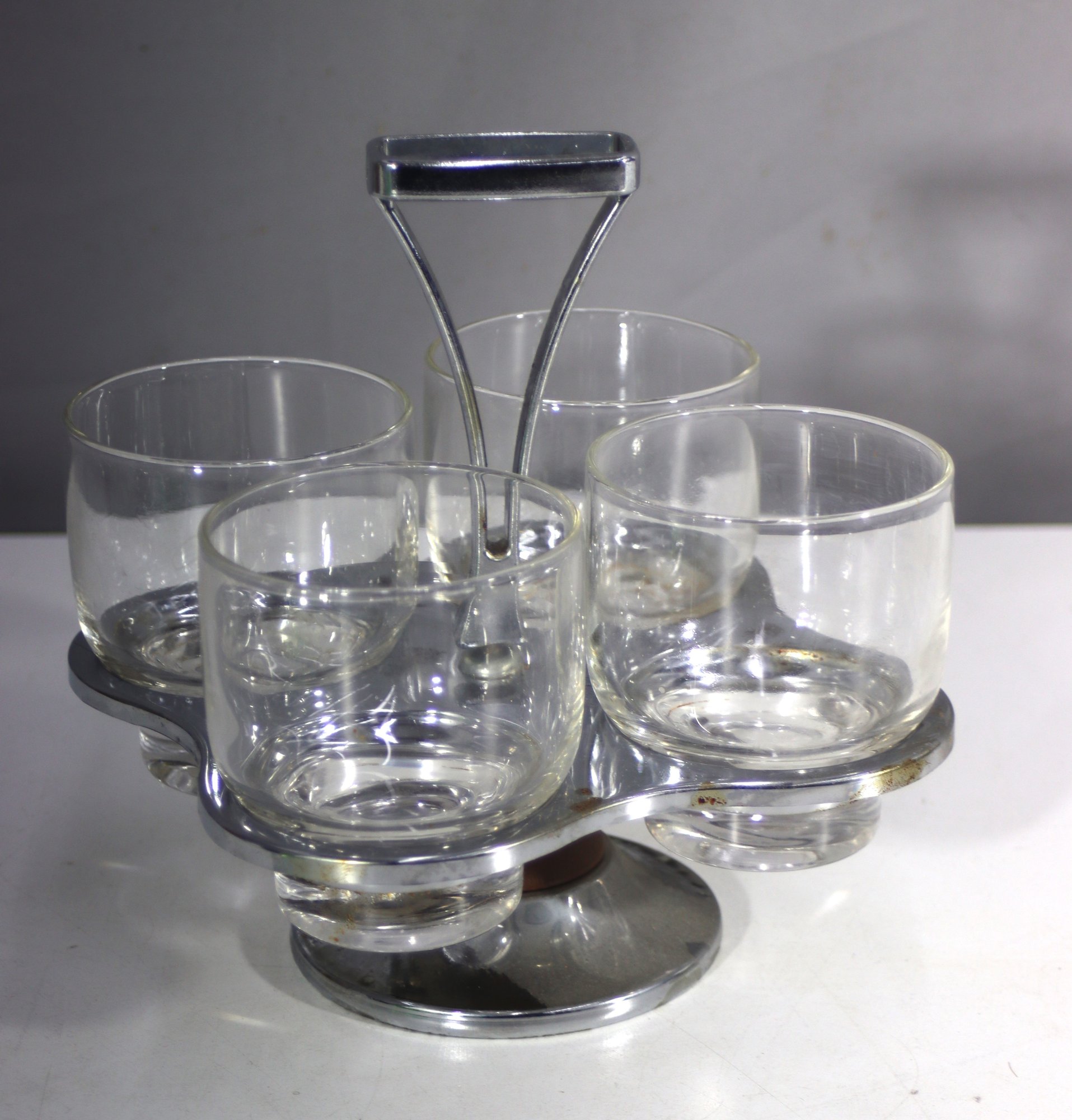 A stylish mid-century modern cocktail glass set featuring four short glasses with a thick glass base, housed in a chrome and wood rotating stand. The stand has a sleek handle for easy carrying. Some tarnishing and signs of age on the metal, adding vintage appeal. A great set for entertaining or display.