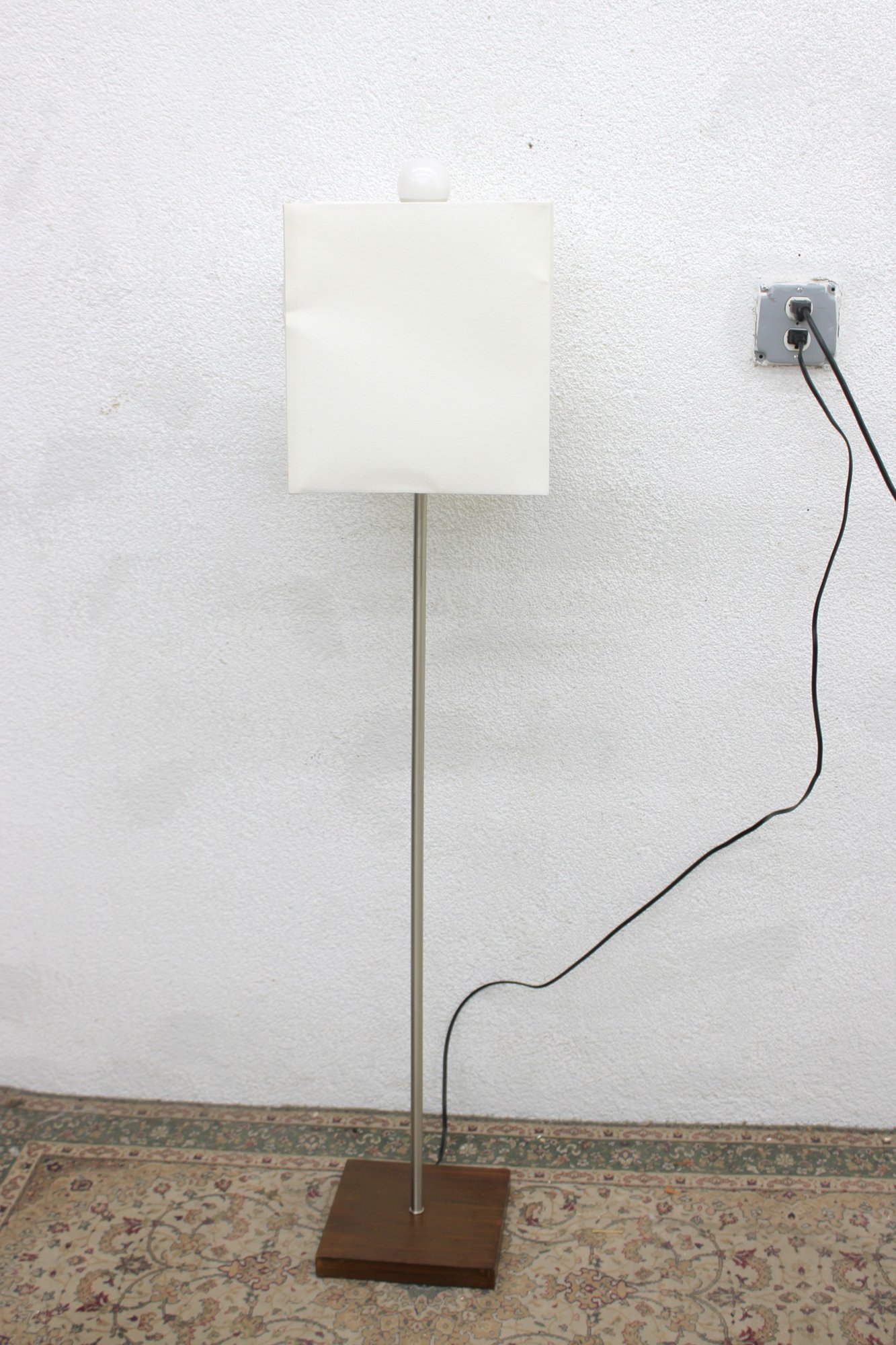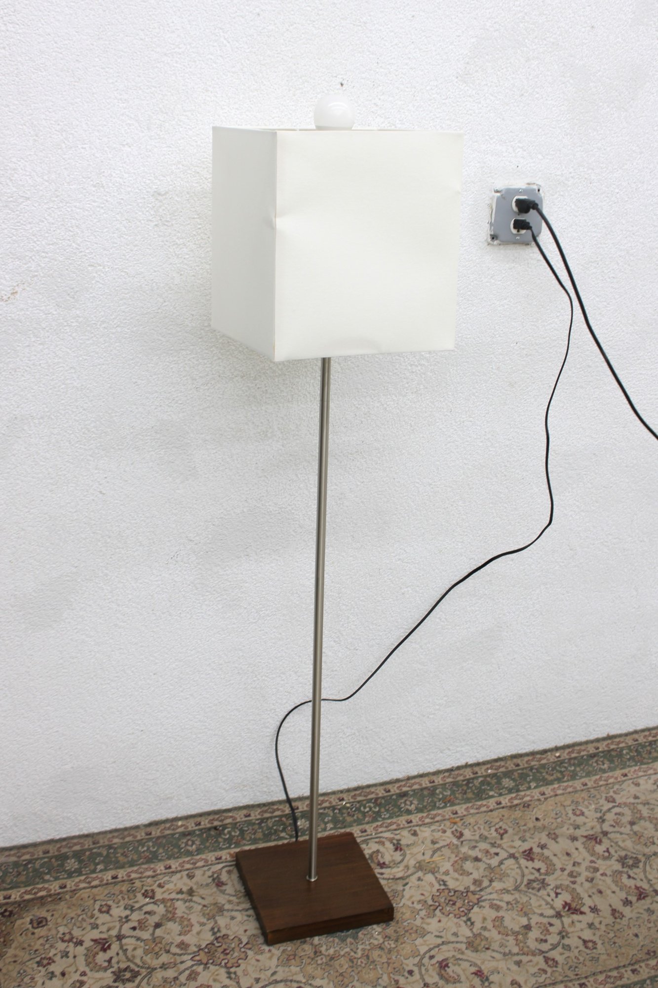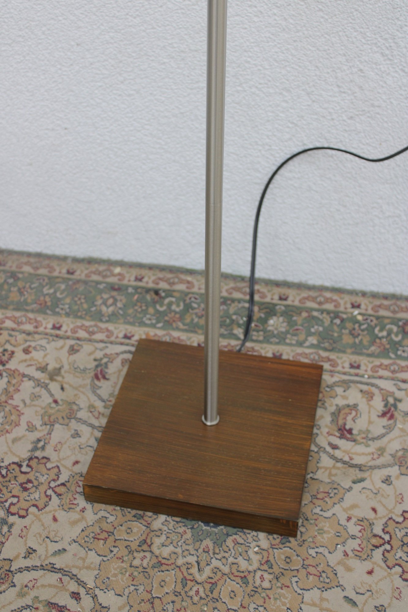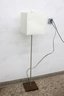 mid century modern style floor lamp featuring a clean minimalist design with a slender metal stem, square white shade, and a warm wood base. The simple geometric form gives the lamp a sleek modern look that works well in contemporary, mid-century, or minimalist interiors.