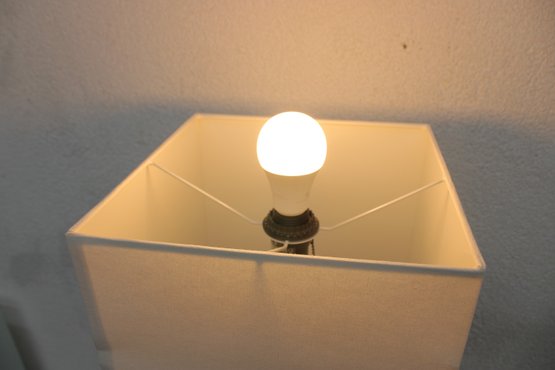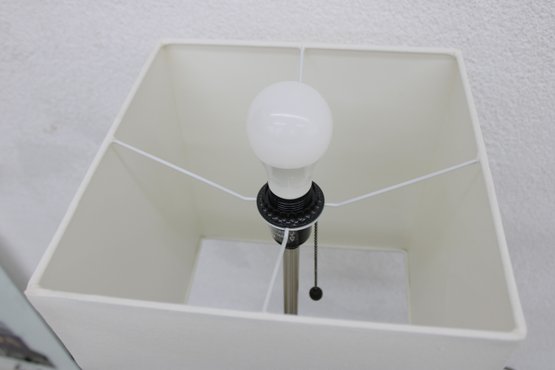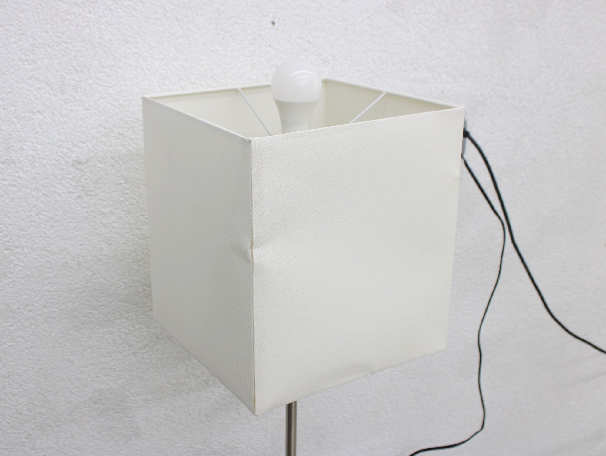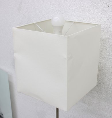 The lamp stands on a square wood base with a vertical metal pole and is topped with a square white shade that softly diffuses light. The neutral color palette makes it versatile for use in a living room, bedroom, office, or reading corner.