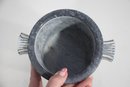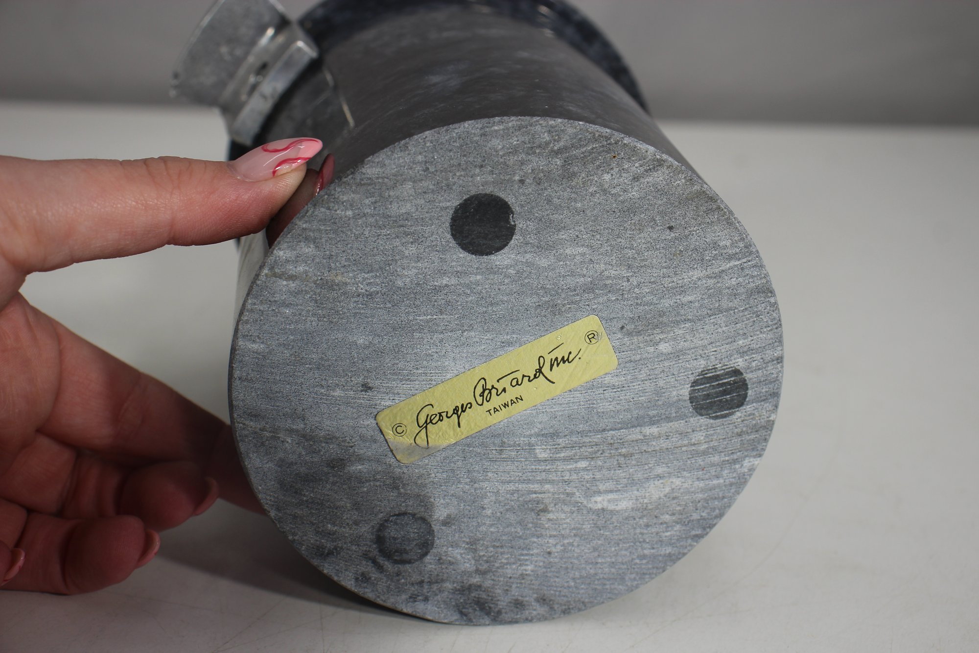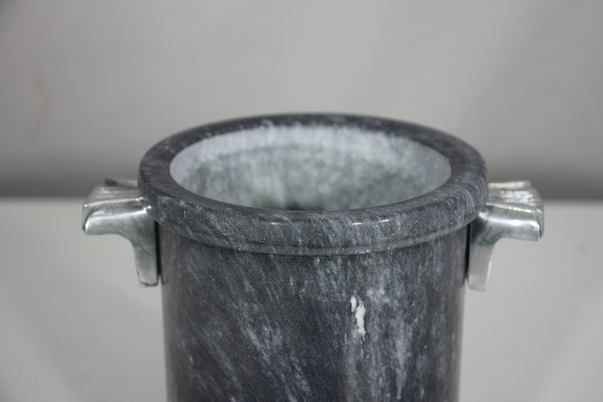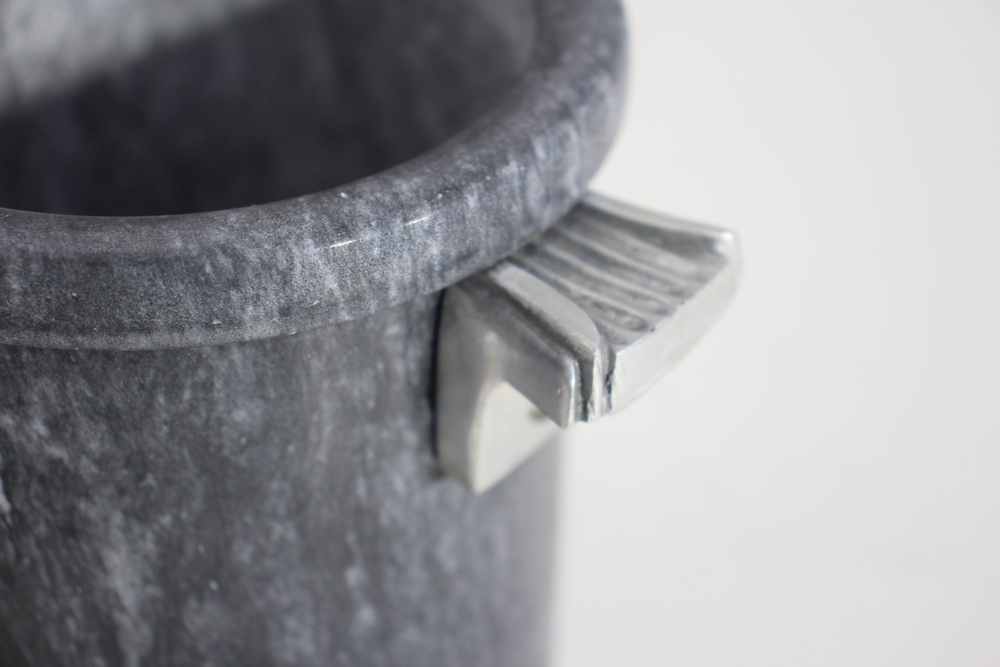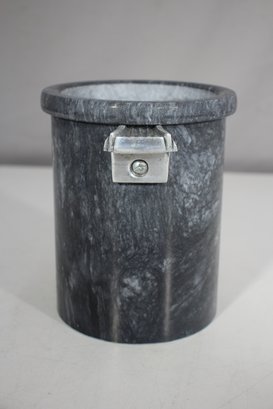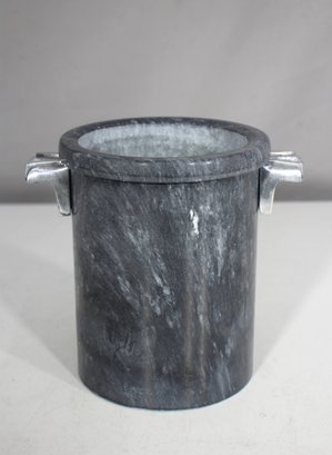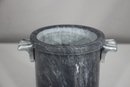 a stunning Mid-Century Modern (MCM) ice bucket designed by the renowned artist George Briard. This rare and collectible piece features a solid stone body with a beautiful marbled gray texture, complemented by elegant metal handles with a sleek Art Deco-inspired design.