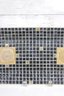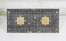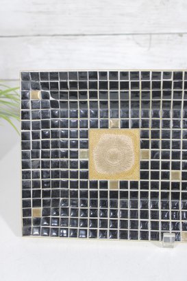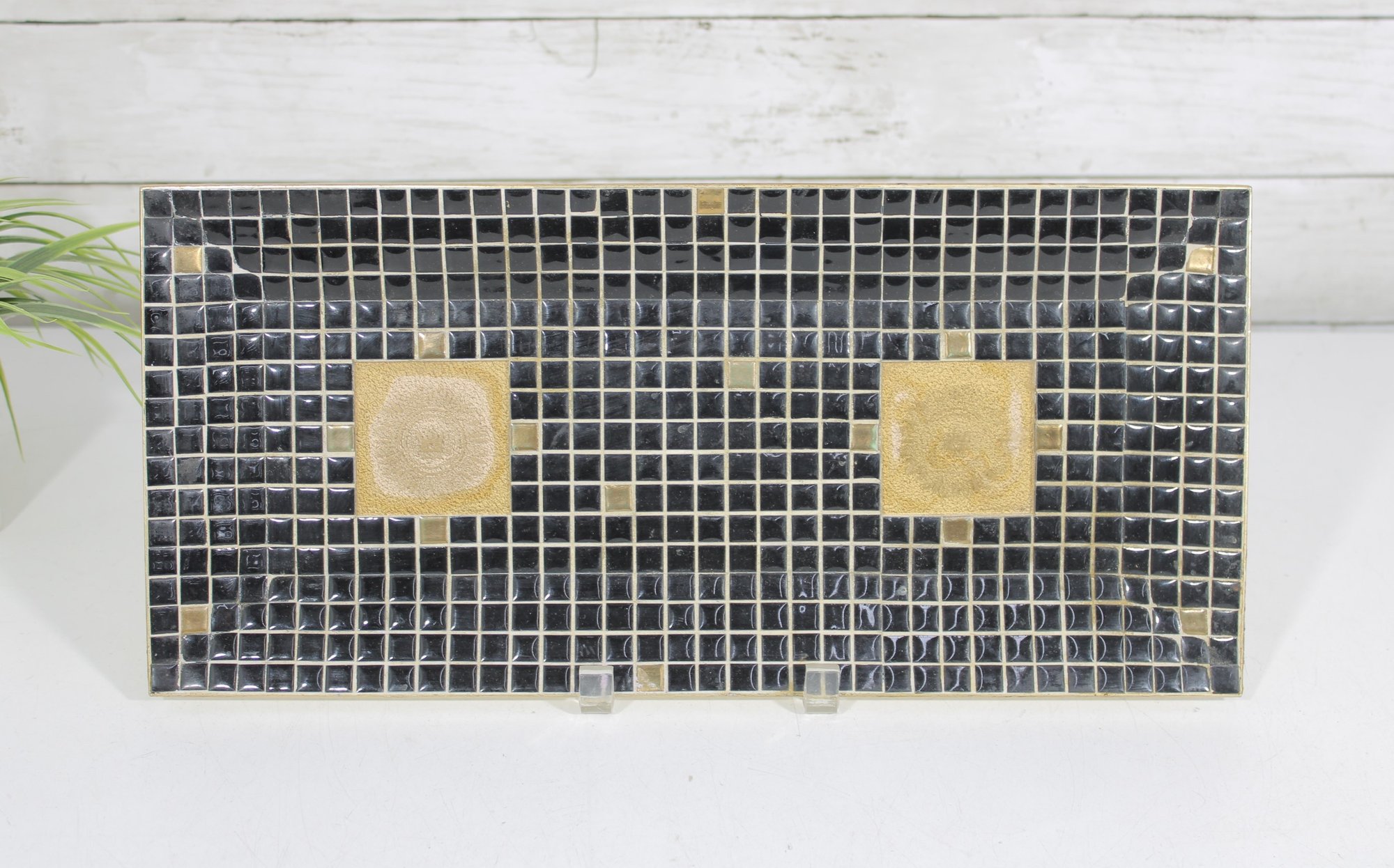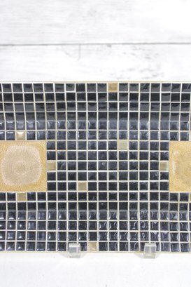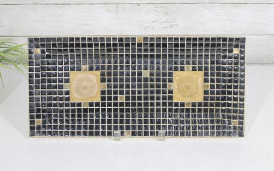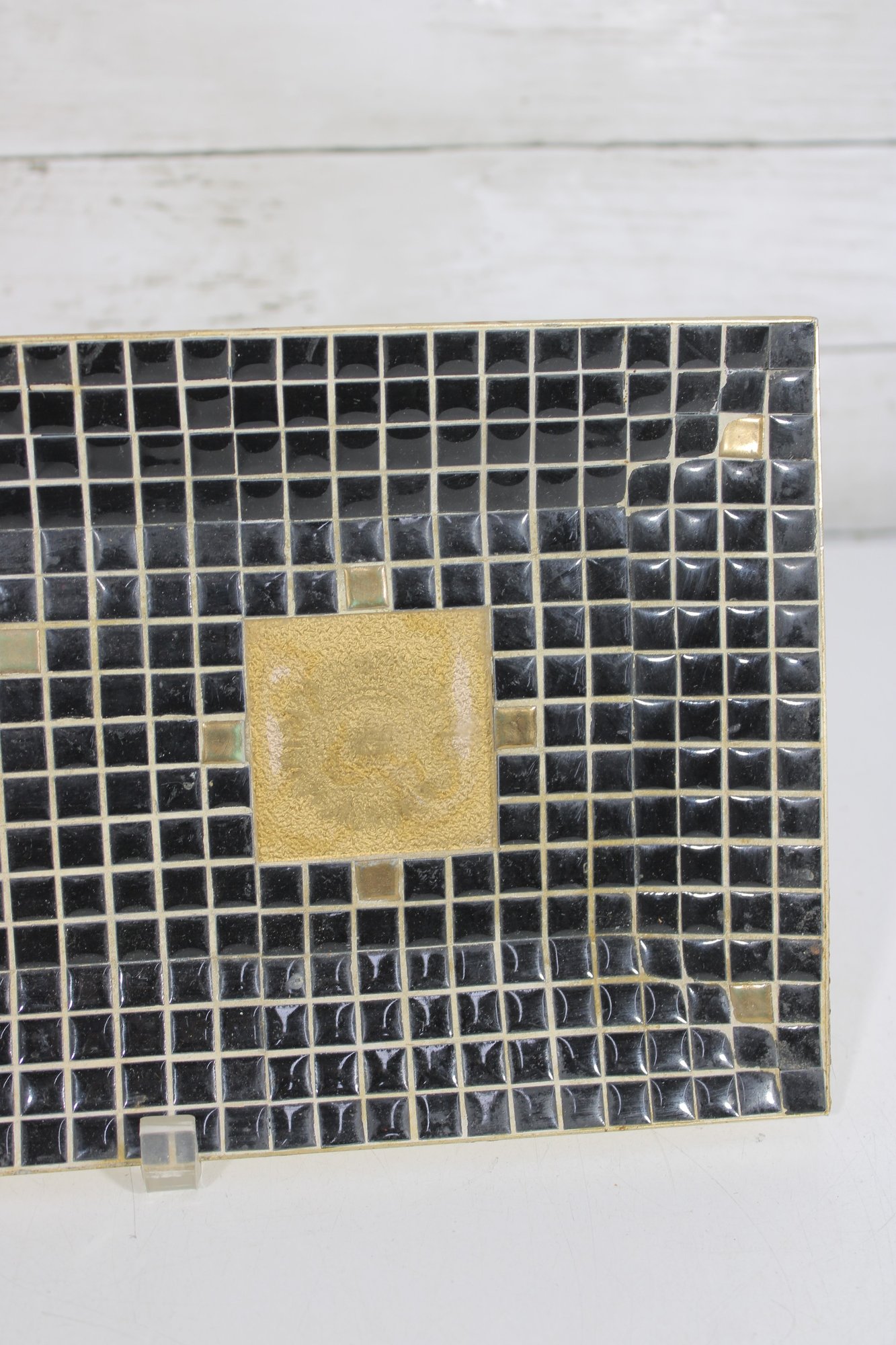 vintage mid-century modern serving tray attributed to Georges Briard, featuring a striking black and gold mosaic tile design. The top displays a grid pattern accented with two bold gold square medallions, creating a sophisticated and iconic MCM aesthetic.