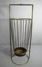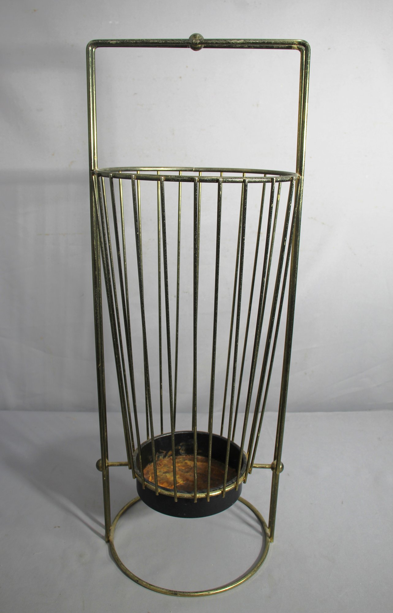a touch of vintage charm to your entryway with this mid-century modern umbrella stand. Crafted from gold metal, this stand features an elegant vertical design with a round, sturdy base, ensuring stability and style. The slim, vertical bars allow for ample air circulation, helping umbrellas dry more efficiently while maintaining a neat appearance. The aged patina and some signs of wear add character, emphasizing its historical value and authentic mid-century appeal.