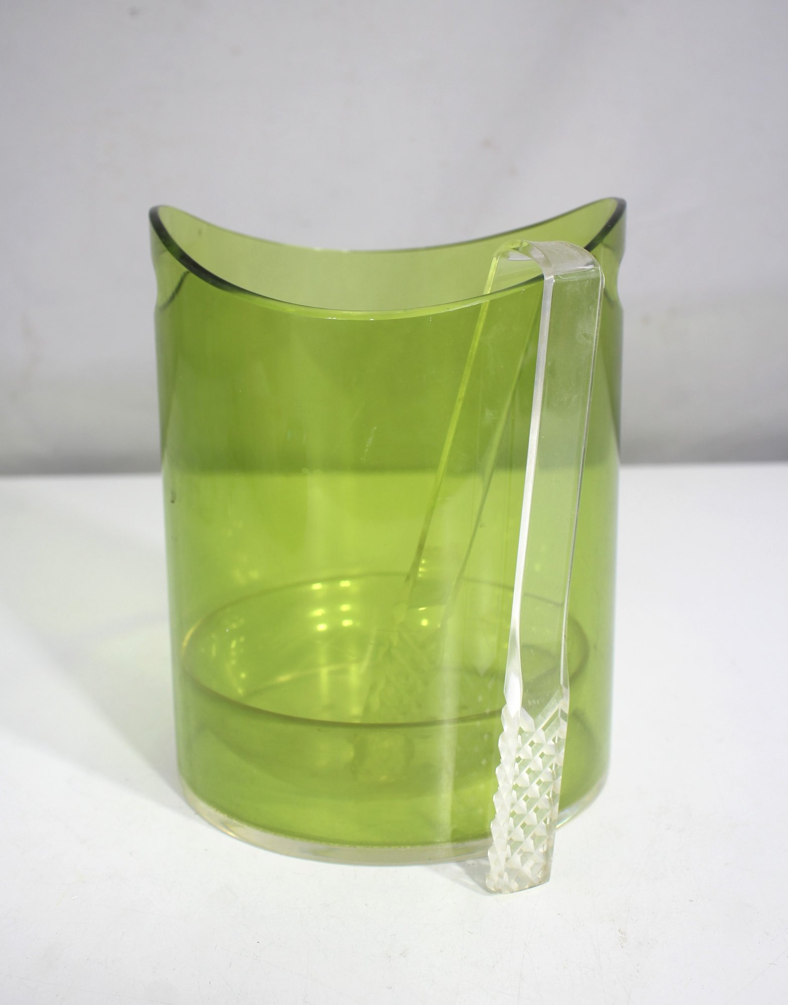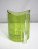Stylish and functional, this mid-century modern green glass ice bucket brings a bold pop of color and sleek design to any bar or entertaining setup. The translucent lime-green body features a sculptural crescent-shaped open top and integrated side handles, combining form and function effortlessly.