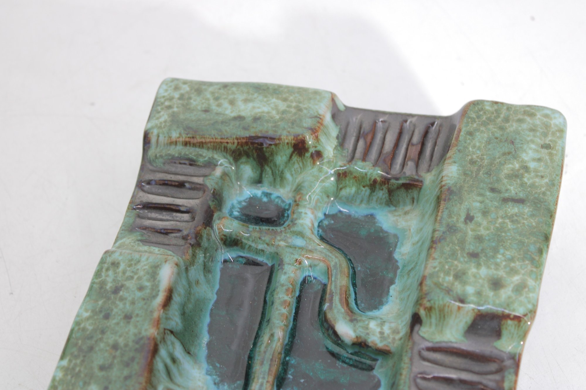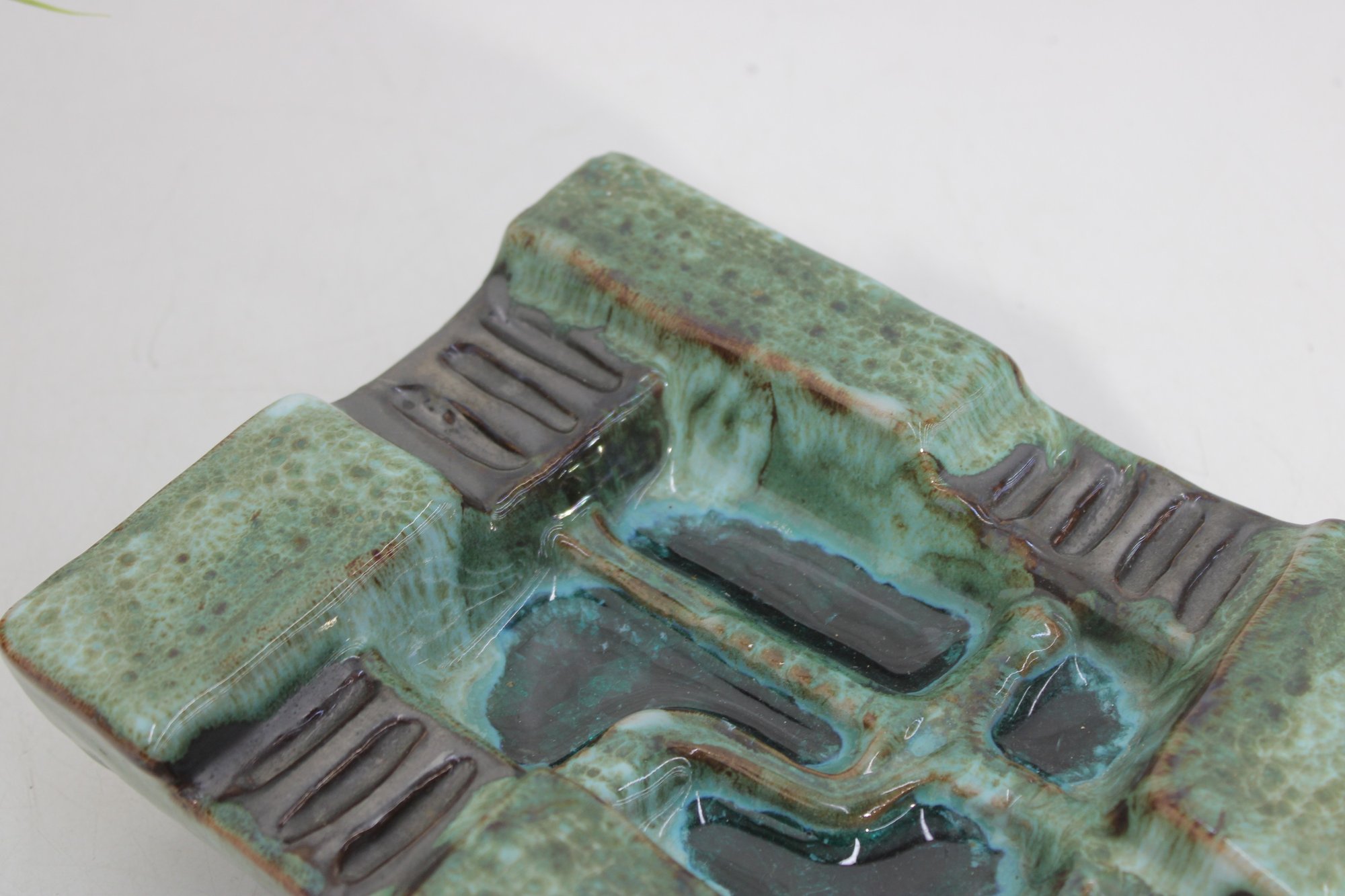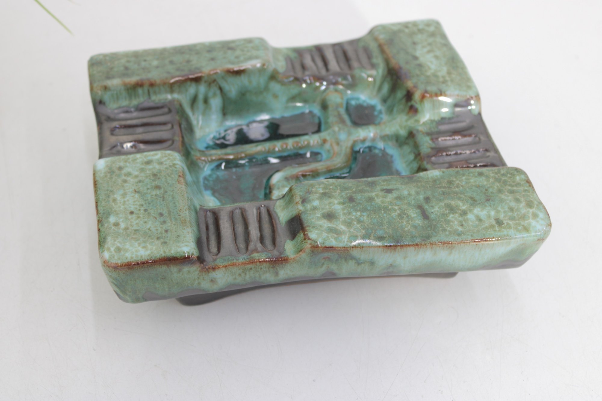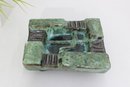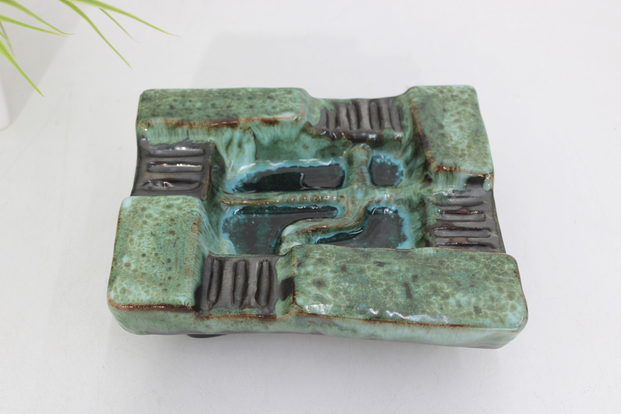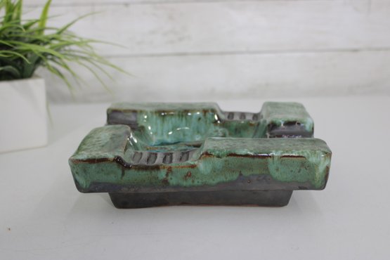 This substantial ceramic piece showcases a sculptural design with four cigarette rests at the corners and a recessed center. The glaze displays wonderful variation, with rich green pooling and organic movement throughout. The underside reveals an unglazed foot rim.