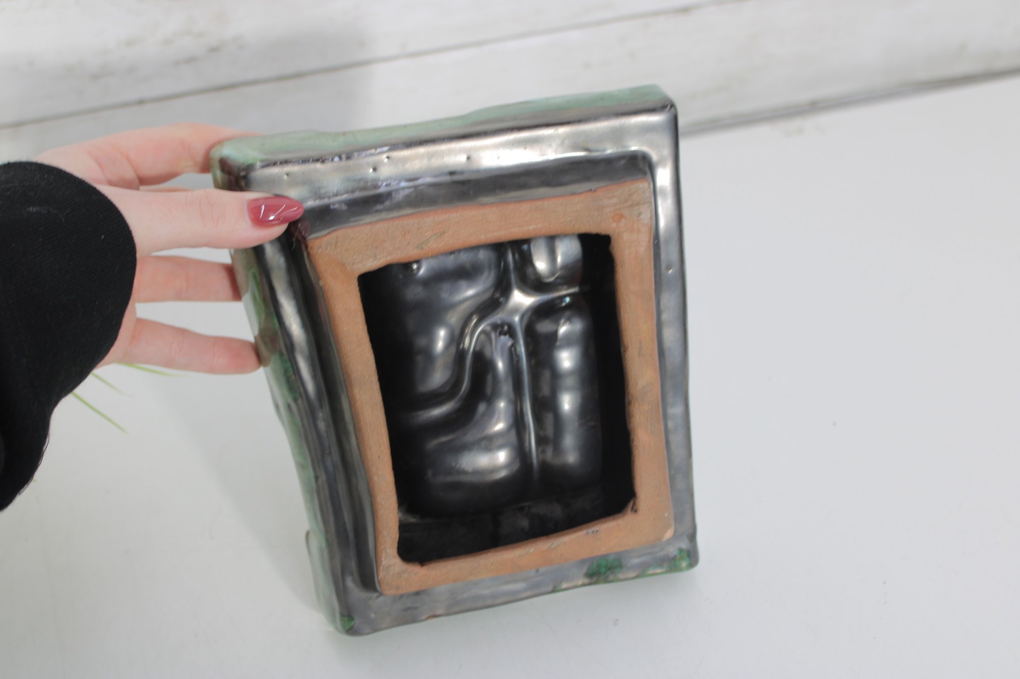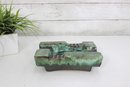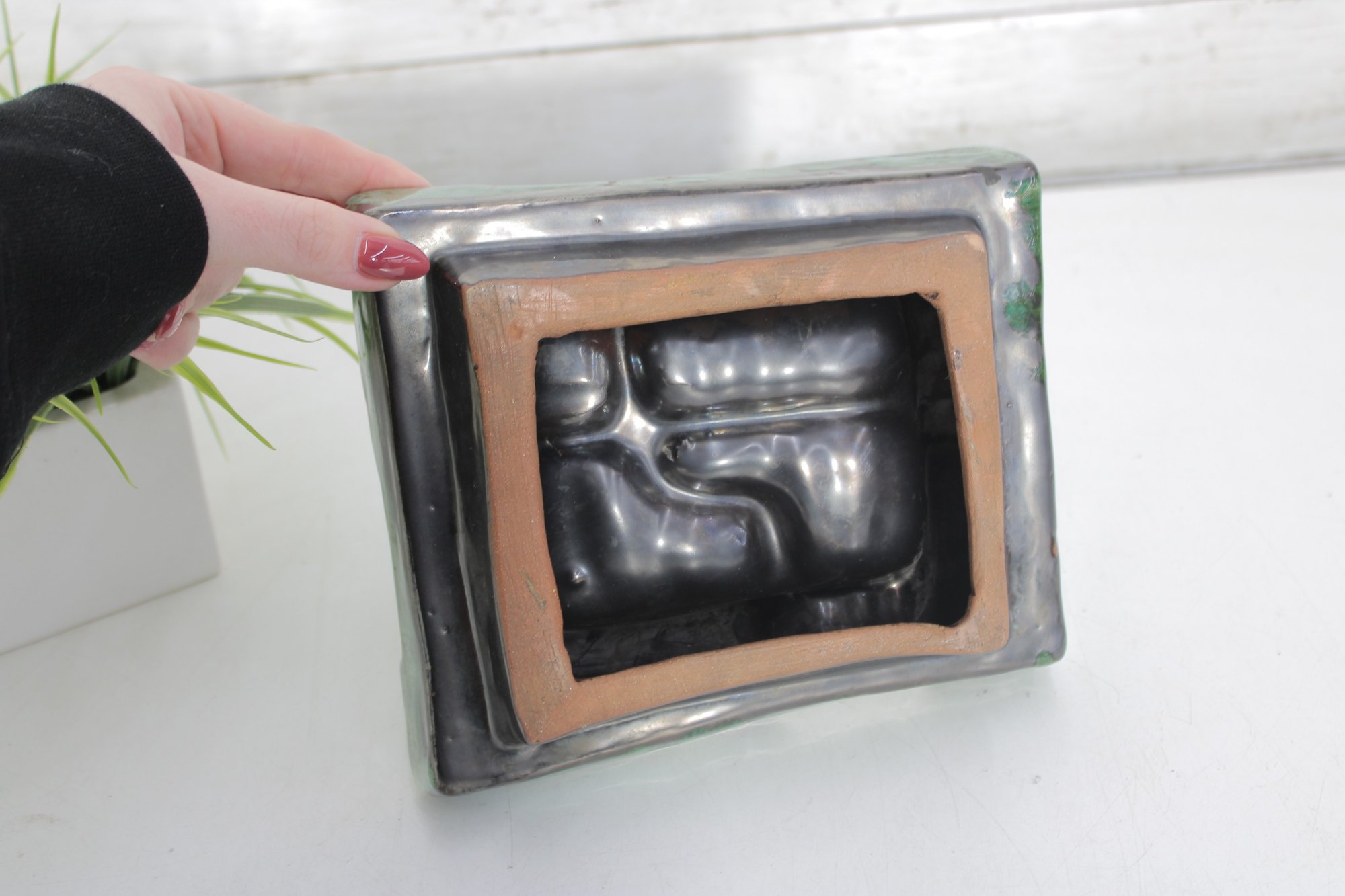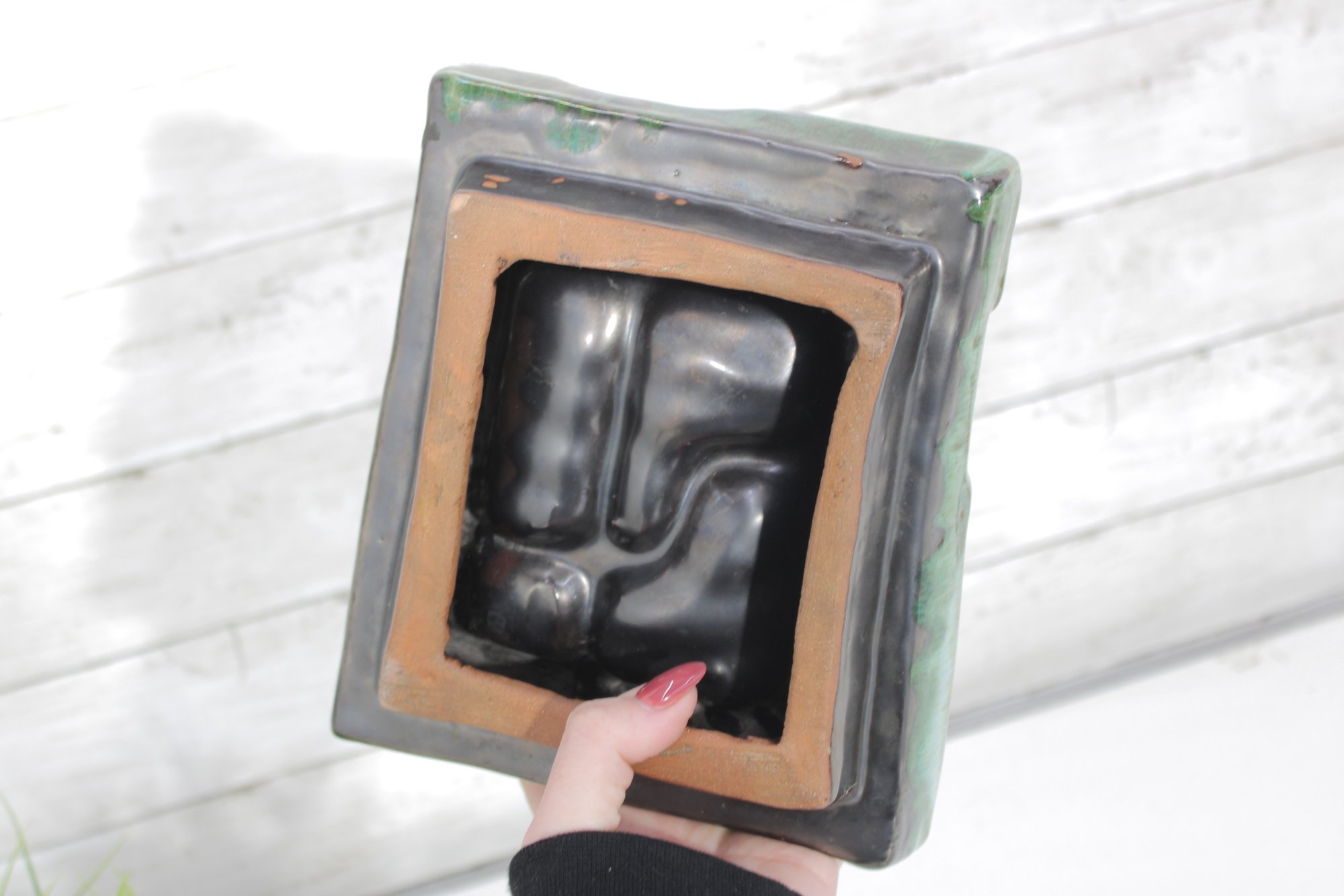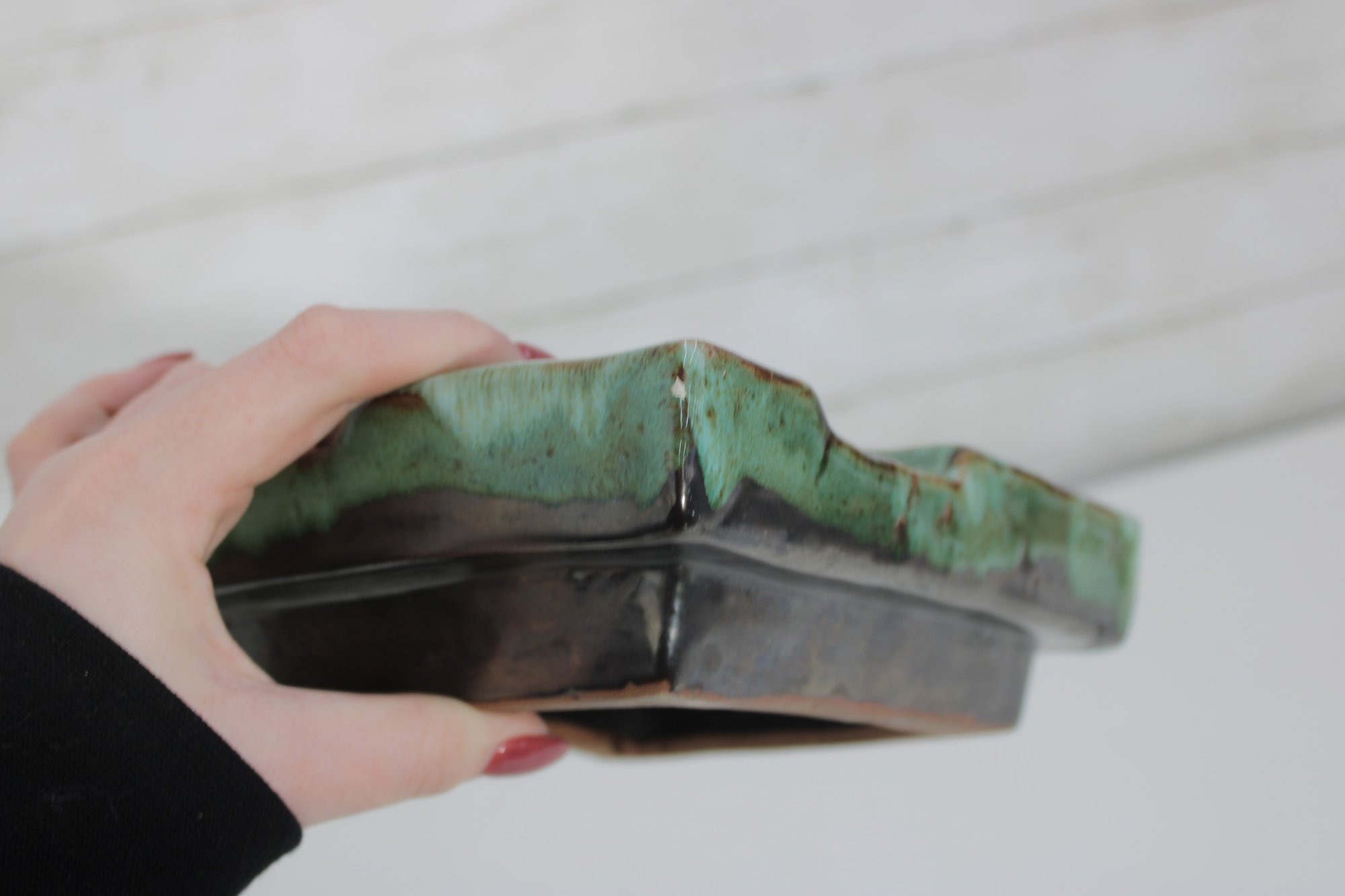 This substantial ceramic piece showcases a sculptural design with four cigarette rests at the corners and a recessed center. The glaze displays wonderful variation, with rich green pooling and organic movement throughout. The underside reveals an unglazed foot rim.