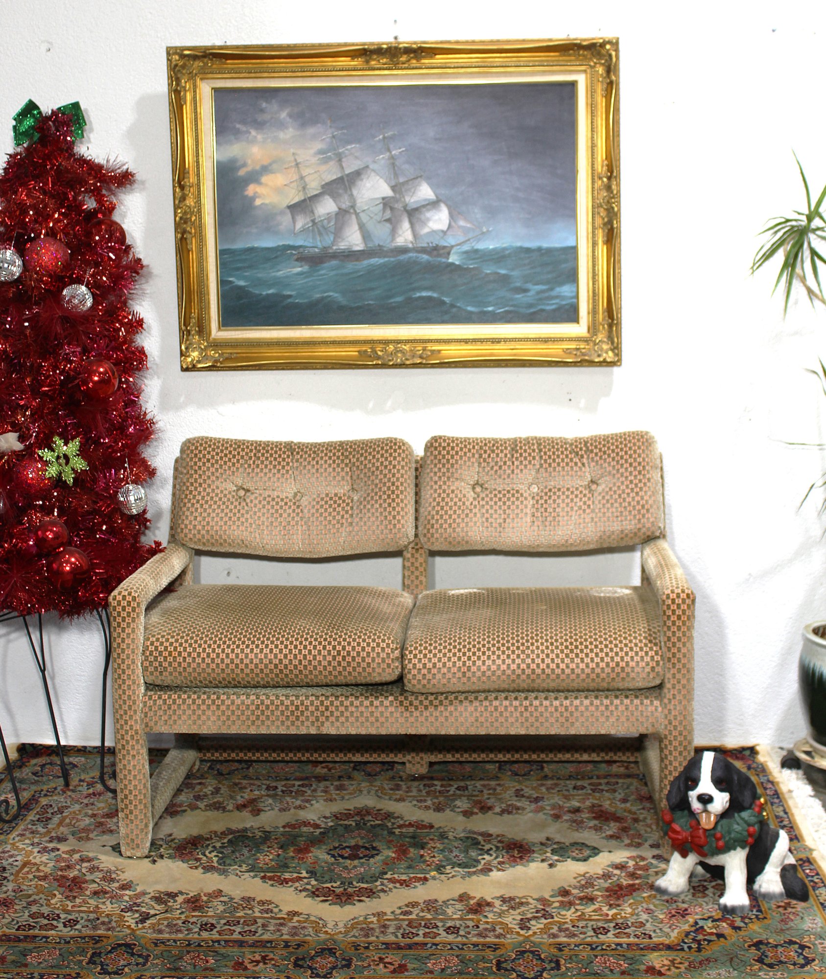 A stylish mid-century modern two-seat sofa featuring a geometric-patterned upholstery in muted tones. The design includes tufted backrests, a sturdy wooden frame, and cushioned armrests, providing both comfort and durability. The clean lines and compact size make this sofa ideal for smaller spaces or as an accent piece in a modern or vintage-inspired living area. Light wear and some signs of age on the upholstery; see photos for details. A versatile and timeless addition to any home decor collection!