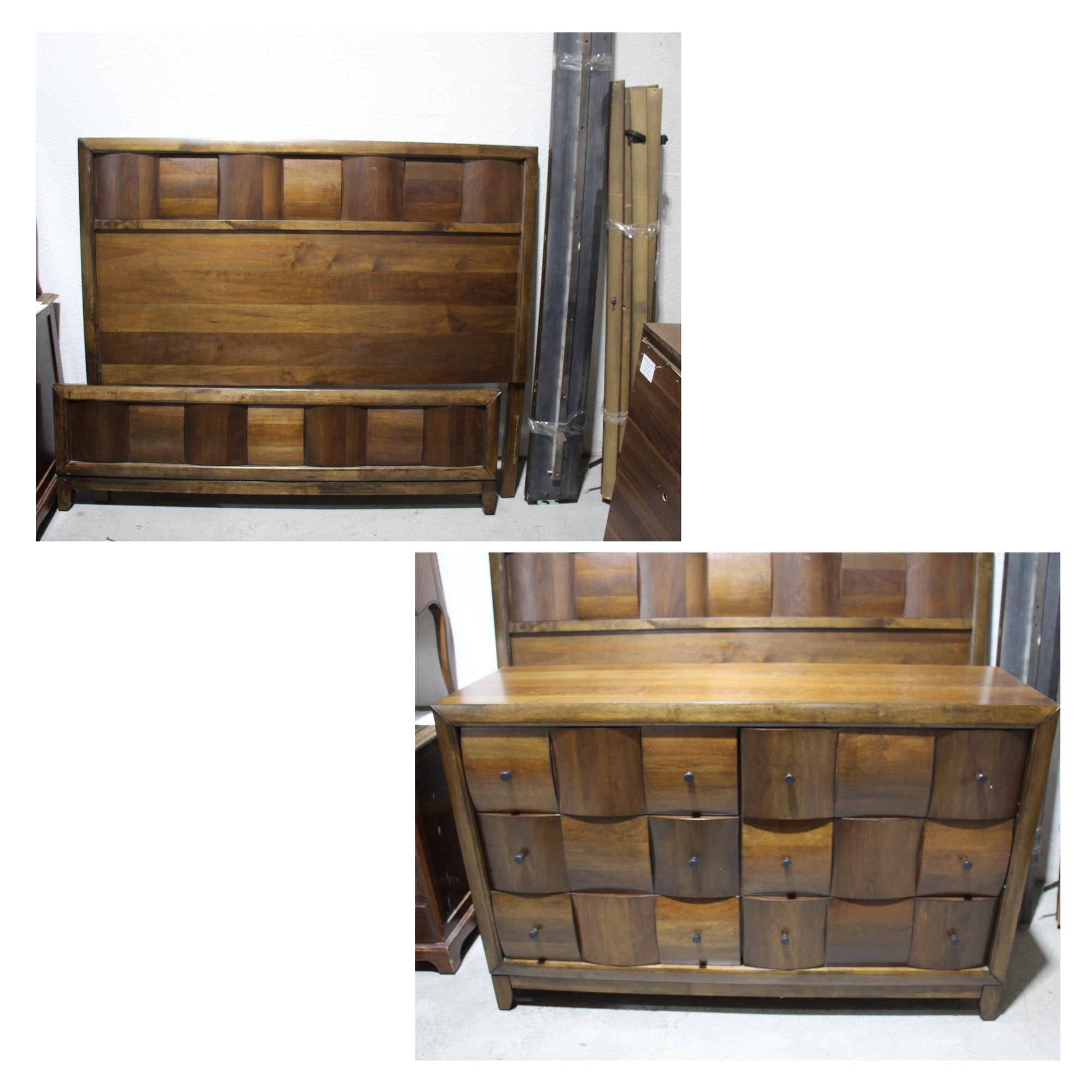 This beautifully crafted mid-century modern bedroom set includes a walnut bed frame and a matching dresser, perfect for adding a warm, vintage touch to any bedroom. The set showcases clean lines, sturdy construction, and unique panel detailing that captures the essence of mid-century design.