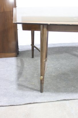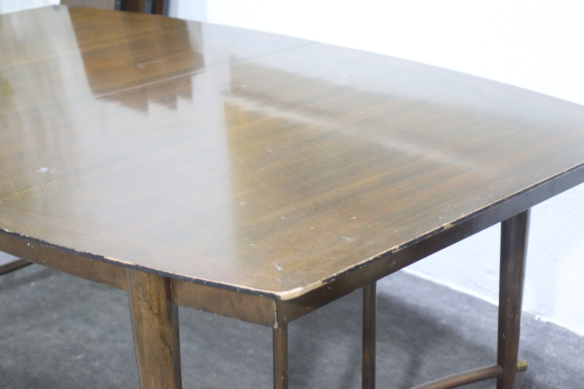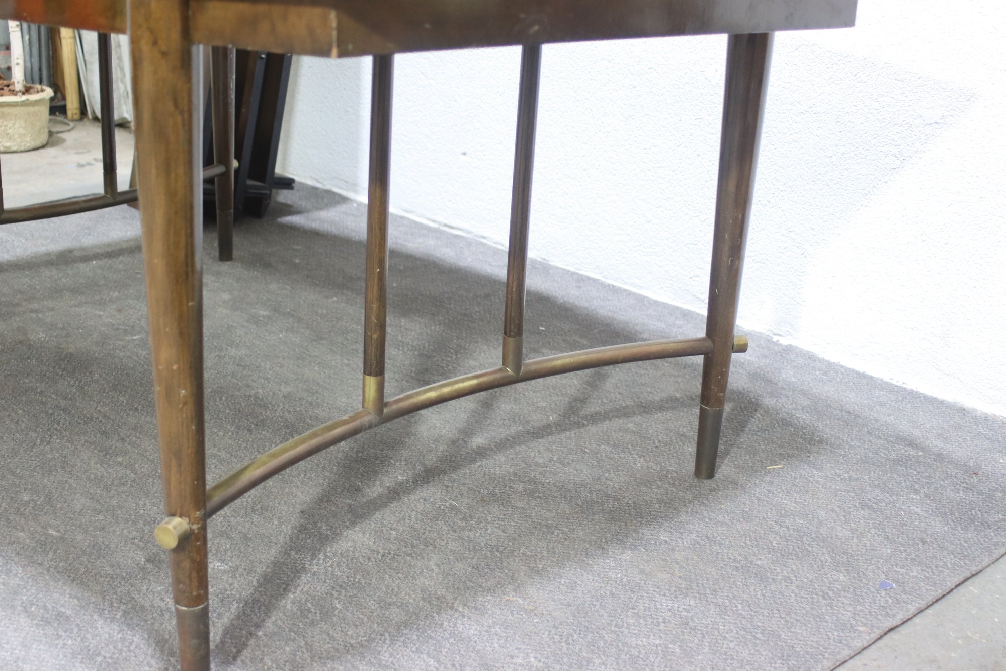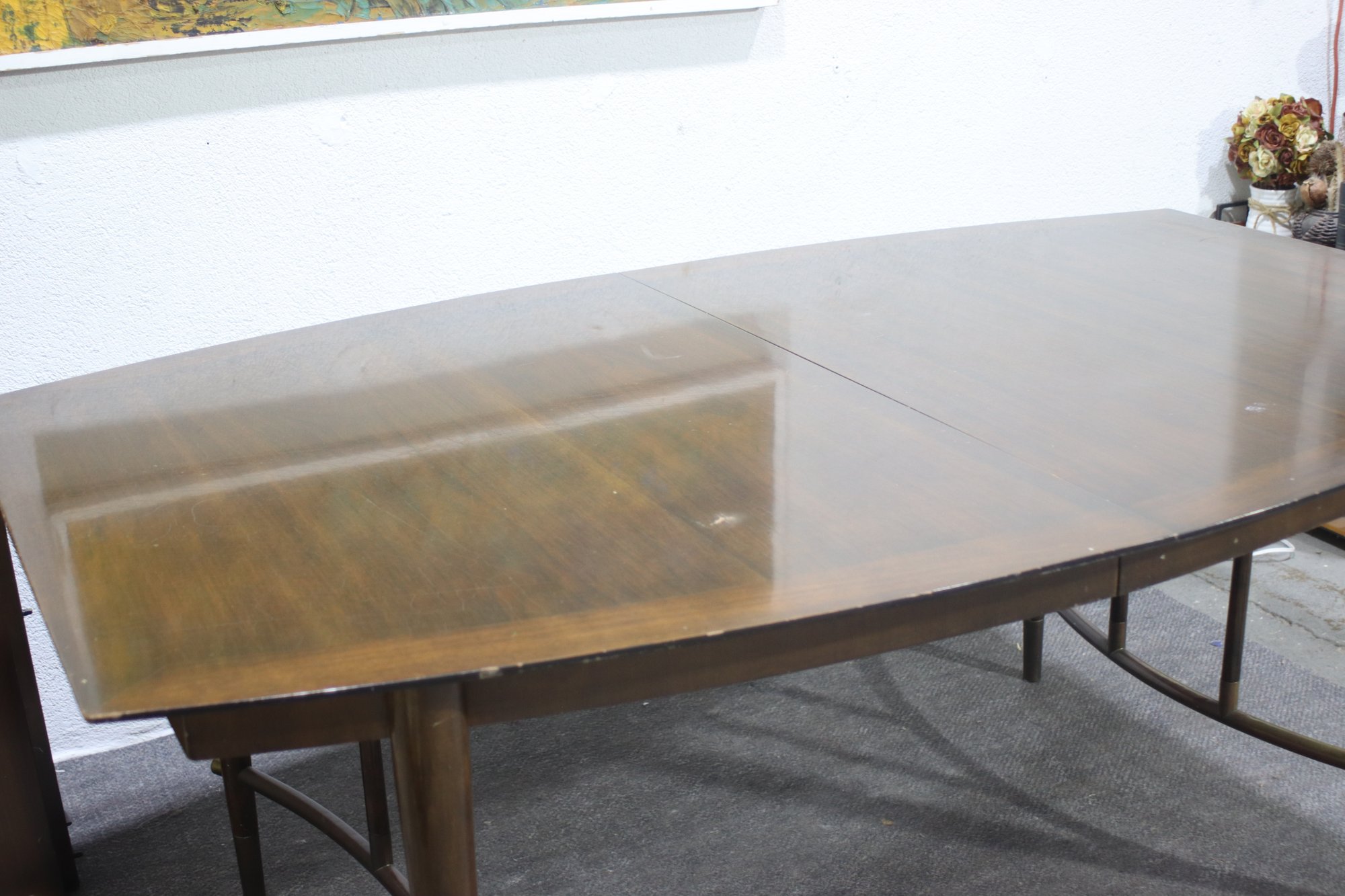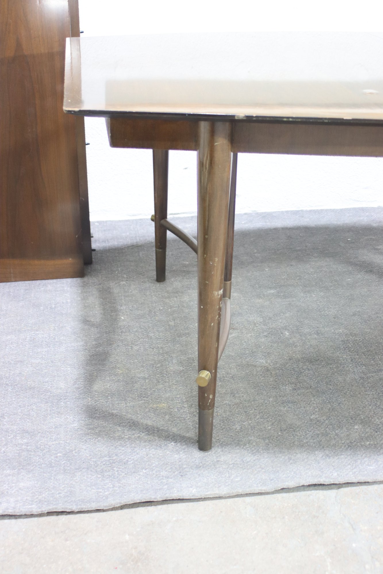This stunning mid-century modern dining table features a rich walnut wood construction accented with brass details for a sleek and sophisticated look. The curved stretcher base with brass caps adds an elegant touch, embodying classic 1950s-1960s design aesthetics. The table also features an expandable top, making it a versatile piece for dining or entertaining.