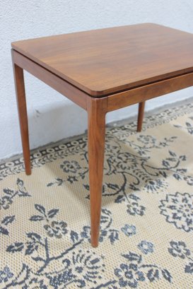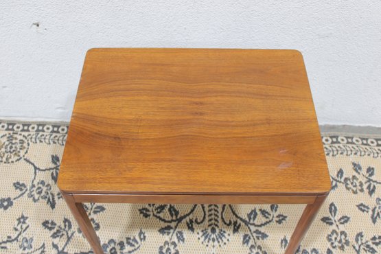 The table showcases a beautifully grained wood top with softly rounded corners and tapered legs, creating a light and refined silhouette. Its compact size makes it perfect as a side table, end table, or nightstand in a variety of settingsāfrom living rooms to bedrooms.