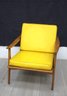 featuring a bold yellow upholstery that is sure to be a centerpiece in any room. This chair combines style with comfort, boasting a sleek wooden frame that displays a rich, warm patina indicative of its age and quality craftsmanship.