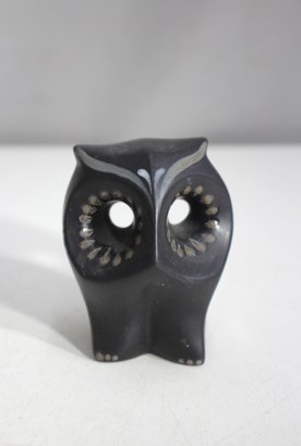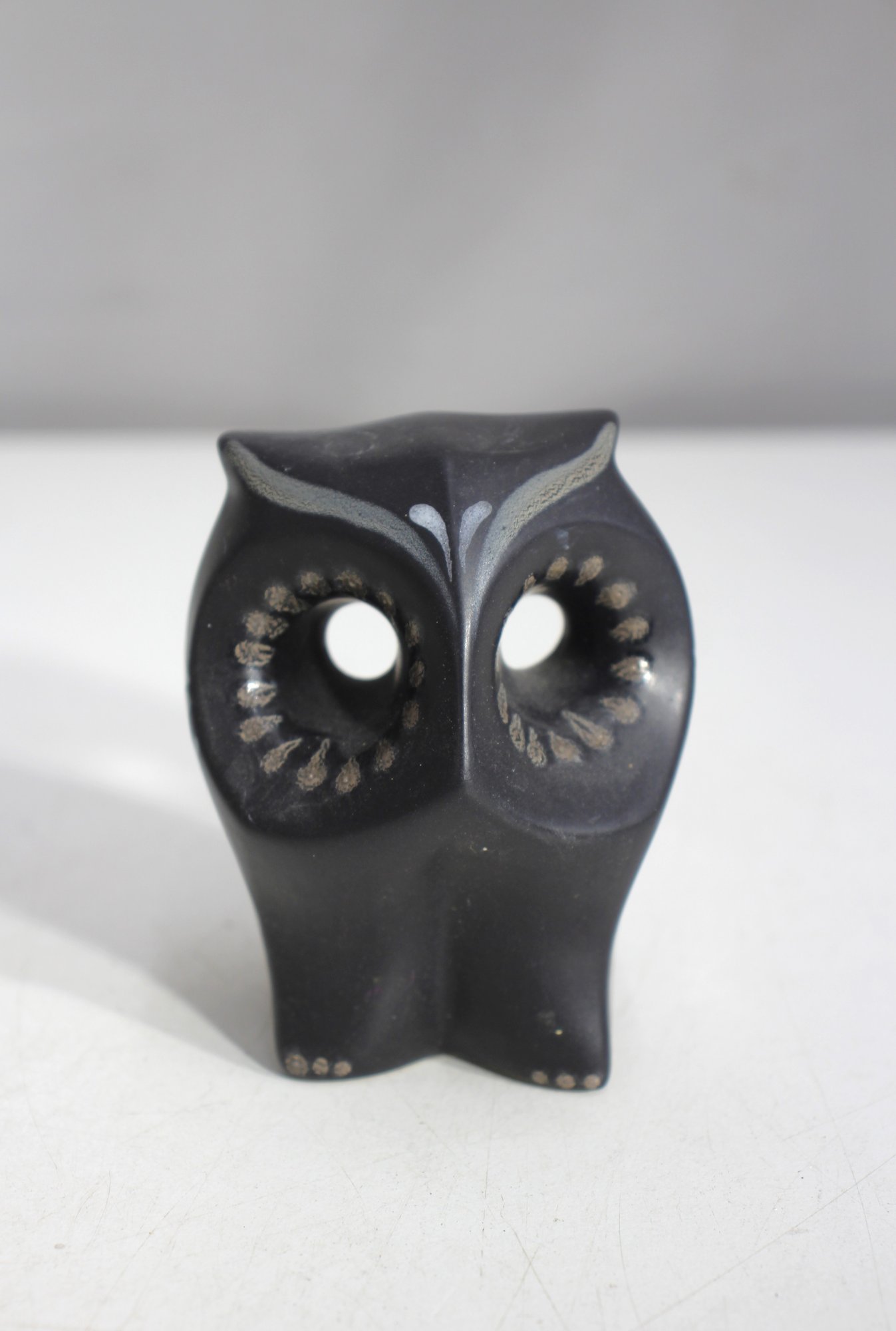 Ceramic with a smooth matte black finish,Stylized owl with cut-out eyes and hand-painted accents
