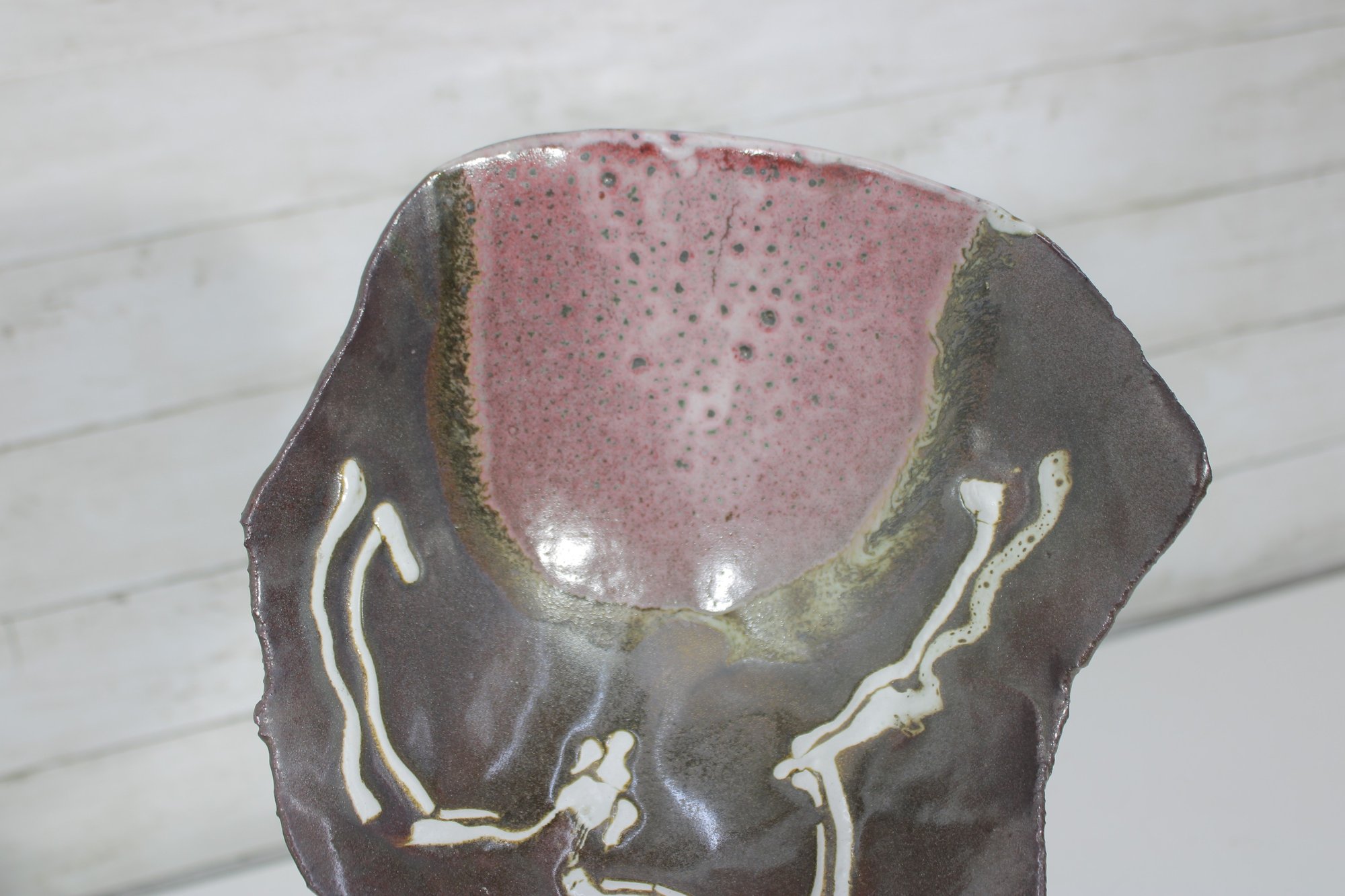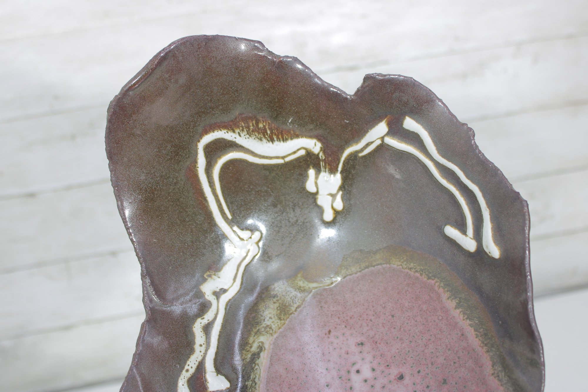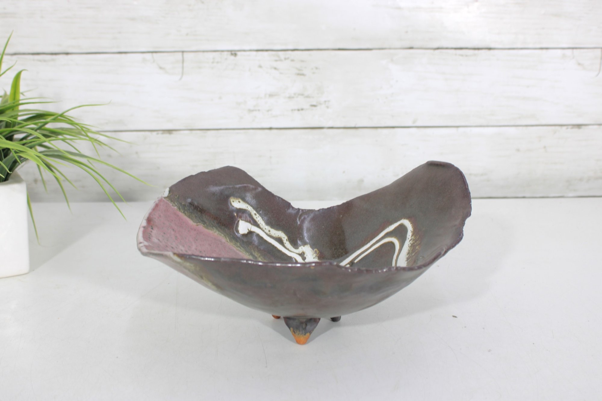 This sculptural piece has a hand-formed, asymmetrical silhouette with softly undulating edges and three small applied feet. The glaze features a rich combination of earthy brown tones with a contrasting pink interior section and flowing cream drip accents. The natural transitions between glaze colors create a unique, one-of-a-kind look.