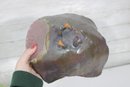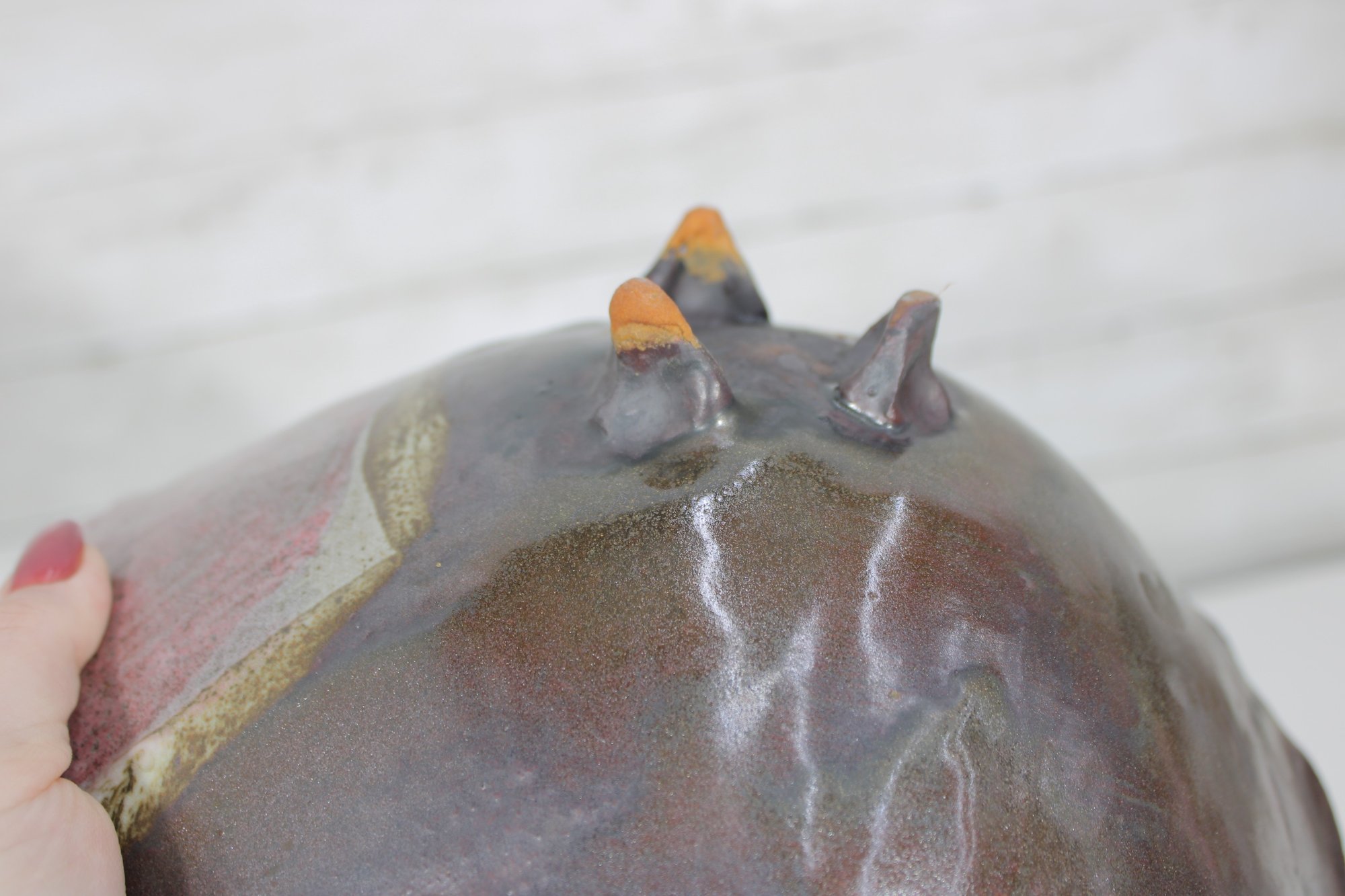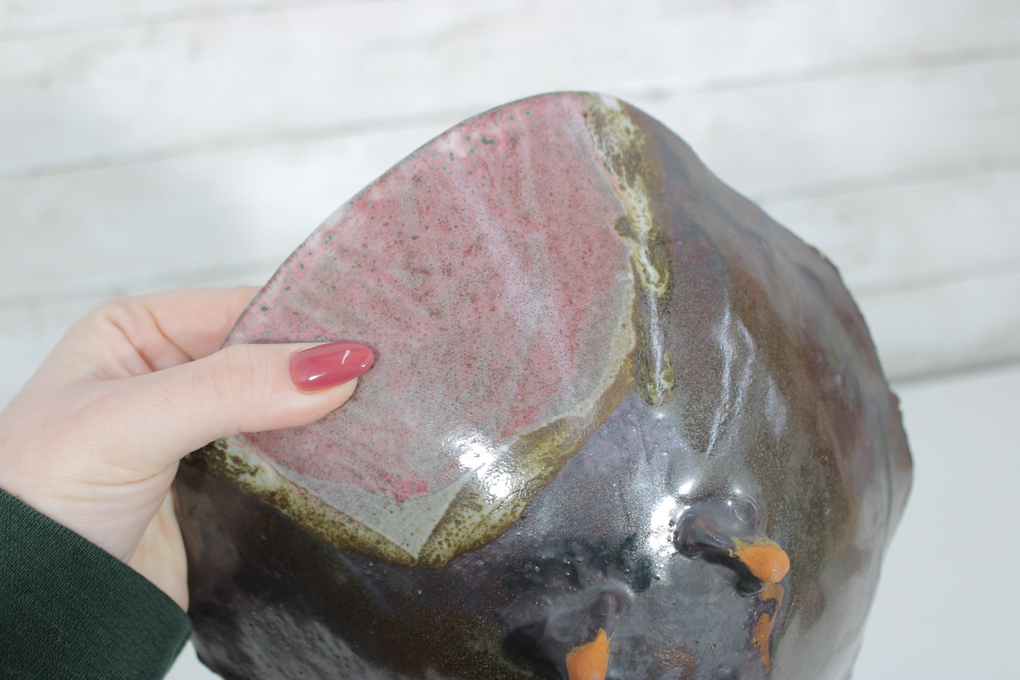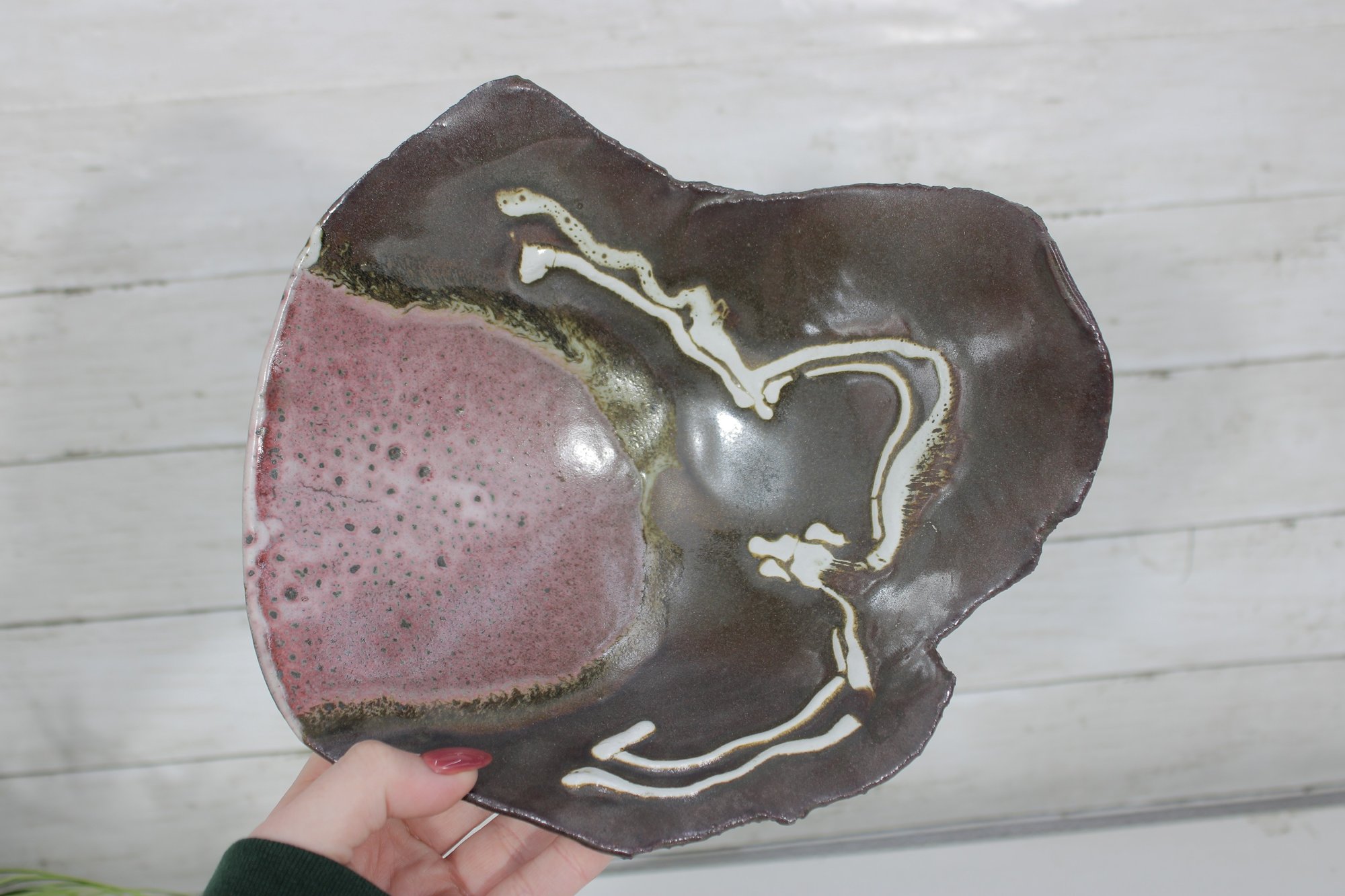 This sculptural piece has a hand-formed, asymmetrical silhouette with softly undulating edges and three small applied feet. The glaze features a rich combination of earthy brown tones with a contrasting pink interior section and flowing cream drip accents. The natural transitions between glaze colors create a unique, one-of-a-kind look.