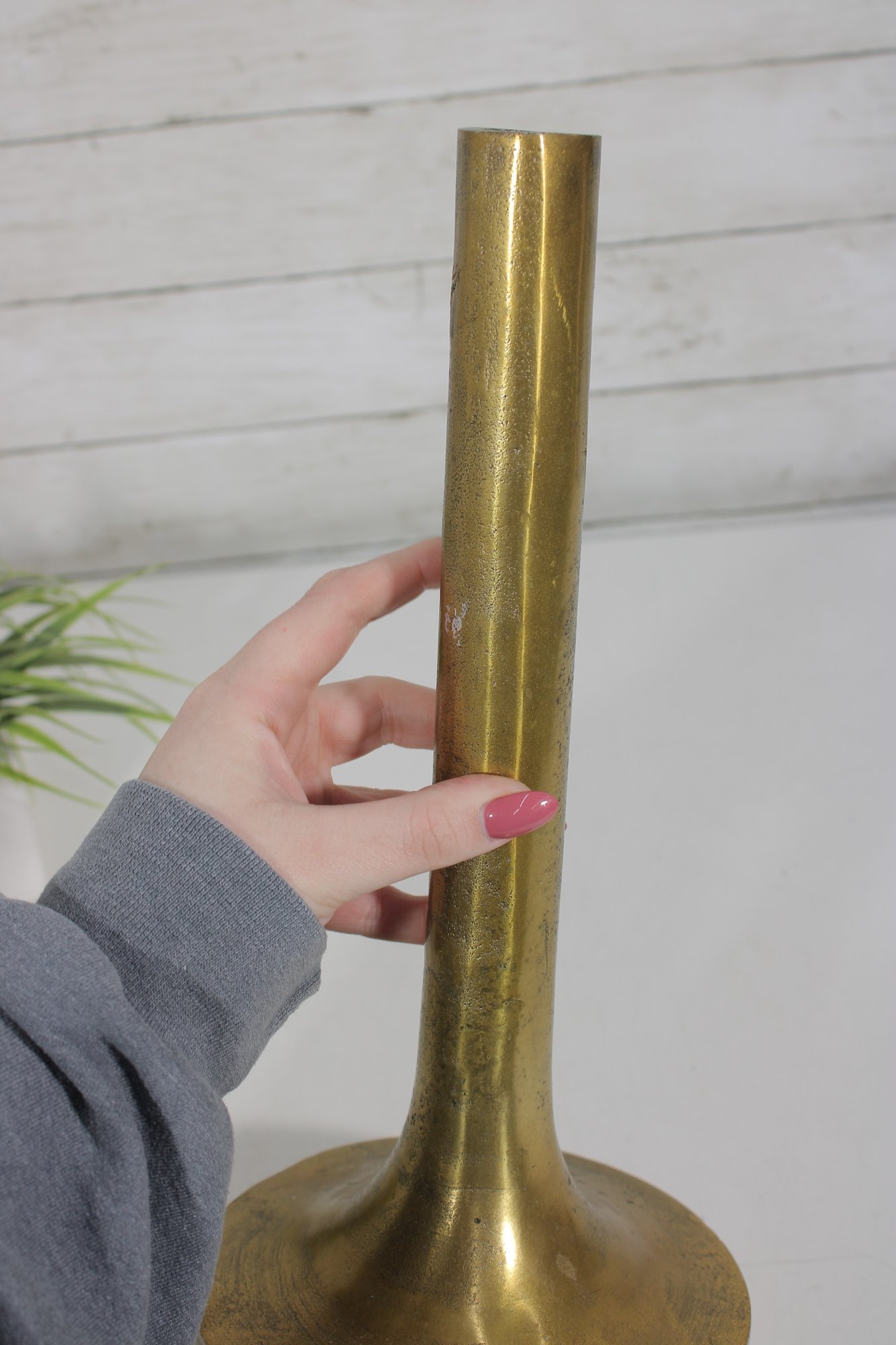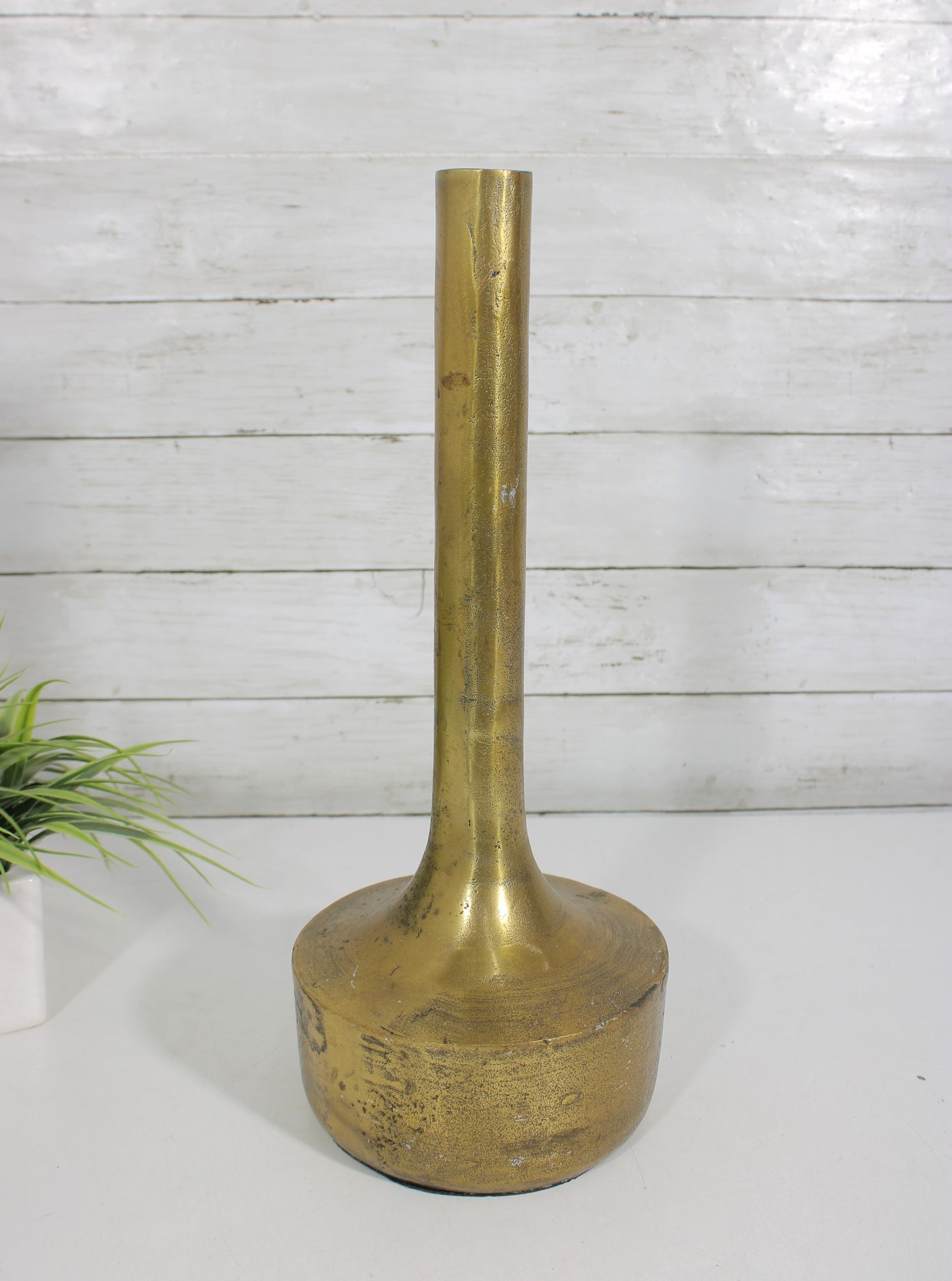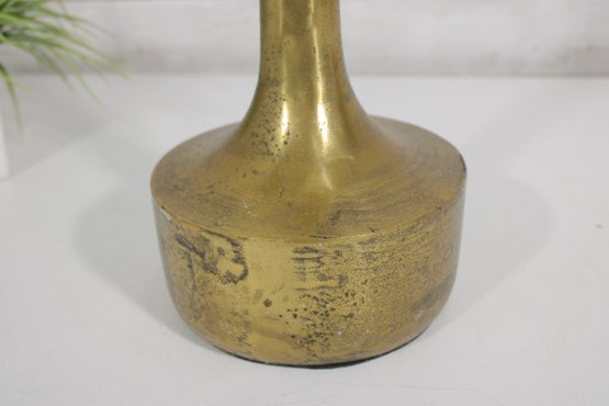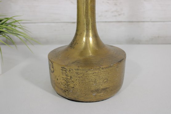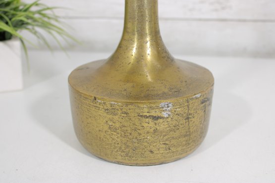 The vase has a warm brass finish with natural patina and surface variation, adding character and a timeworn appeal. Its simple yet elegant form makes it ideal for displaying as a standalone decorative object or for holding dried stems or decorative branches.