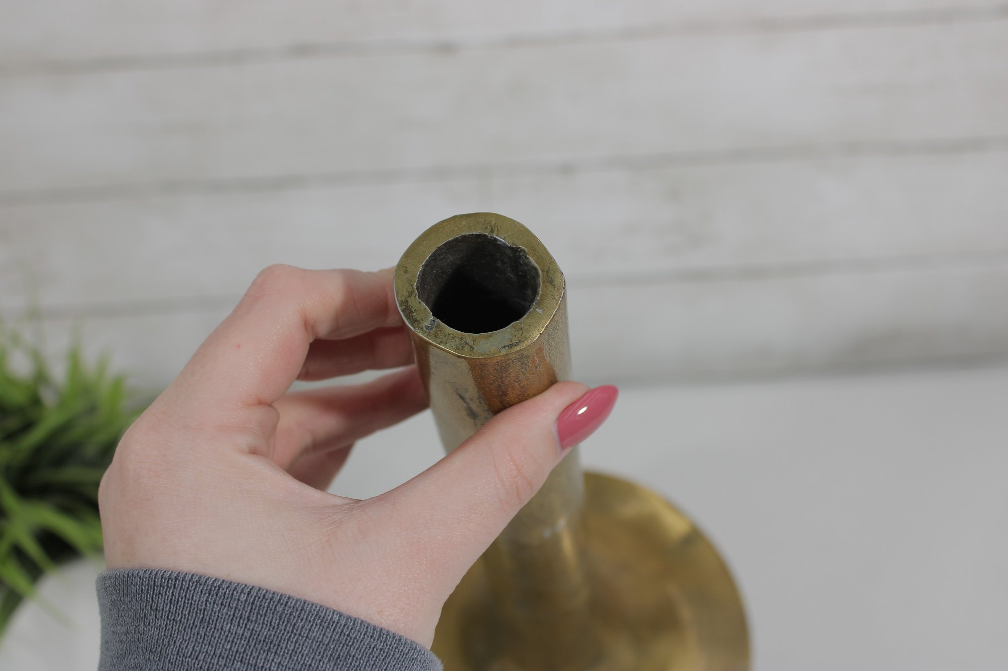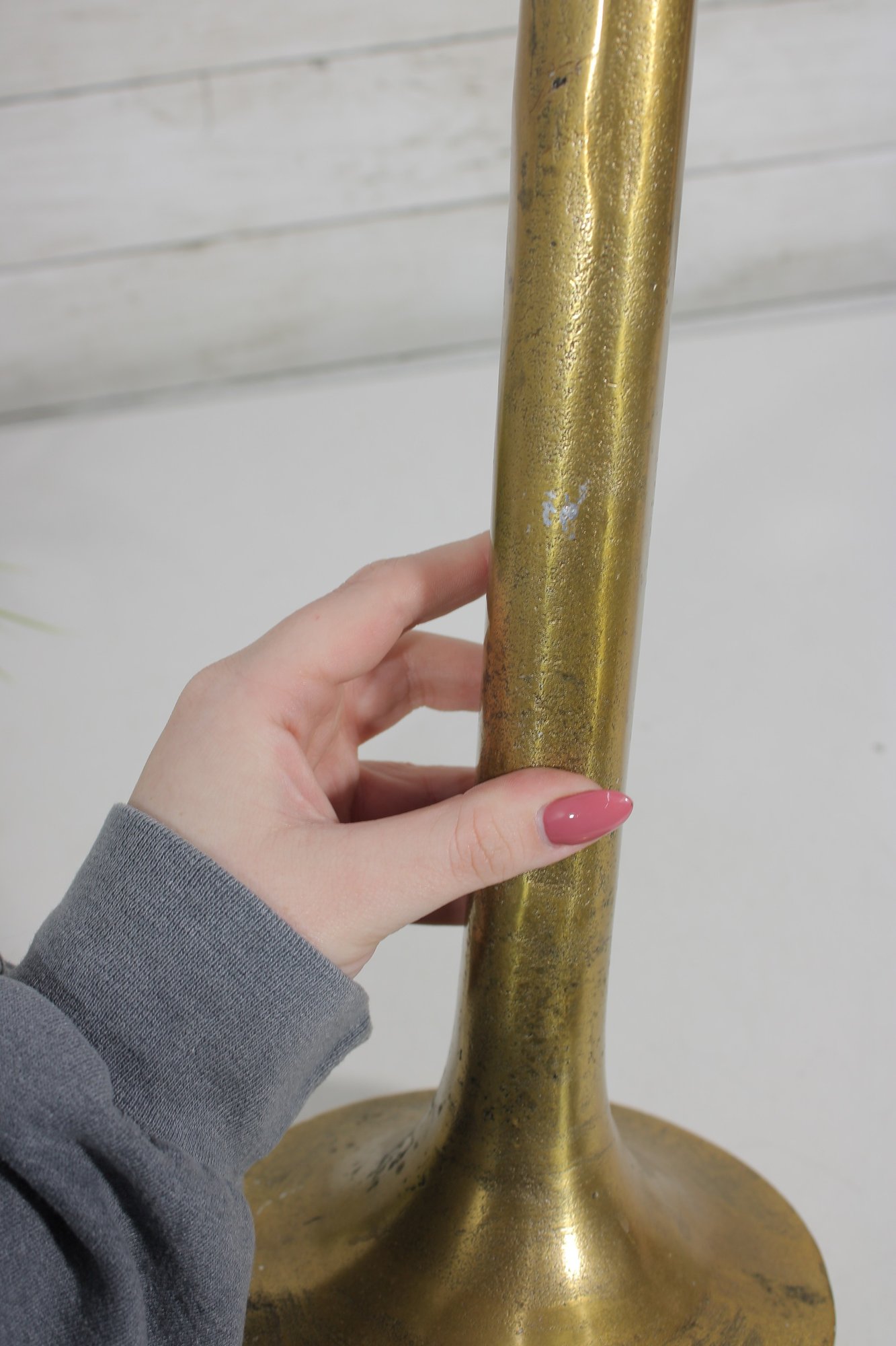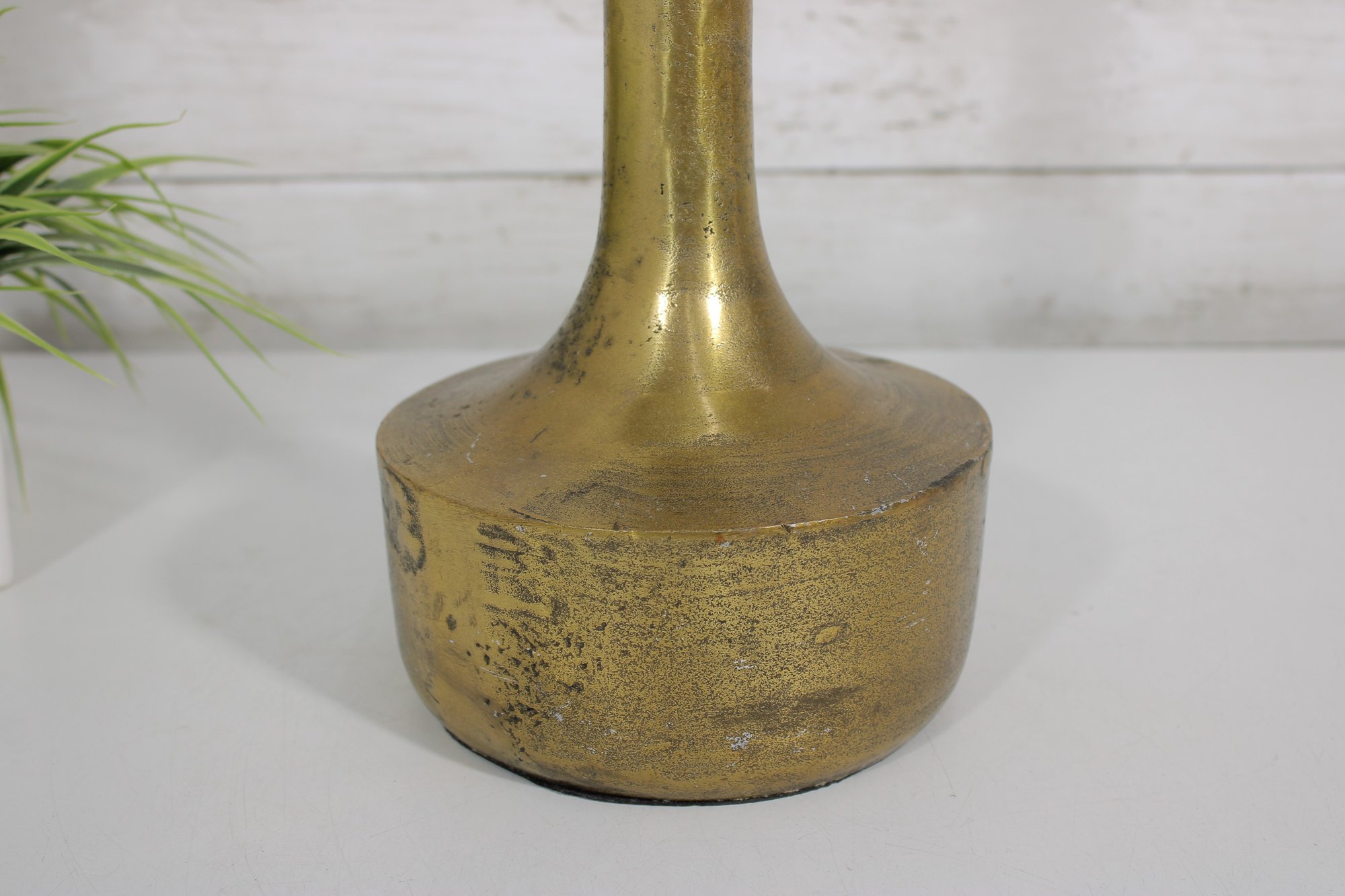 The vase has a warm brass finish with natural patina and surface variation, adding character and a timeworn appeal. Its simple yet elegant form makes it ideal for displaying as a standalone decorative object or for holding dried stems or decorative branches.