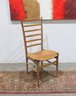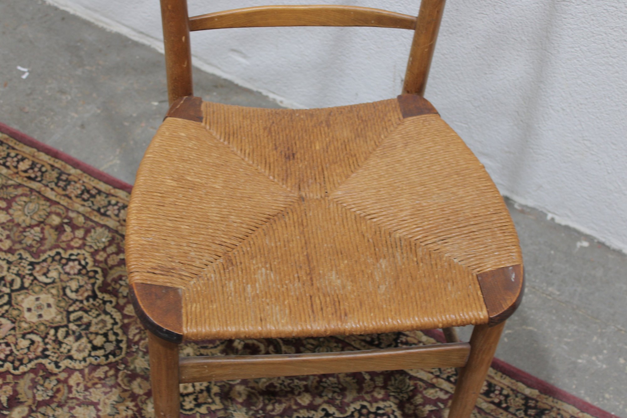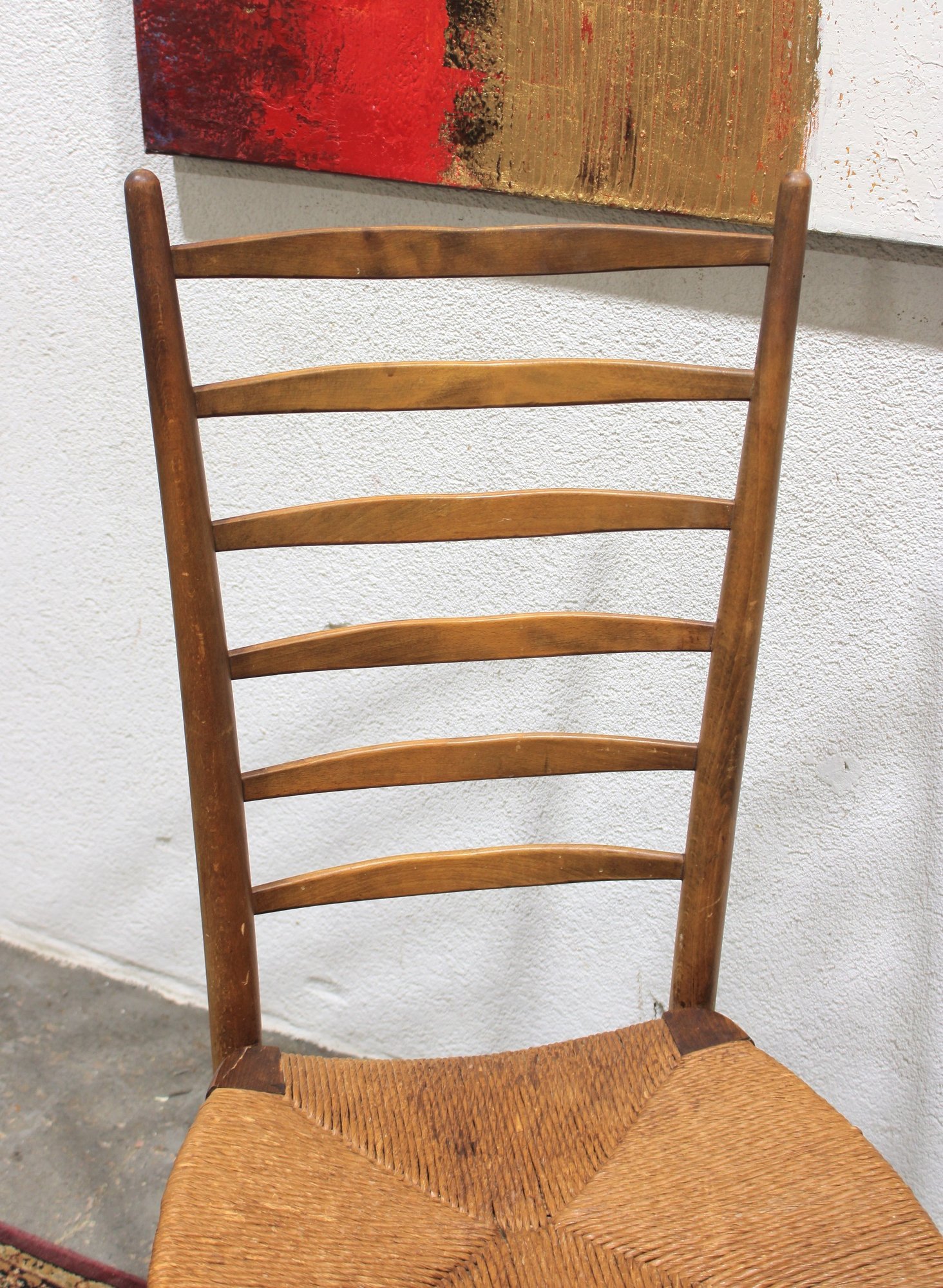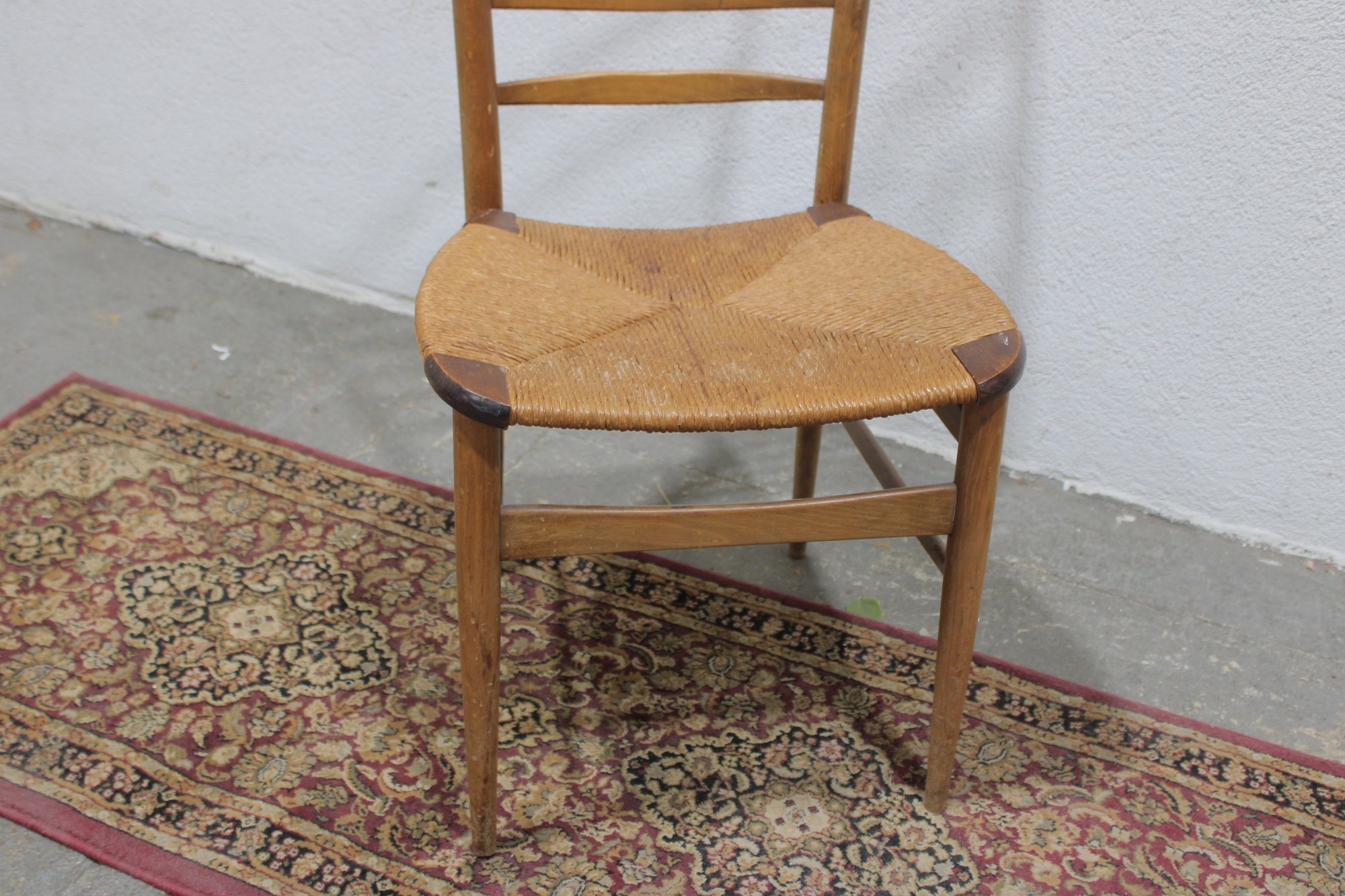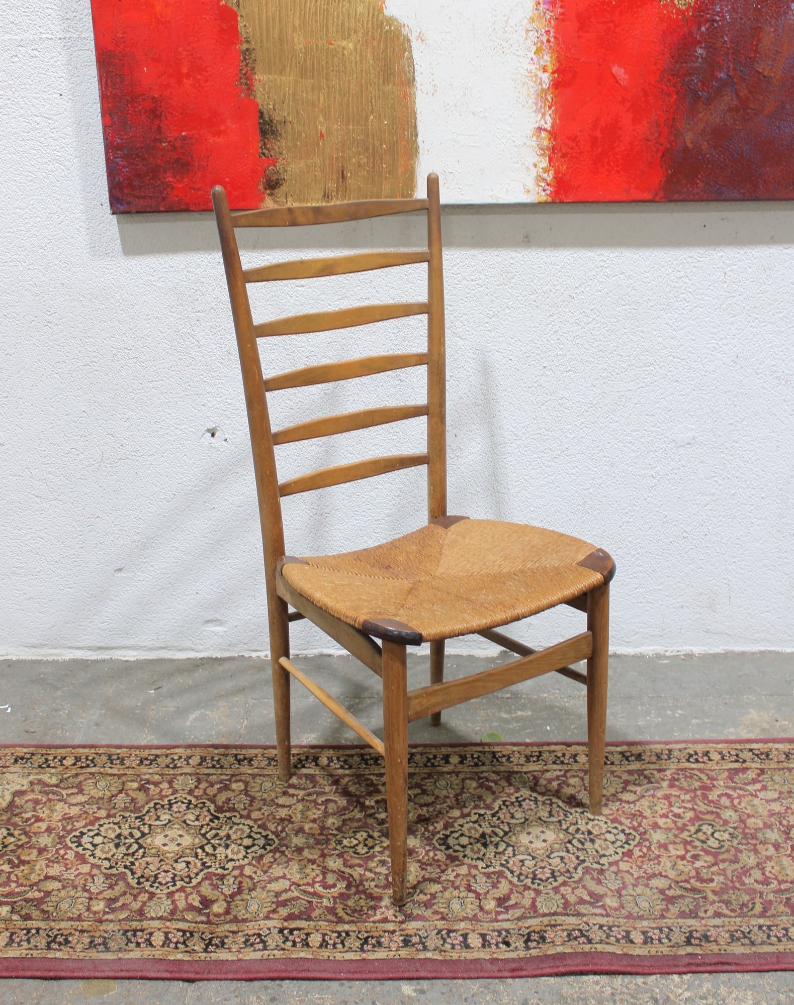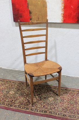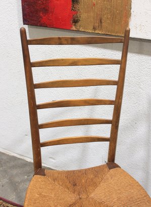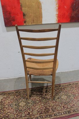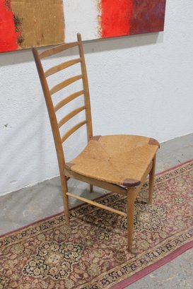 Classic ladder back dining chair featuring a warm wood frame and a traditional woven rush seat. The tall backrest with multiple horizontal slats creates a distinctive silhouette while offering comfortable support.