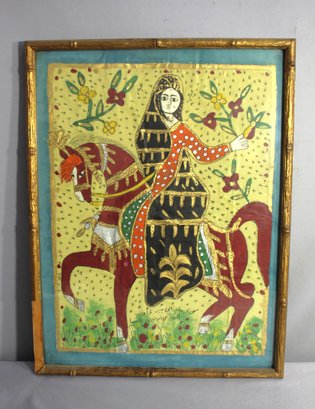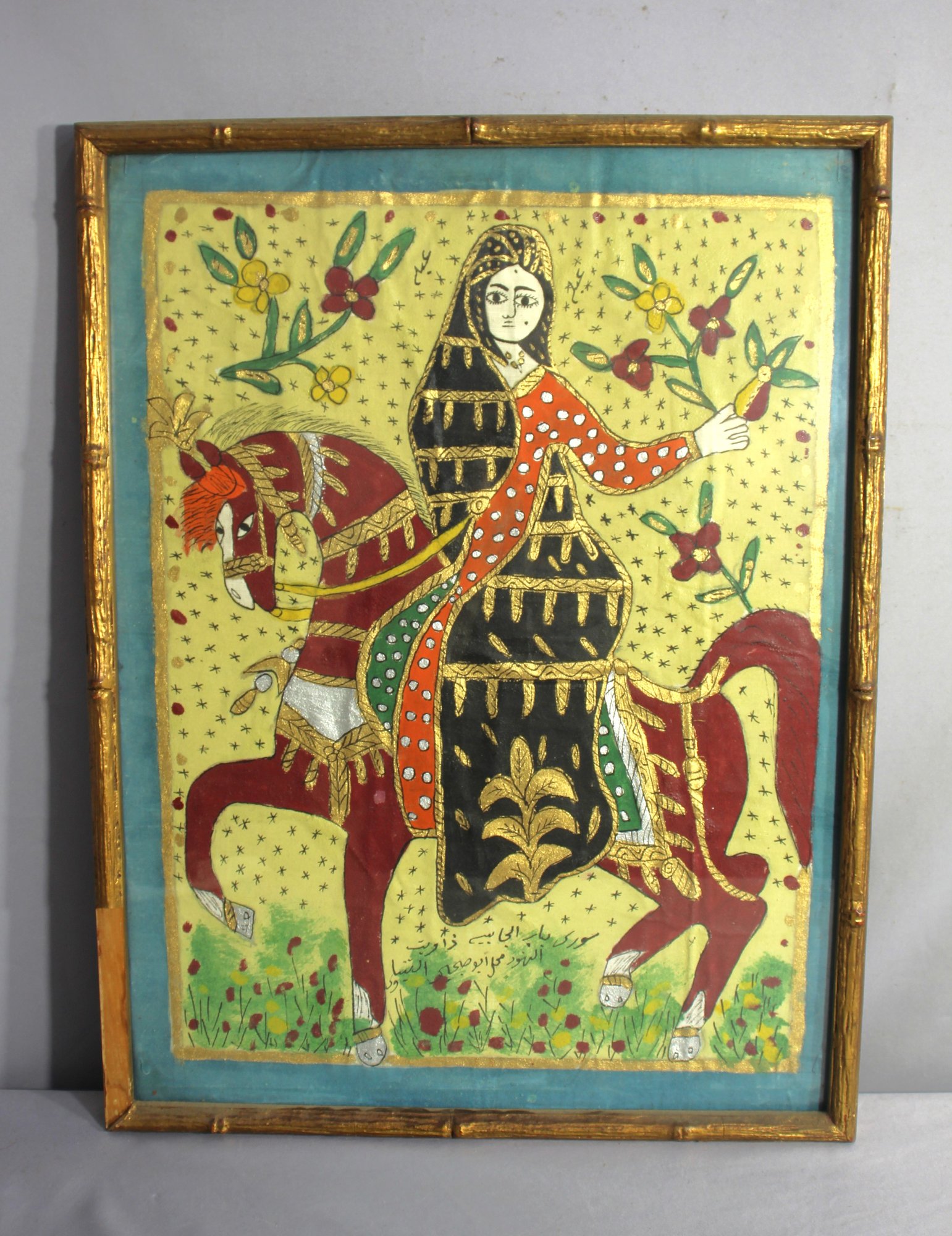 This captivating Middle Eastern églomisé portrait depicts a beautifully dressed woman on horseback, adorned with vibrant colors and intricate patterns. The reverse-painted glass technique highlights the fine details and craftsmanship of this unique artwork. The piece is set in an ornate golden frame that complements the vivid hues of the portrait. Perfect for collectors of Middle Eastern art or as a striking decorative piece for your home.